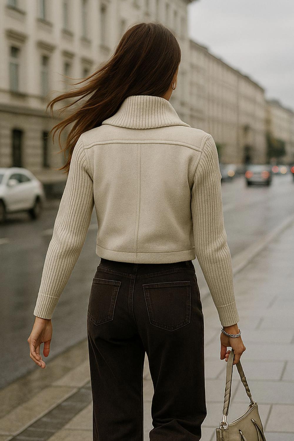 Chamarra corta de fit recto, cuello solapa y manga larga en canalé, bolsillos delanteros con vivos y cierre frontal con cremallera en contraste.