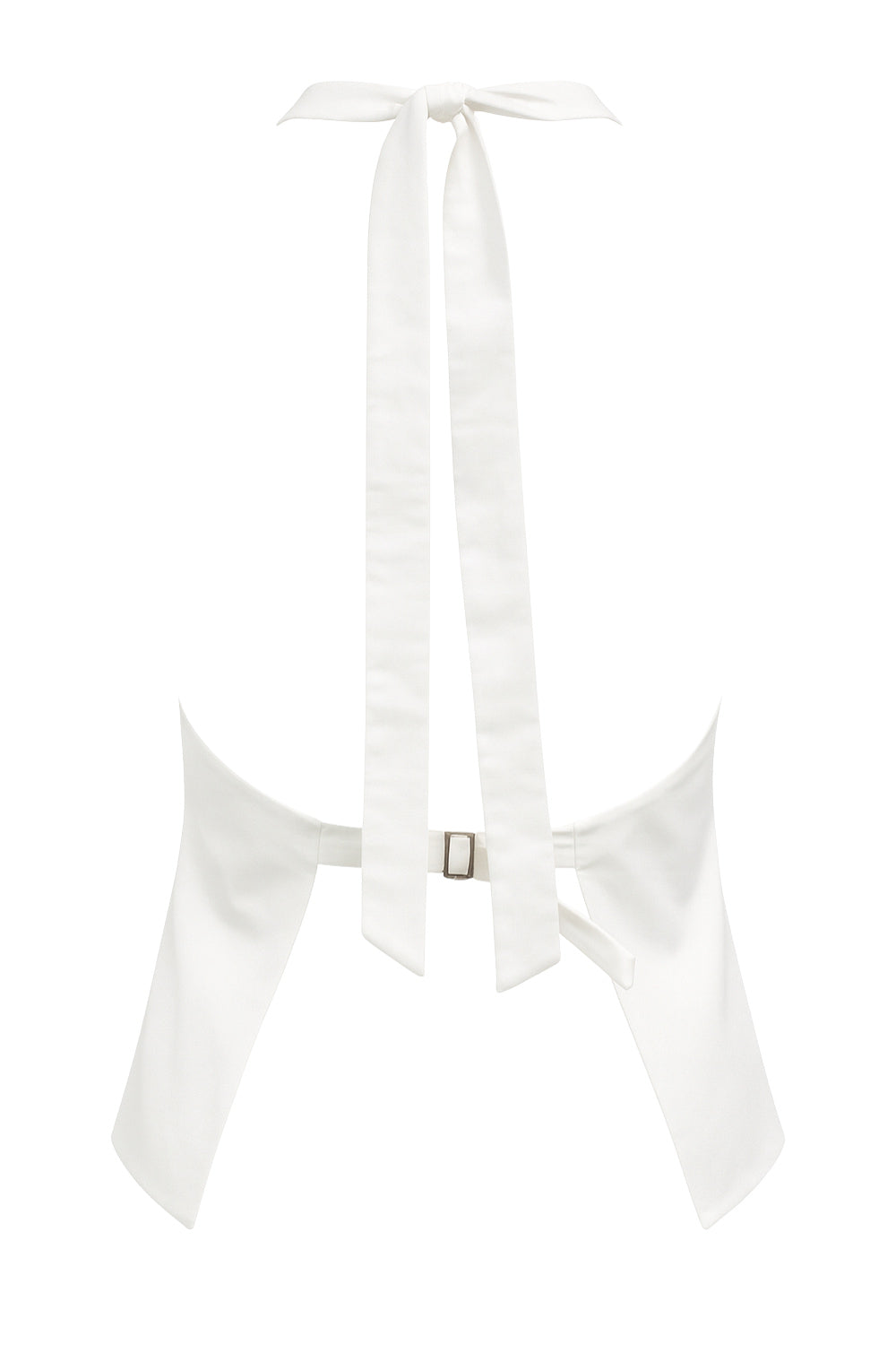 Blusa de fit fluido, cuello halter con nudo amarrable posterior, escote en espalda y cierre posterior con trabilla ajustable.