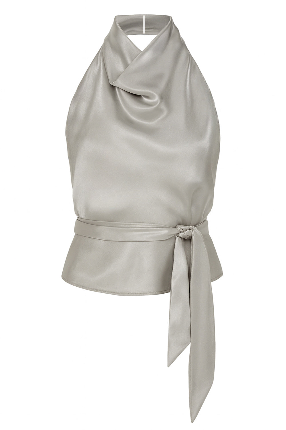 Blusa satinada de fit recto, halter con cuello fluido, sin mangas, lazo amarrable en cintura, cierre posterior con botón y ojal.