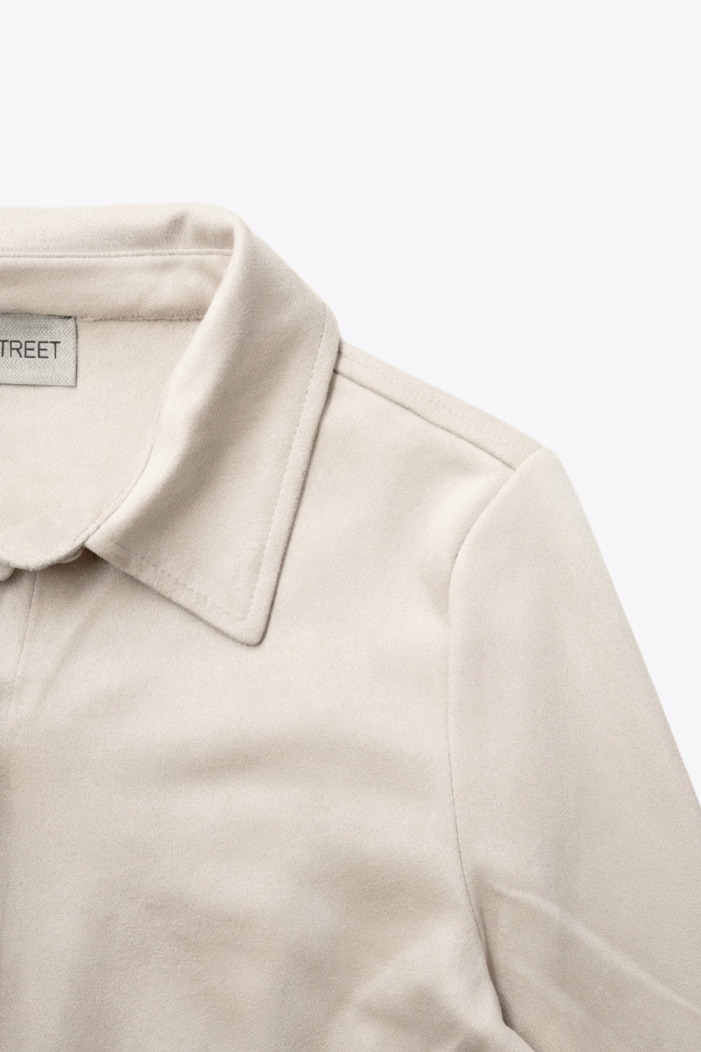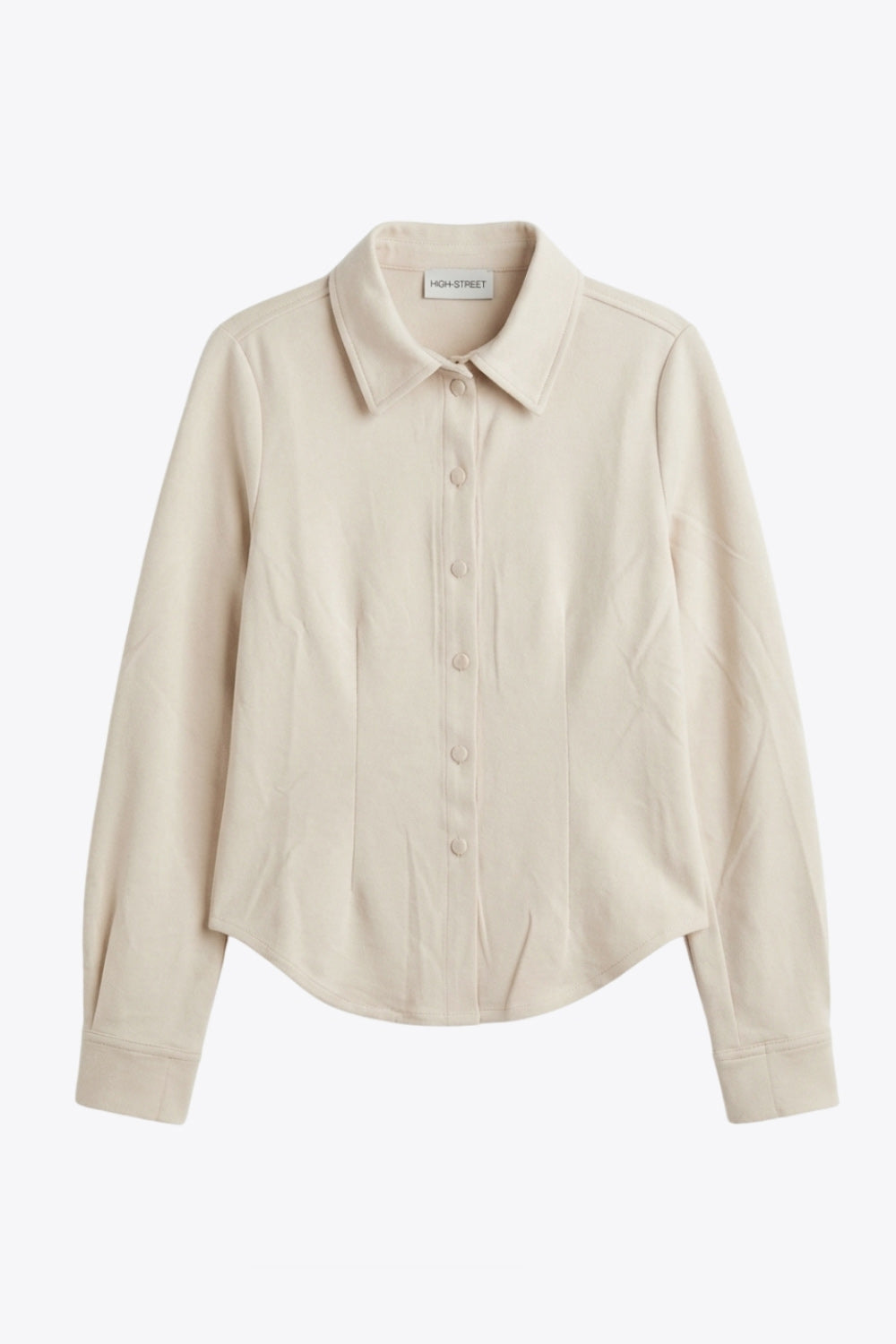 Camisa de gamuza, fit ajustado, cuello camisero, manga larga con puño abotonado, pinzas, bajo curveado y cierre frontal con hilera de botones.