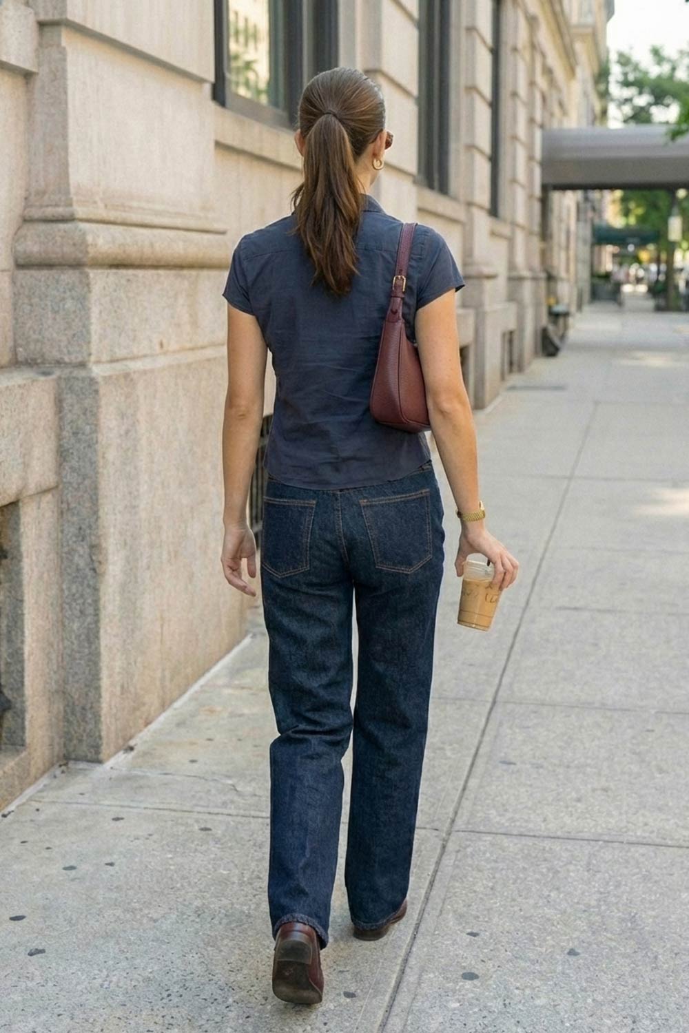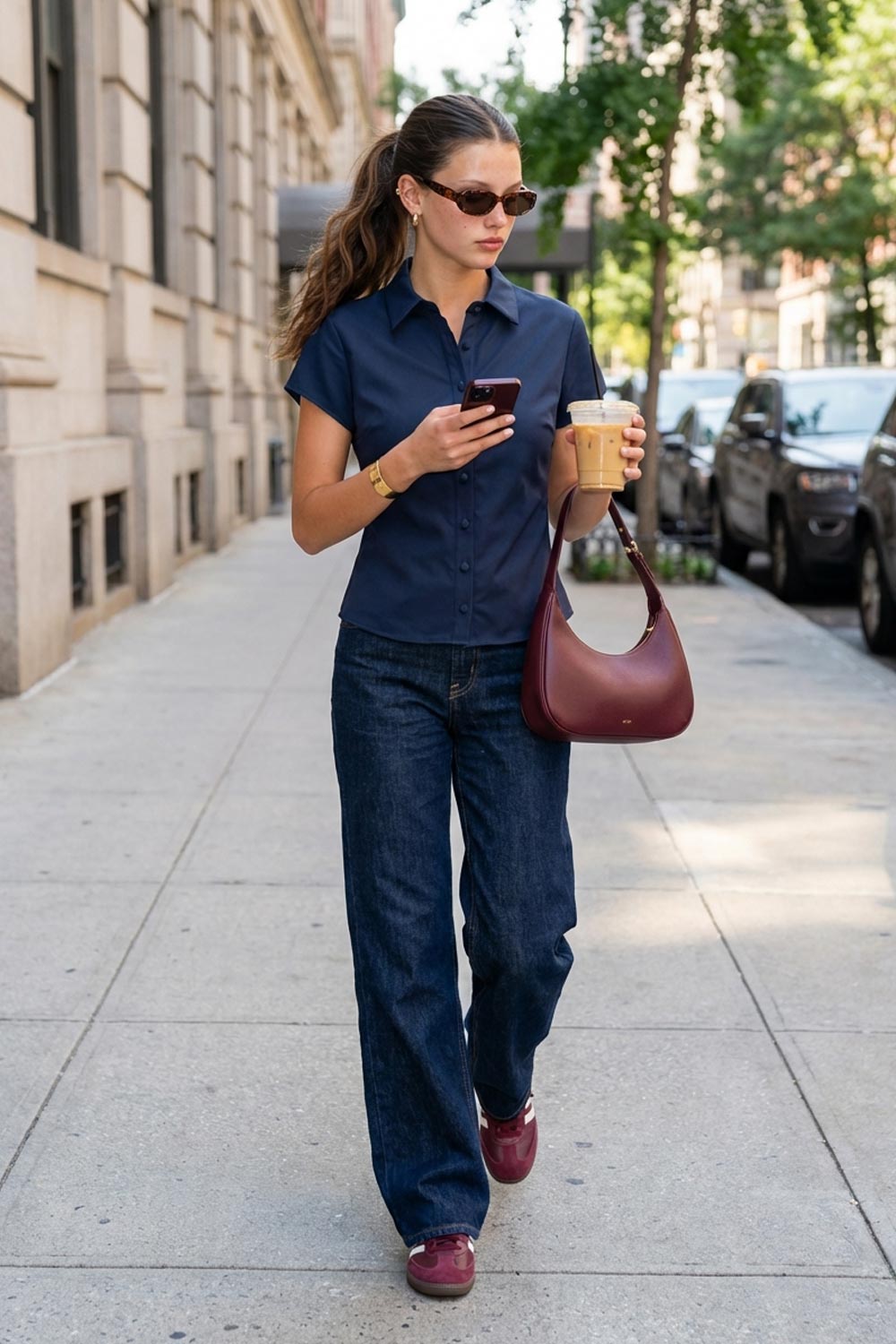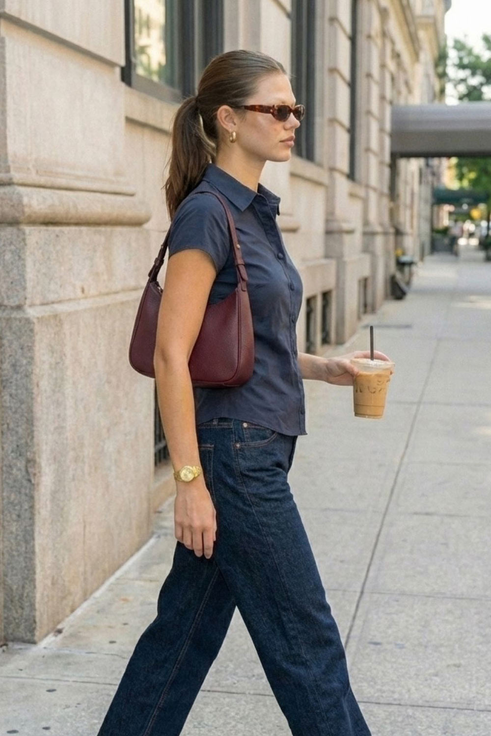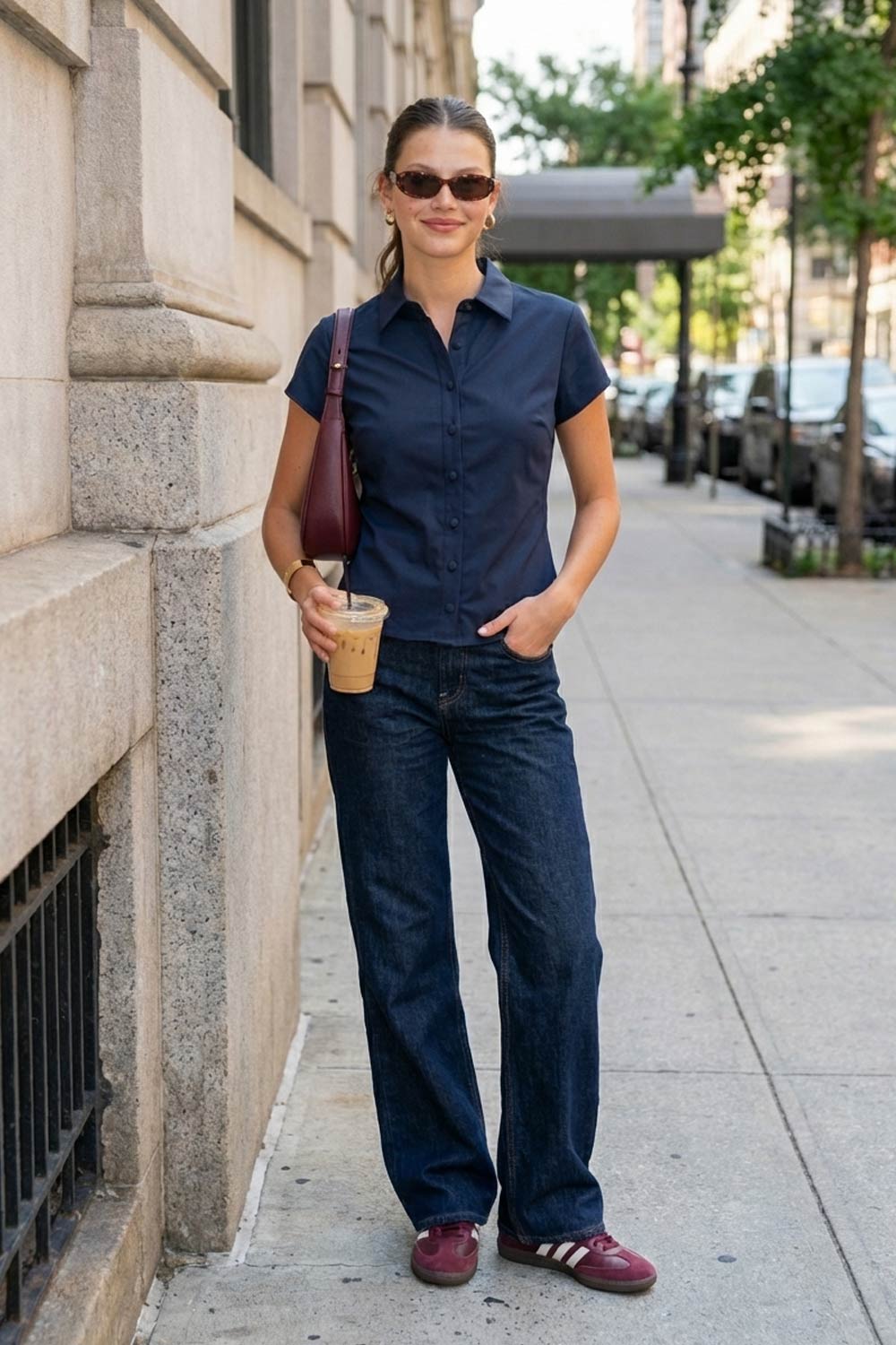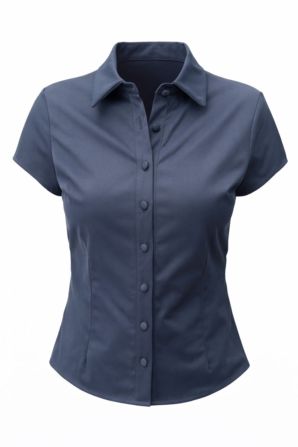 Camisa ajustada de cuello camisero, manga corta y cierre frontal con hilera de botones.