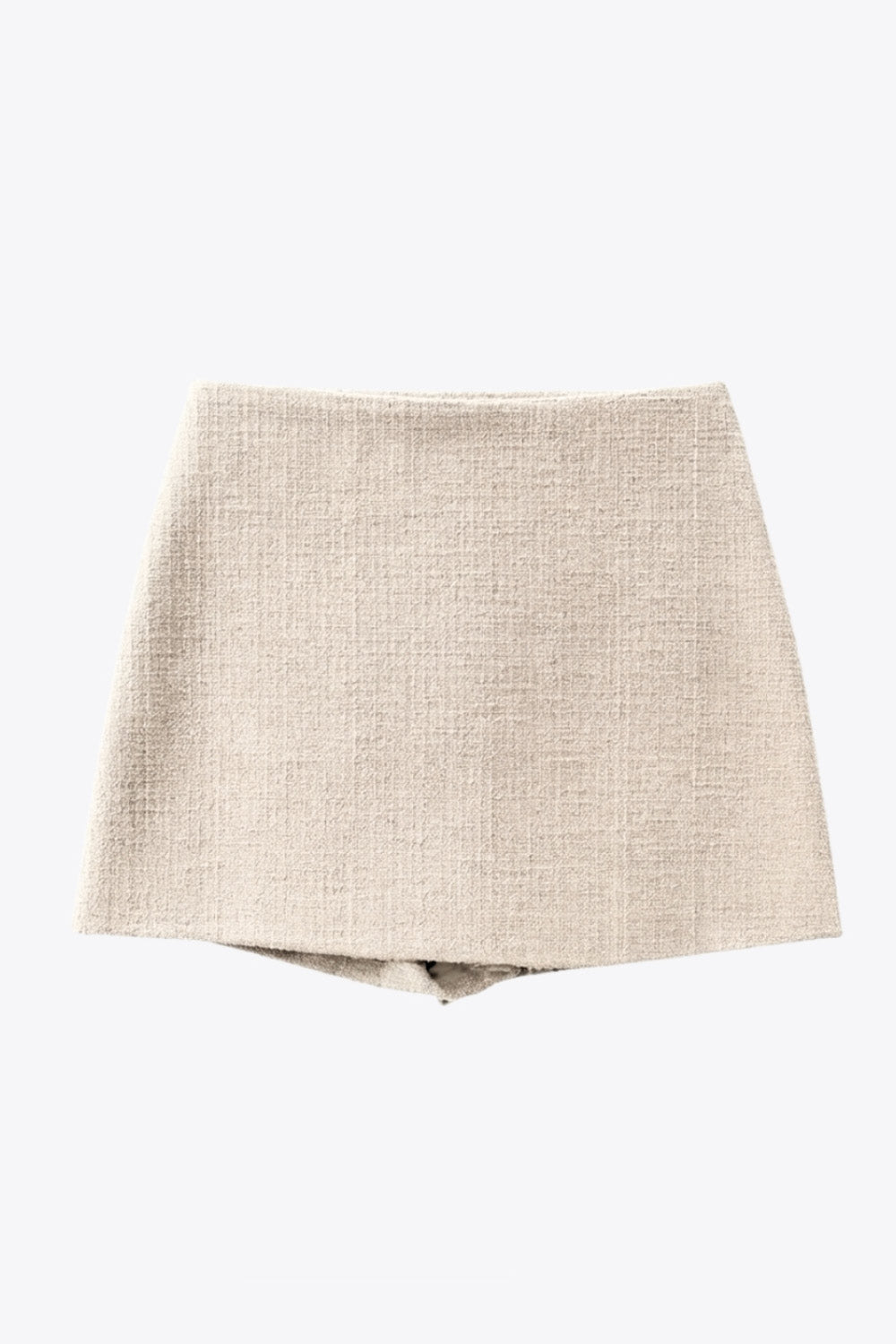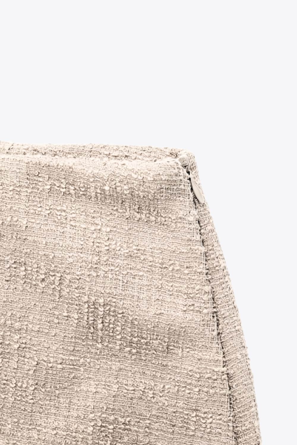 Falda short corto de bouclé, fit ajustado, cintura alta, vivos decorativos posteriores y cierre lateral con cremallera oculta.