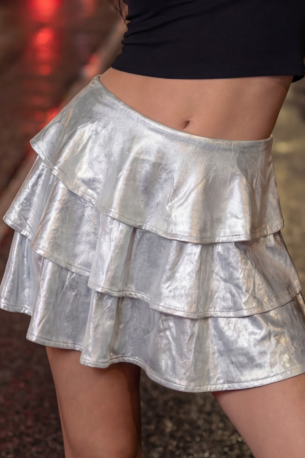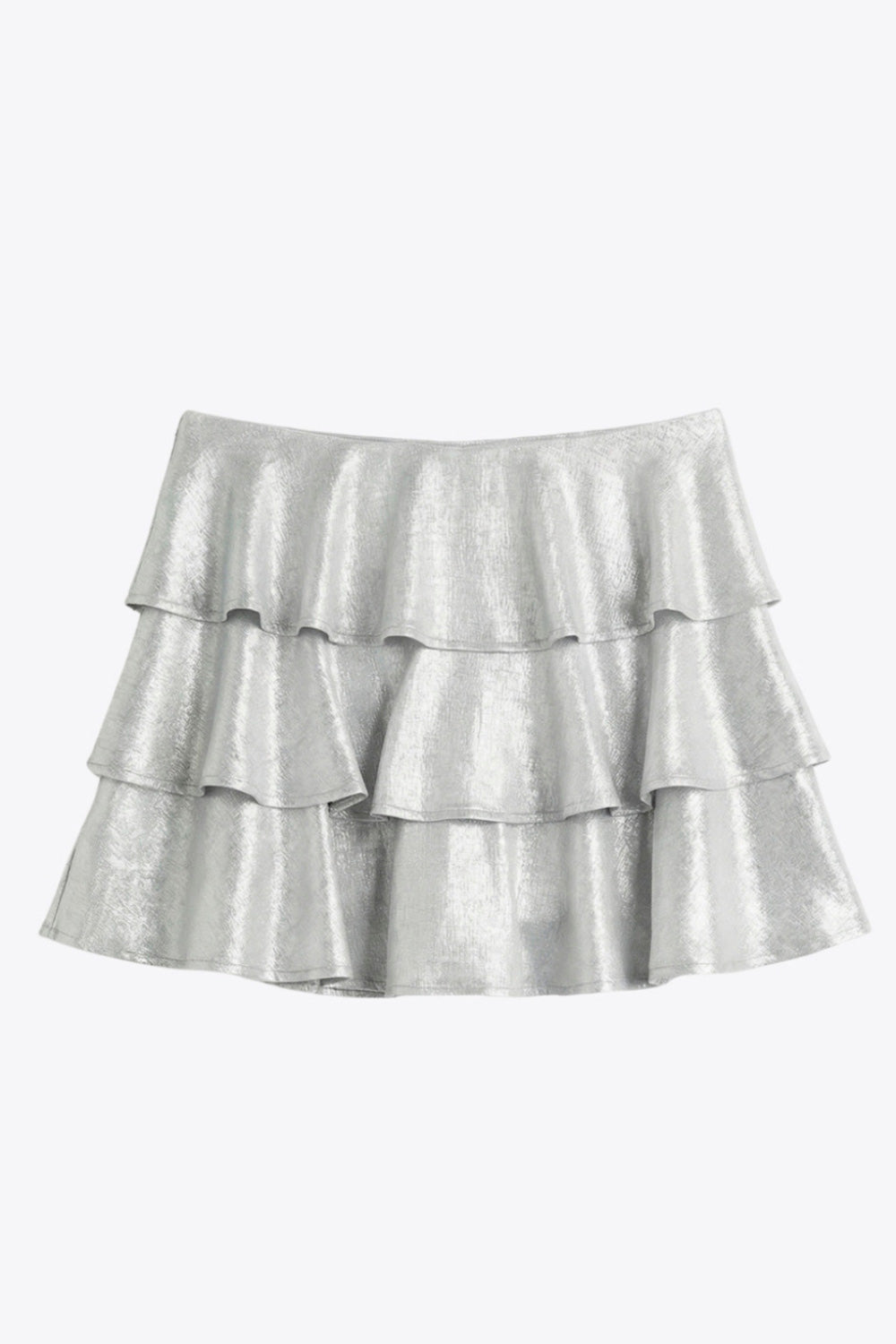 Falda short corto de cintura alta, corte en a y bajo con capas de olanes. Cierre lateral con cremallera oculta.