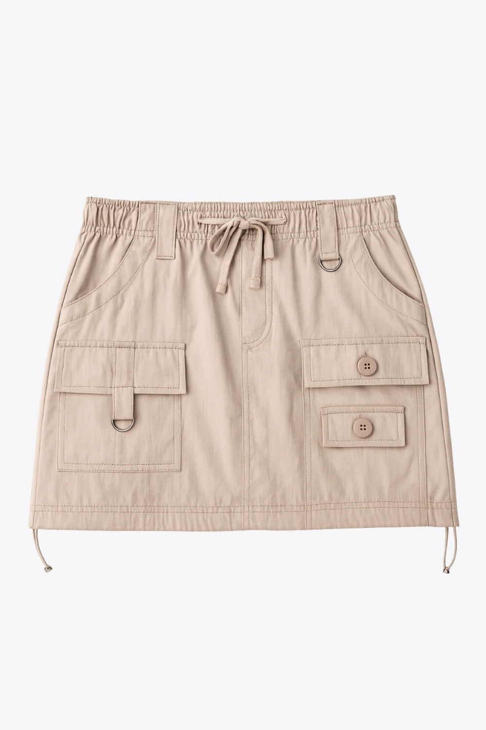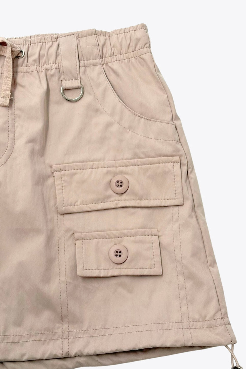Falda corta cargo de fit ajustado, cintura alta con pretina elástica, jareta frontal ajustable, trabillas con argolla decorativa frontal, bolsillos delanteros, posterior decorativo con cartera y frontales cargo con cartera, botón y trabilla. Detalle de jaretas elásticas ajustables en bajo.
