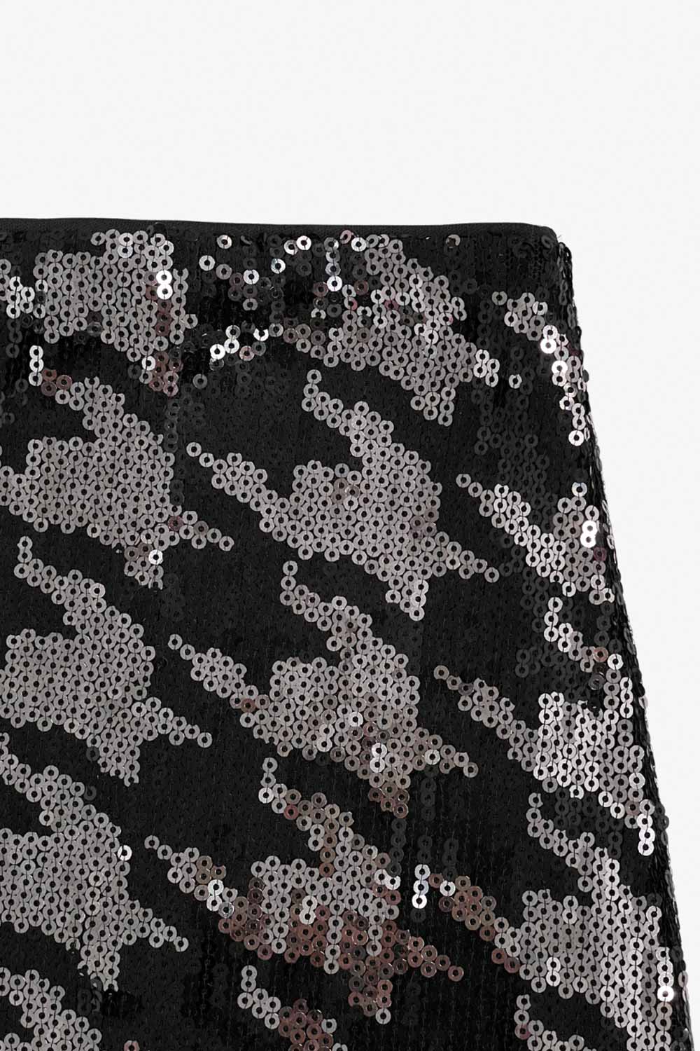 Falda corta de lentejuelas, estampado pata de gallo, fit ajustado, cintura alta y cierre lateral con cremallera oculta.