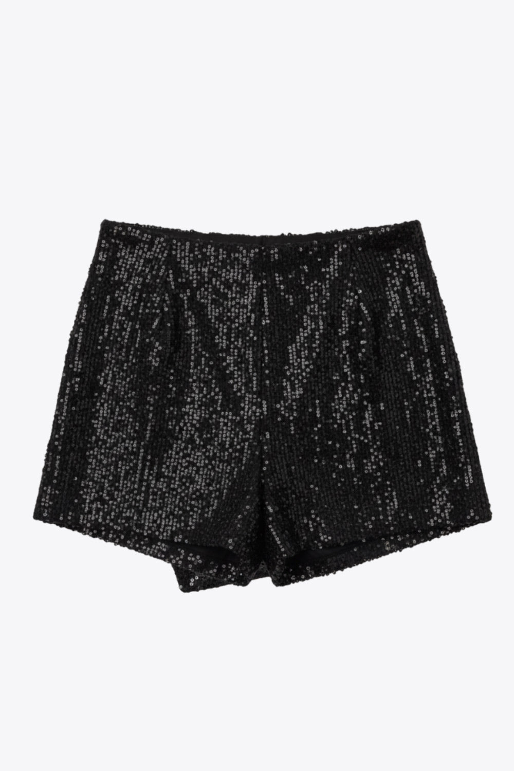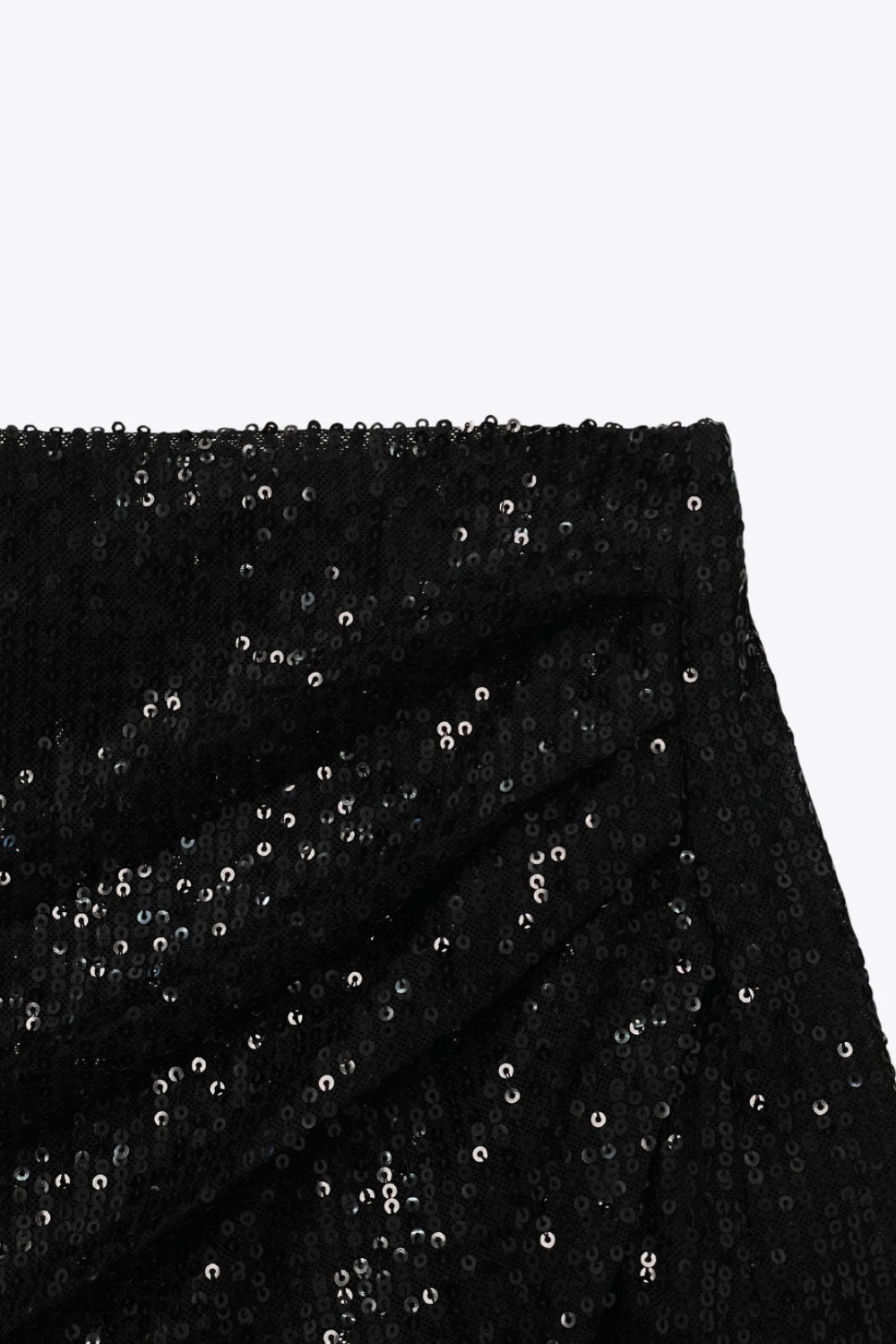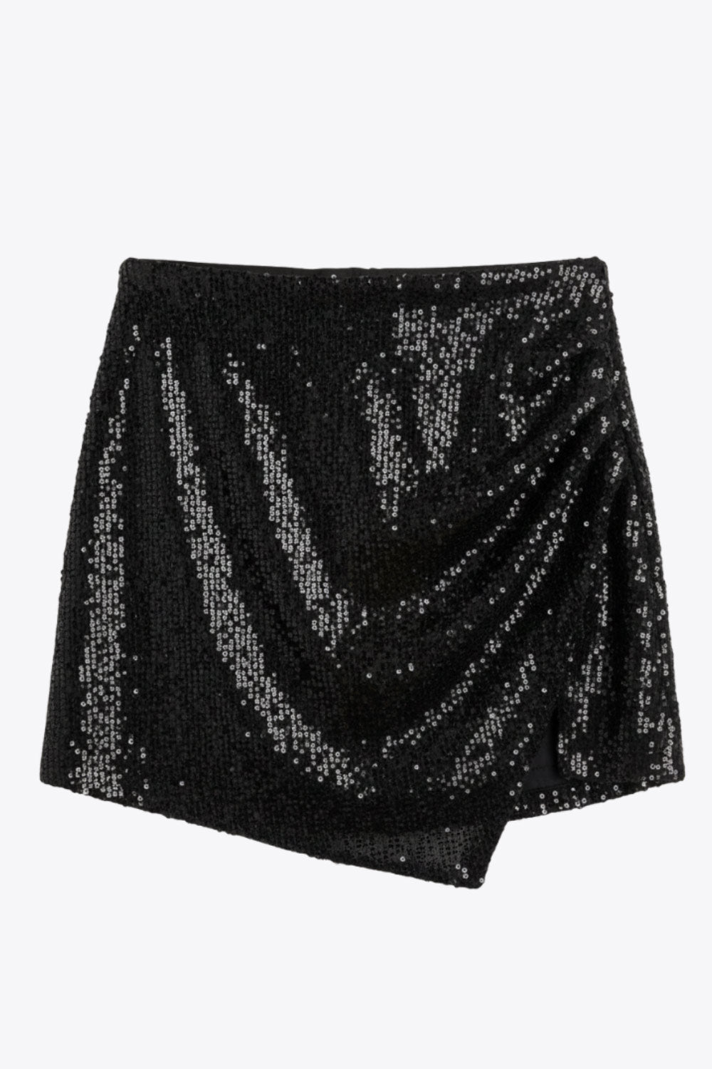 Falda short corto de lentejuelas, fit ajustado, cintura alta, cruce frontal con bajo asimétrico y plisados laterales.