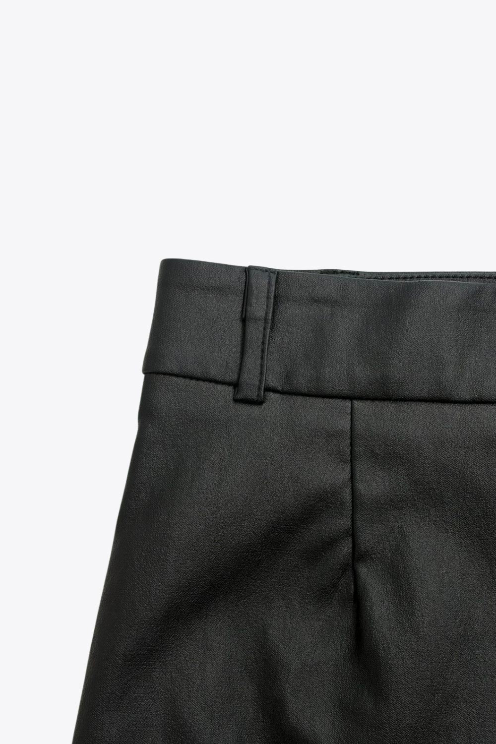 Falda short corto de fit ajustado, cintura alta con pretina y trabillas, bolsillos delanteros, cierre frontal con broche y cremallera ocultos.