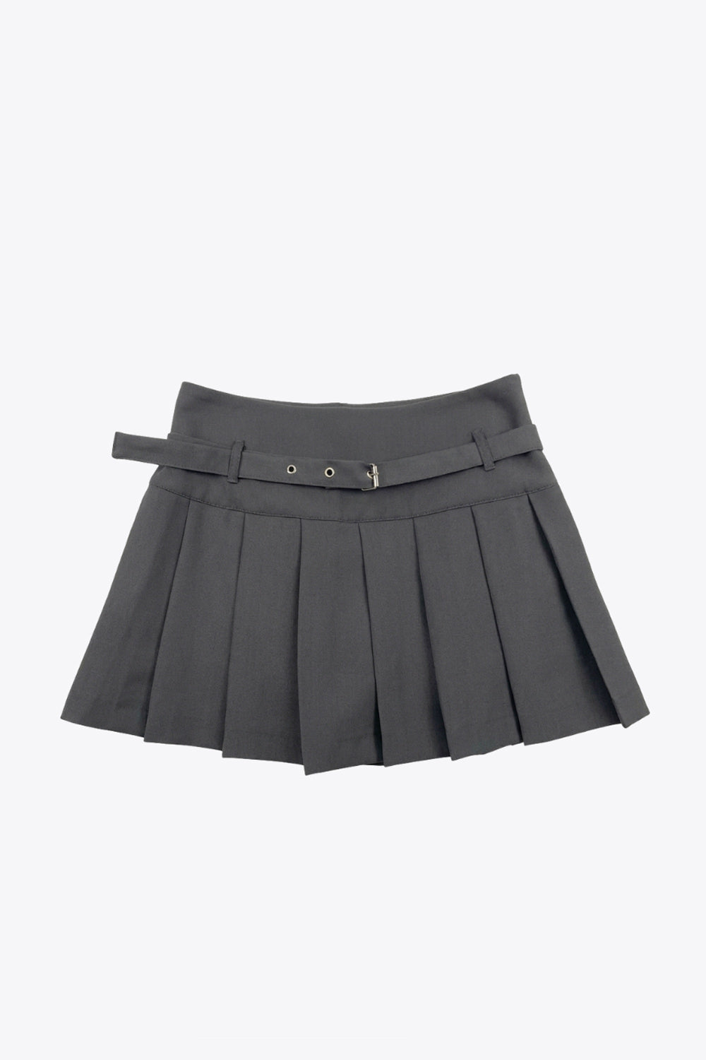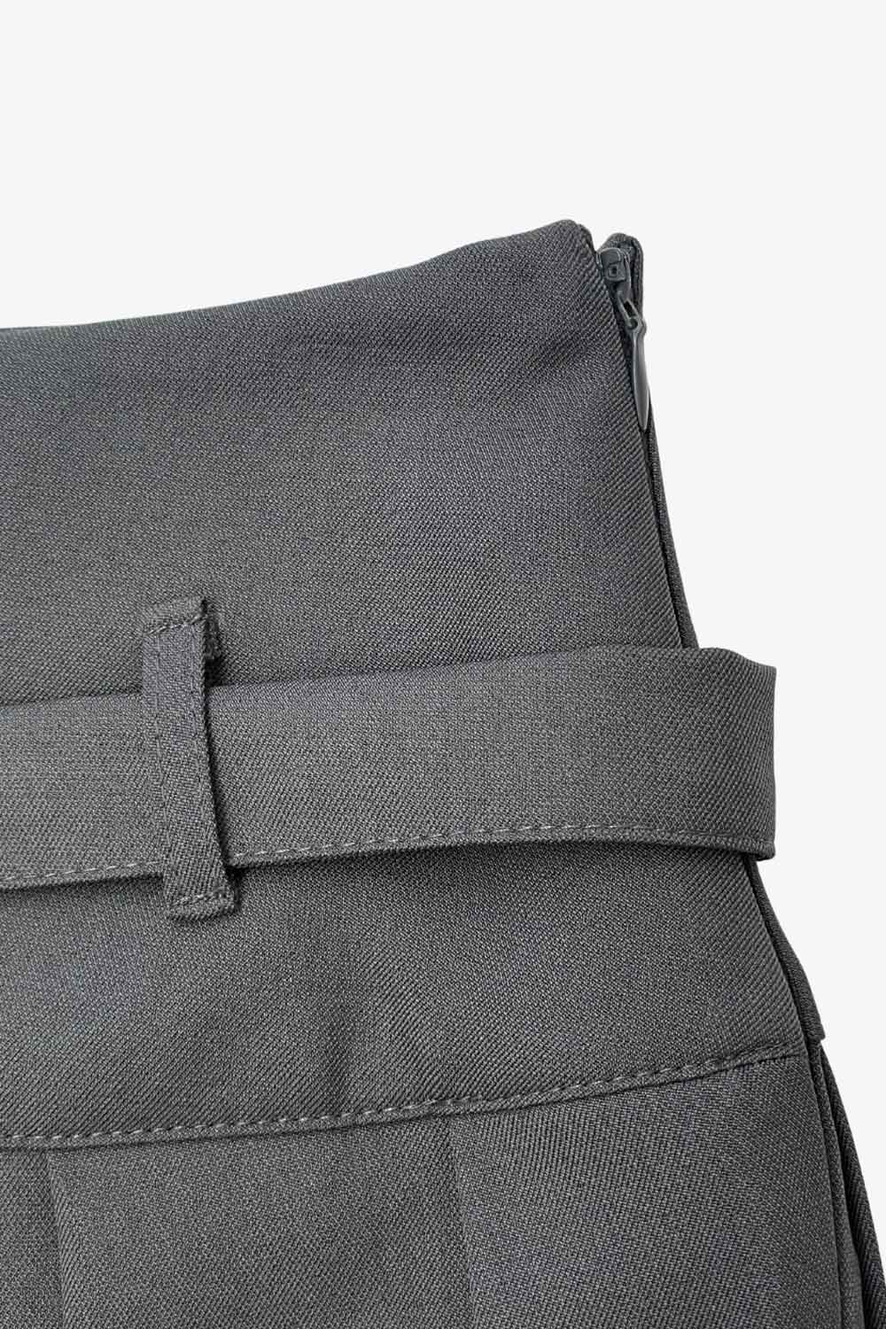 Falda short corto tableado, de cintura alta con pretina ancha, trabillas y cinturón del mismo tejido con hebilla en contraste. Cierre lateral con cremallera oculta.