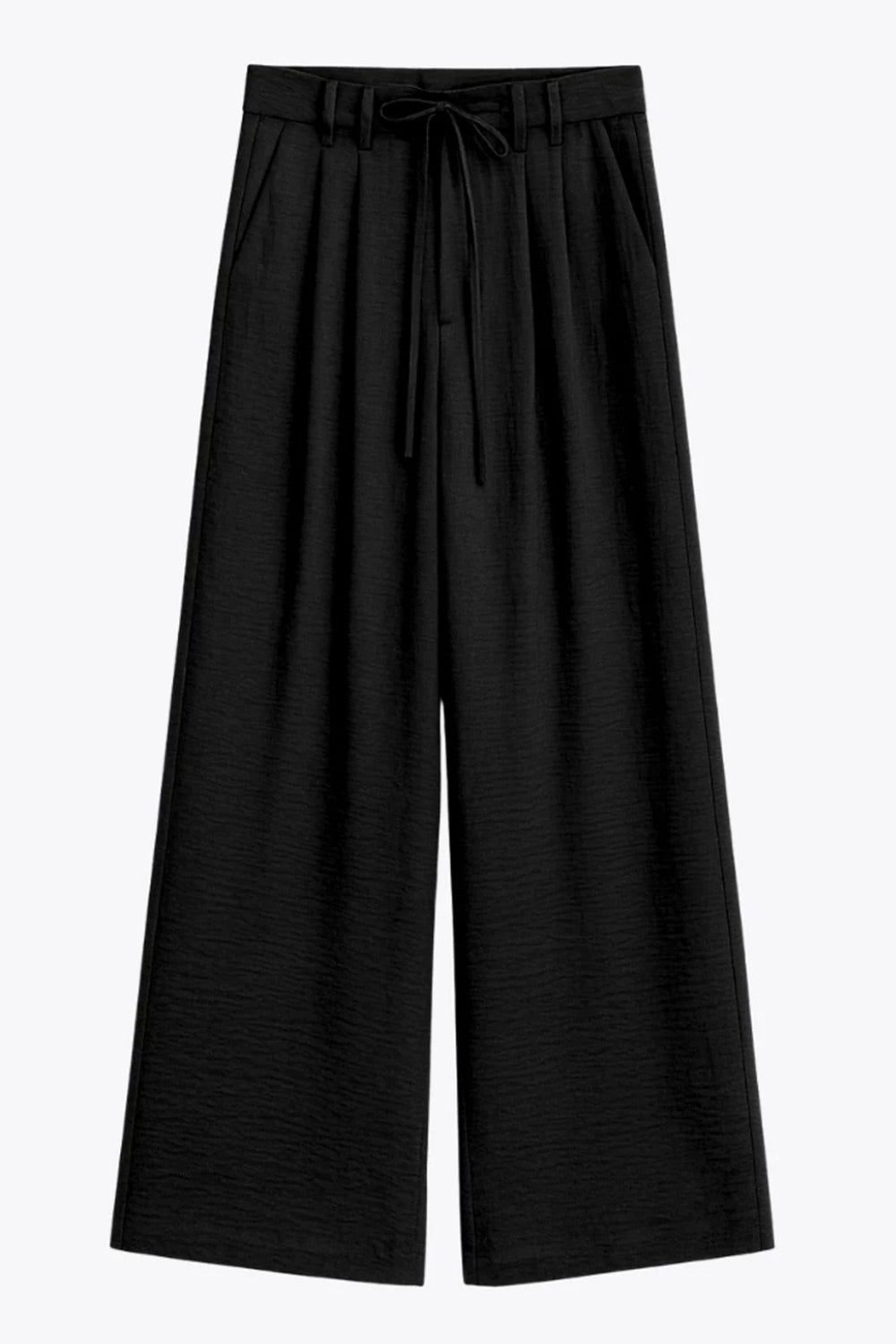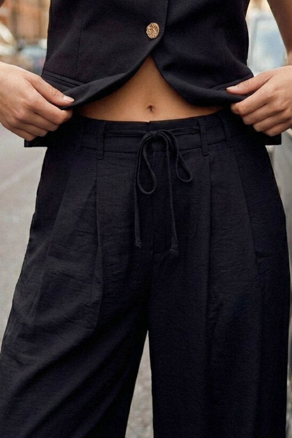 Pantalón de fit recto, pinzas frontales, cintura alta con pretina y trabillas, bolsillos delanteros, vivo decorativo posterior, cierre frontal con broche y cremallera ocultos. Detalle de jareta frontal ajustable en cintura.