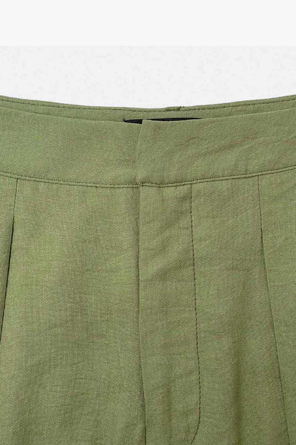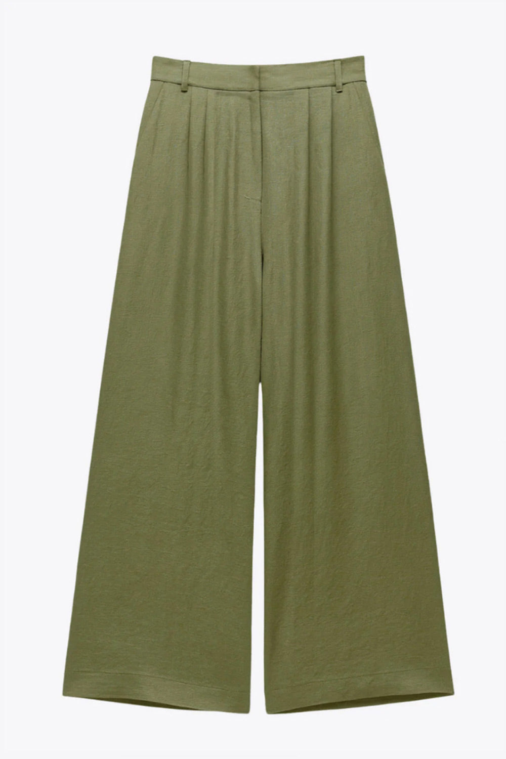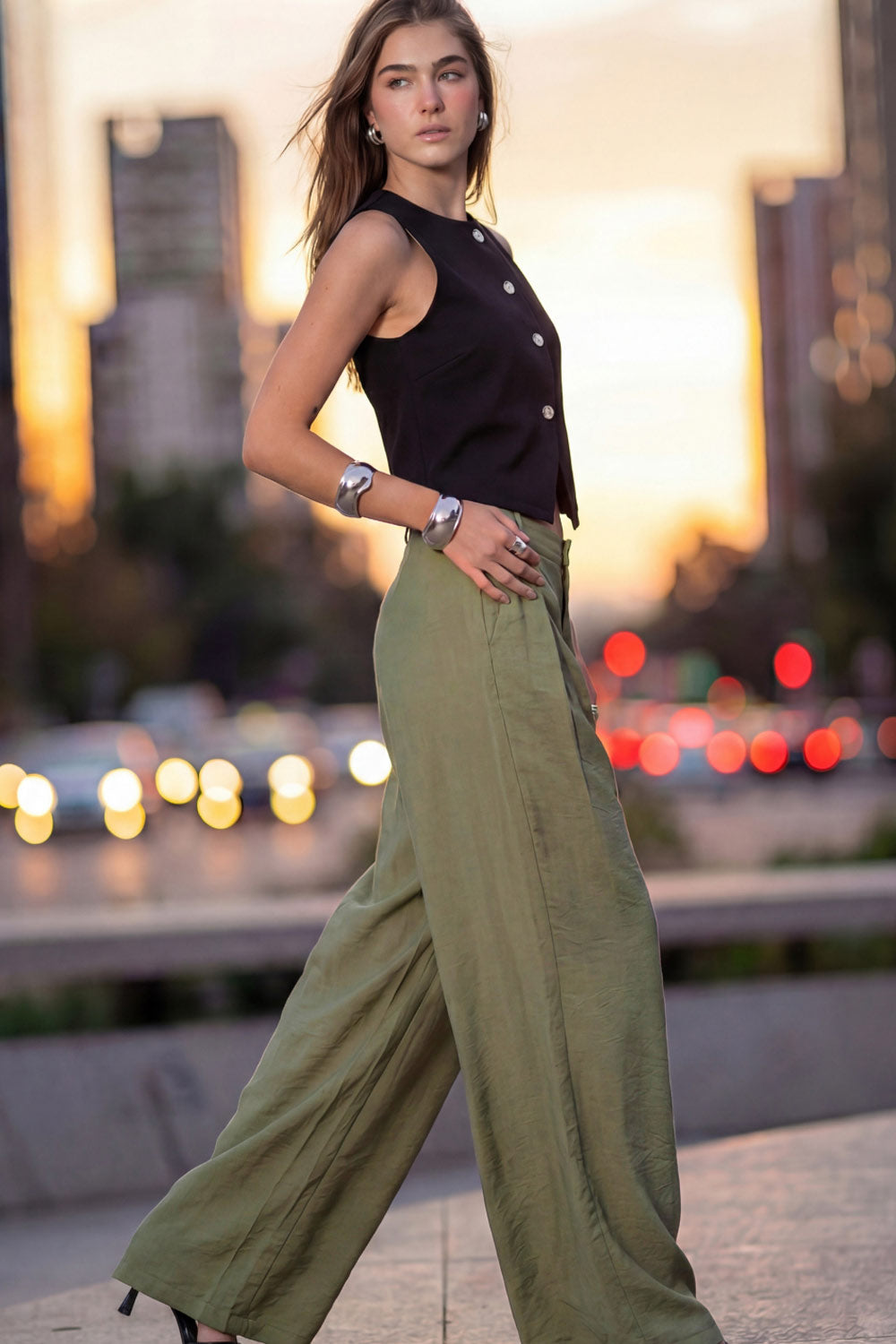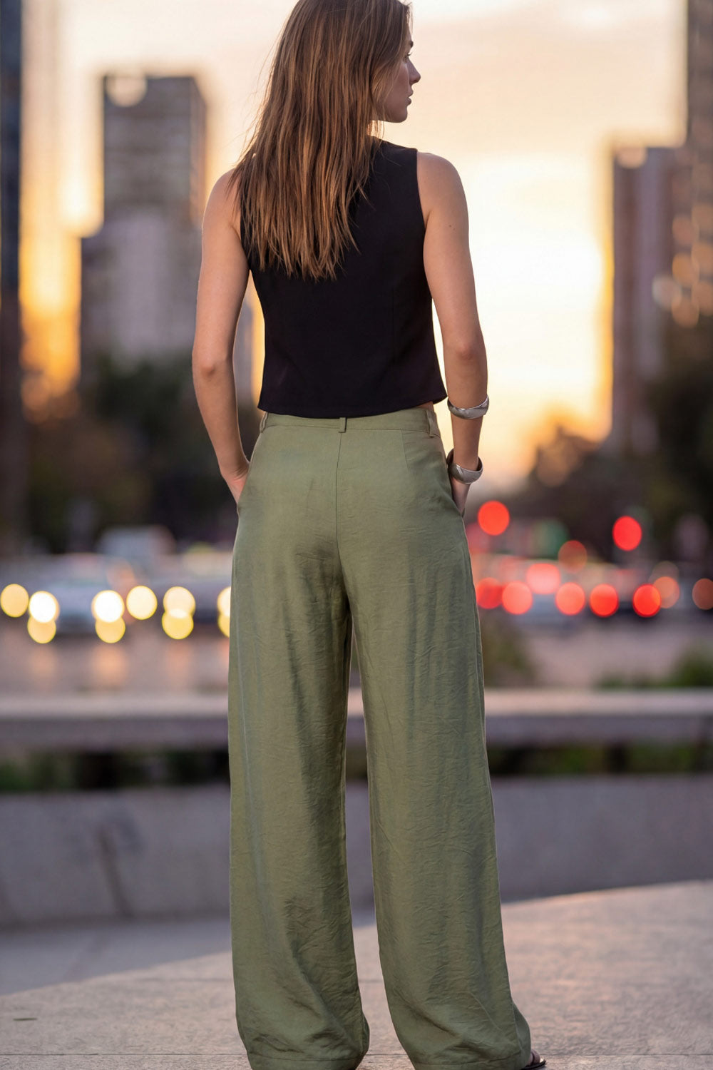 Pantalón de fit wide leg, cintura alta con pretina y trabillas, pinzas frontales, bolsillos delanteros, cierre frontal con broche y cremallera ocultos.