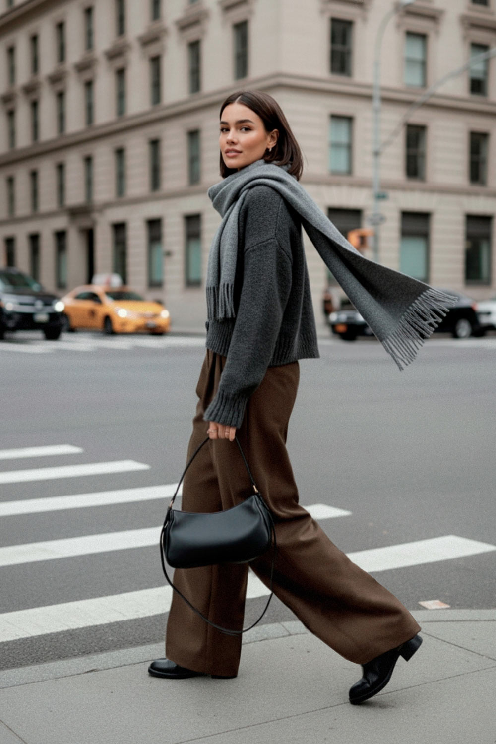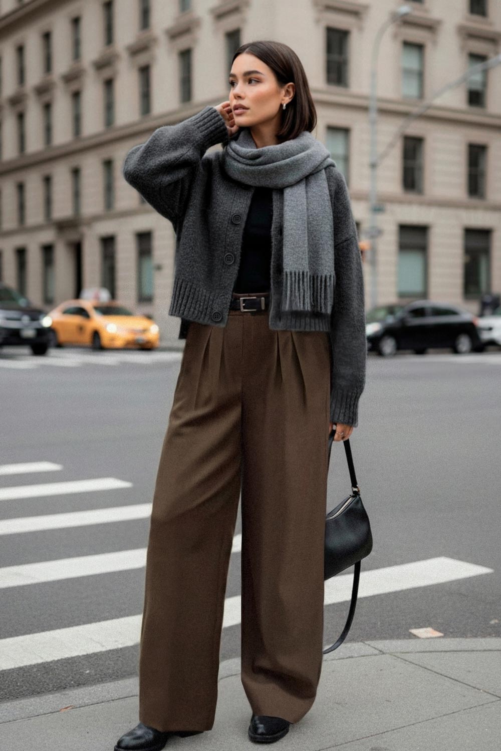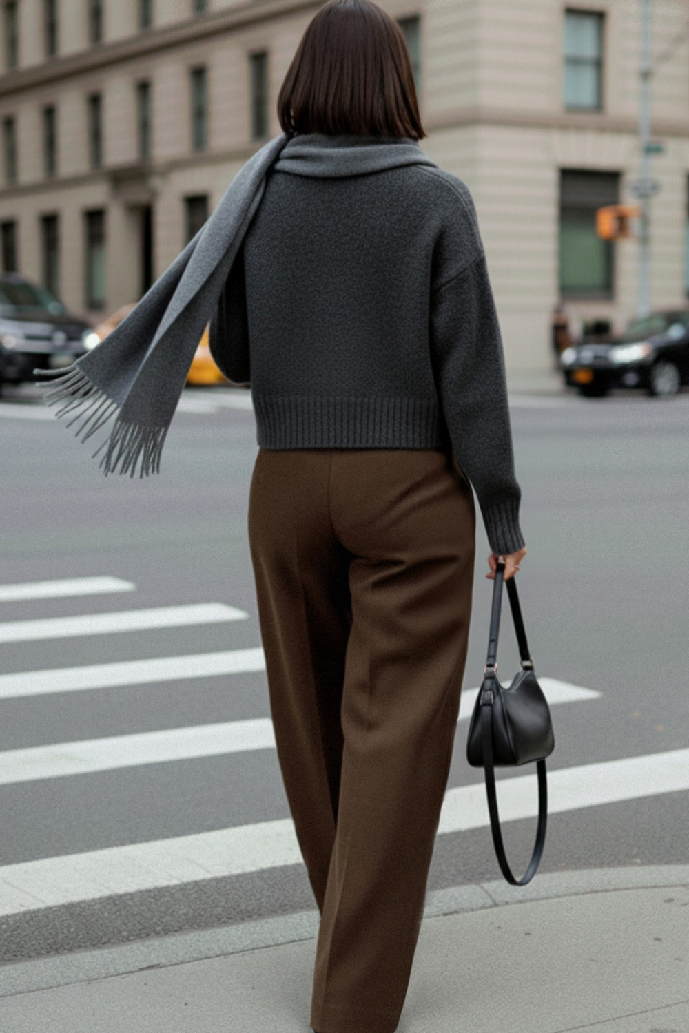 Pantalón de fit wide leg, pinzas frontales, cintura alta con pretina y trabillas, bolsillos delanteros, cierre frontal con broche y cremallera ocultos.