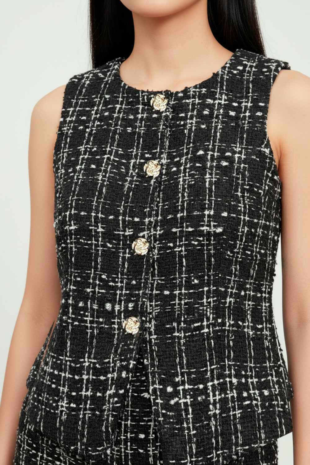 Chaleco de bouclé fit ajustado, cuello redondo, vivos decorativos frontales, cierre con hilera de botones en contraste y abertura frontal en bajo.