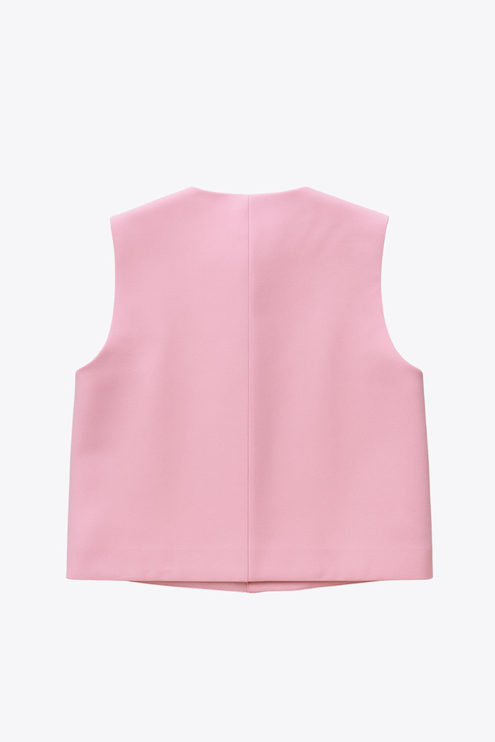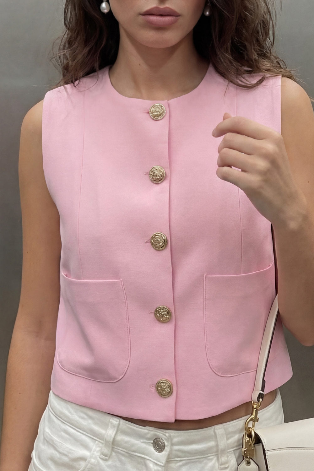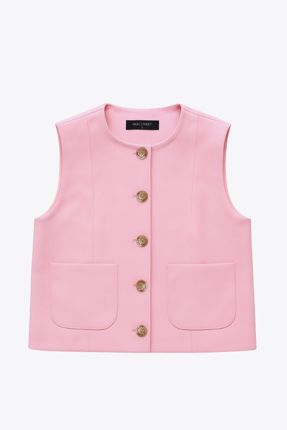Chaleco corto de fit recto, cuello redondo, pinzas frontales, bolsillos delanteros de parche y cierre frontal con hilera de botones en contraste.