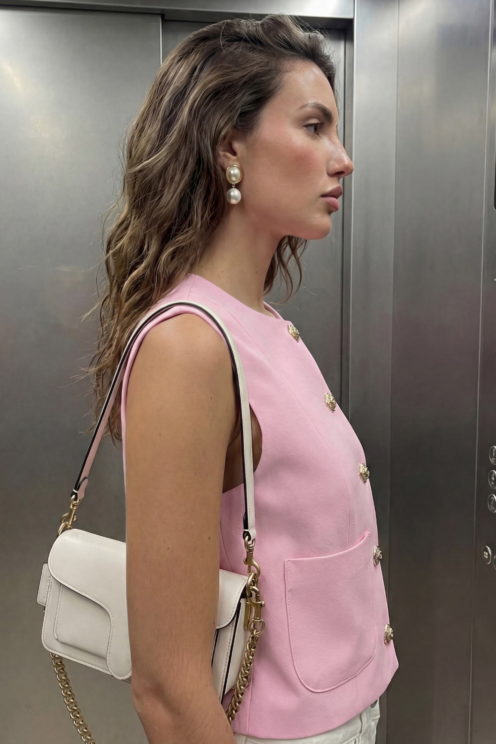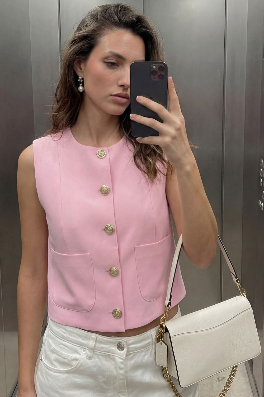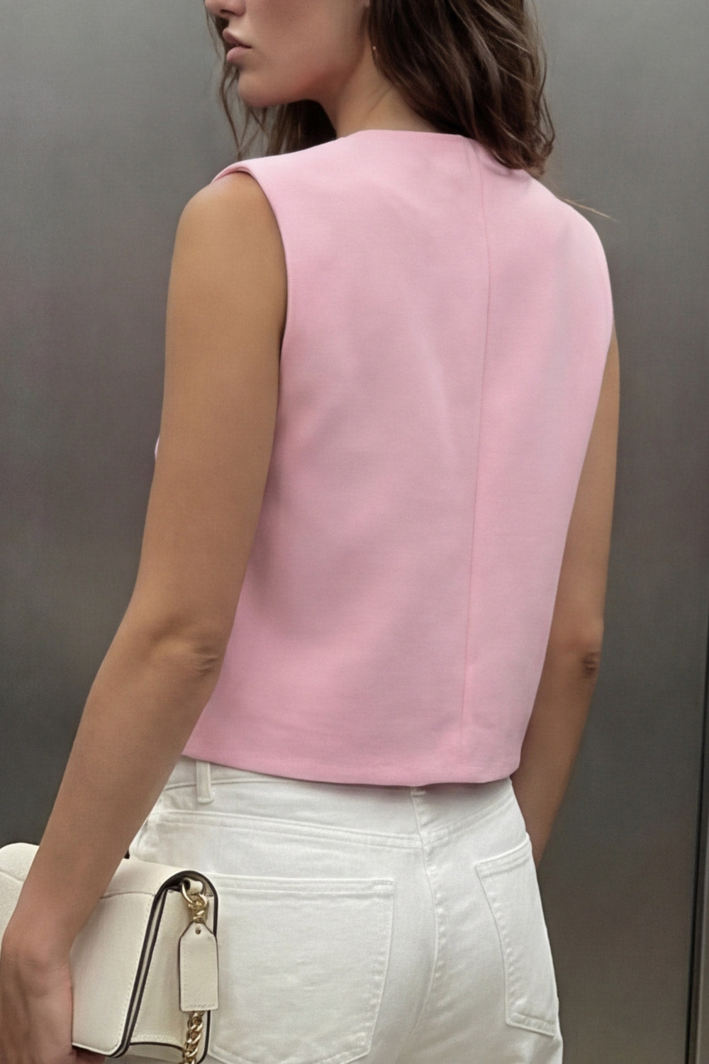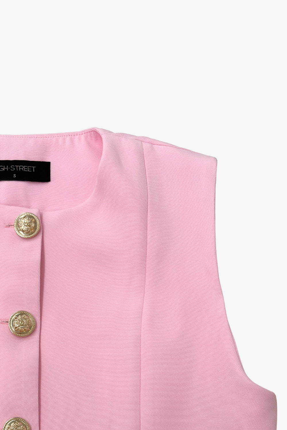 Chaleco corto de fit recto, cuello redondo, pinzas frontales, bolsillos delanteros de parche y cierre frontal con hilera de botones en contraste.