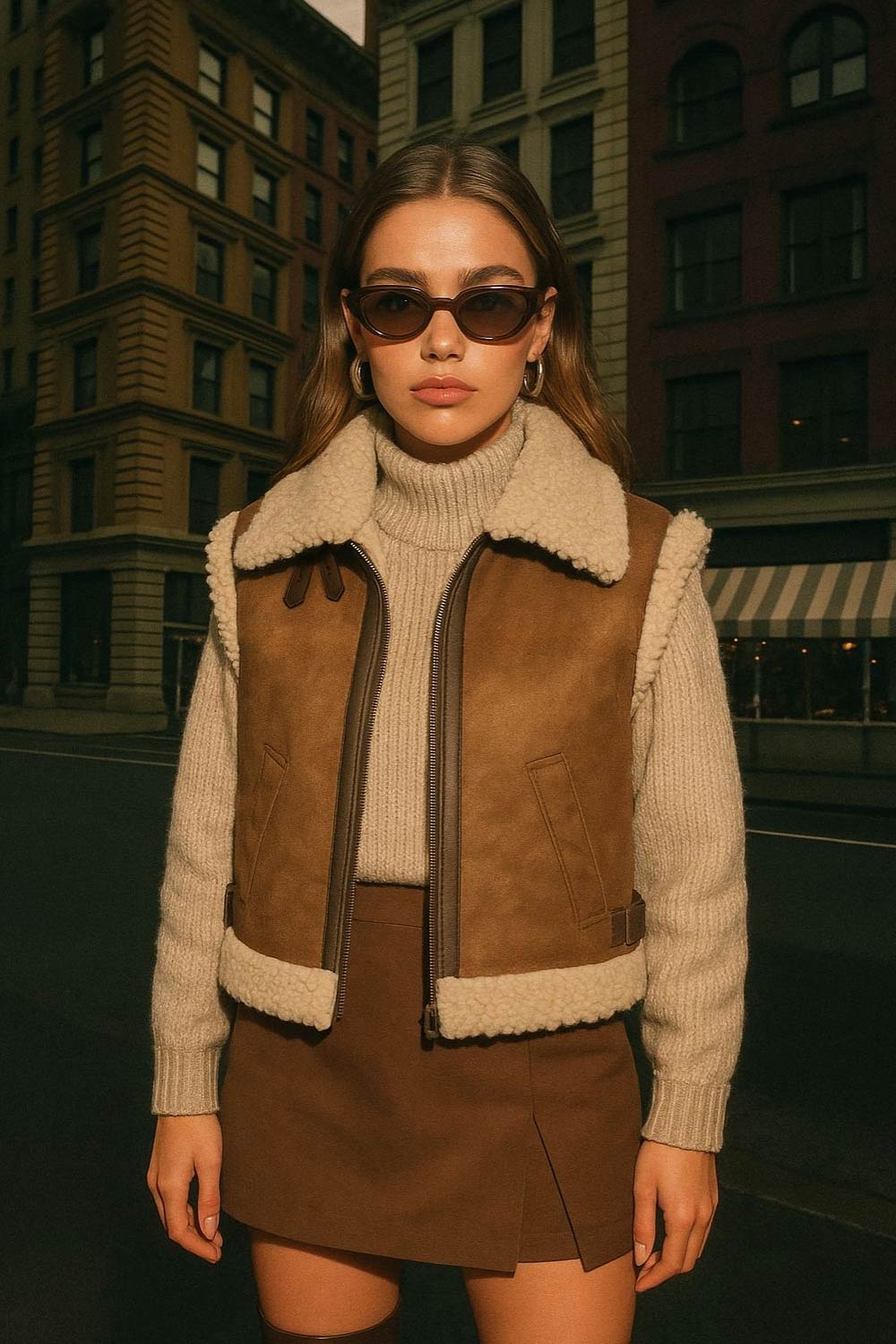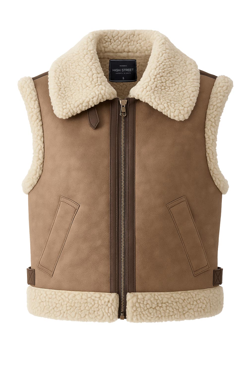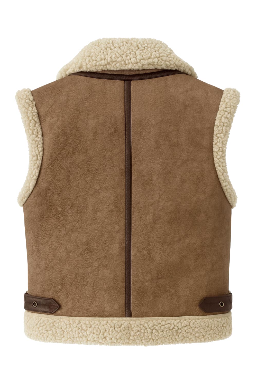 Chaleco corto de efecto piel, fit recto, cuello con solapa en contraste, bolsillos delanteros, trabillas laterales con hebillas en contraste y cierre frontal con cremallera. Detalle de borreguillo en contraste en interior, bordes y solapa.