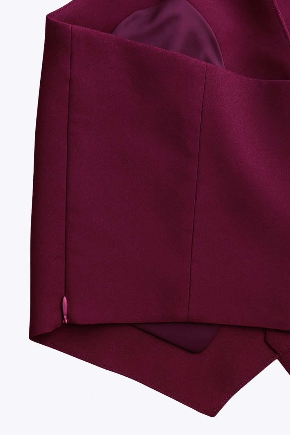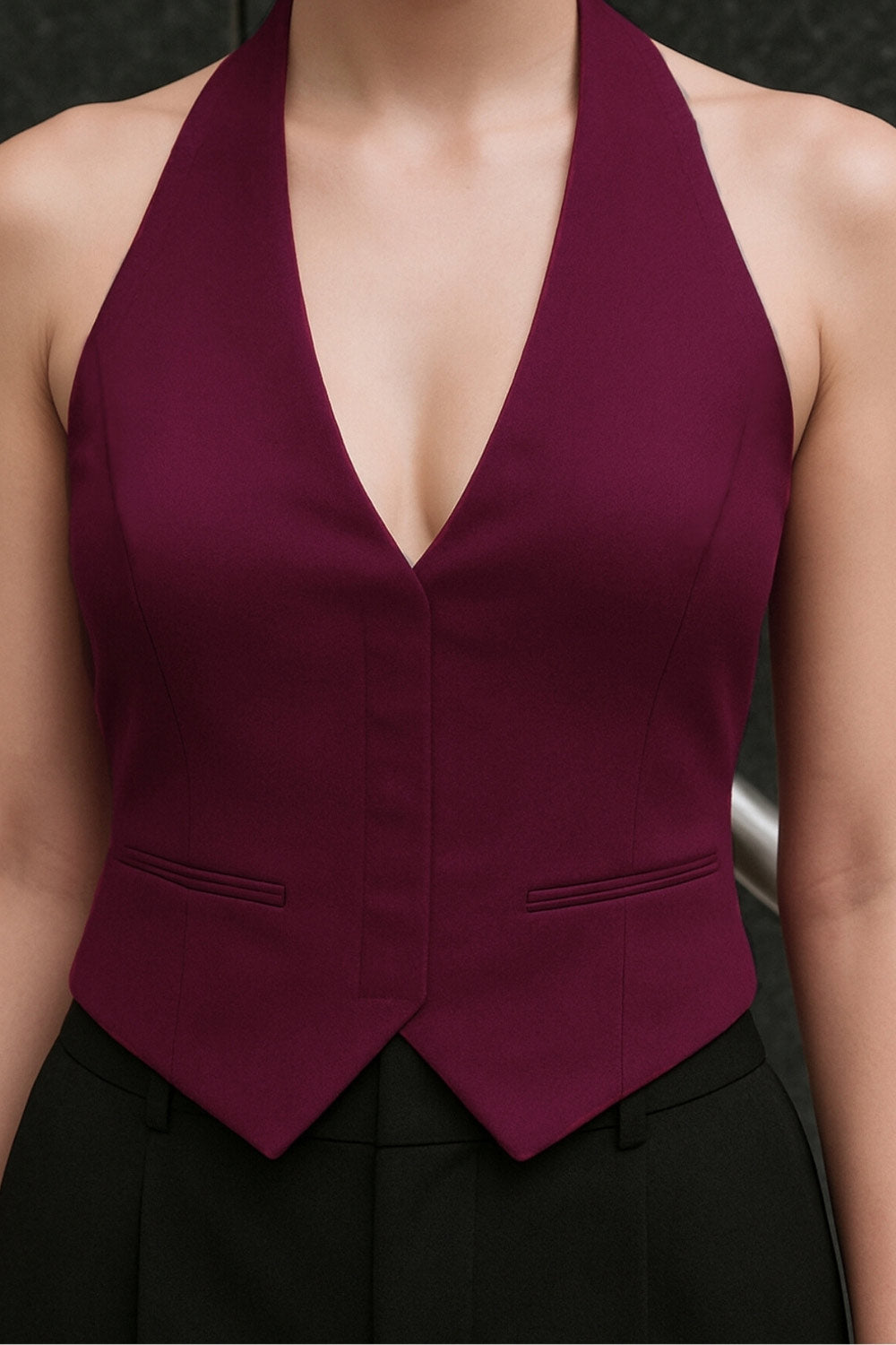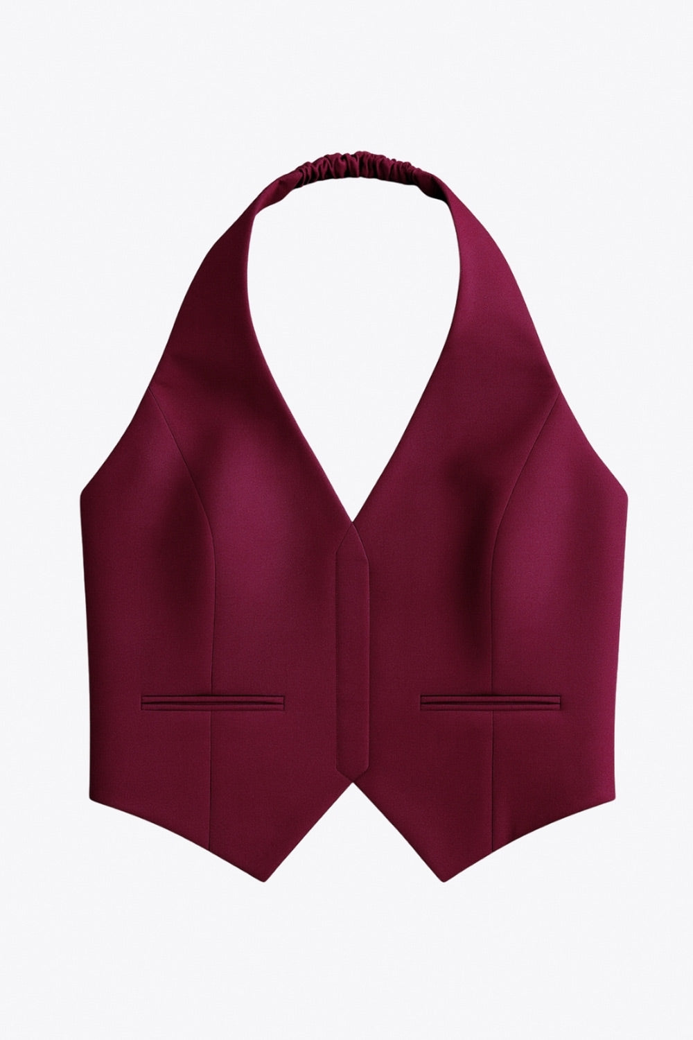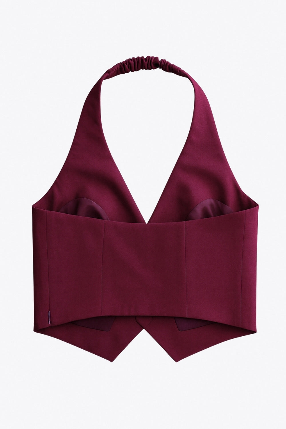 Chaleco corto cuello halter de fit ajustado, escote v, cierre lateral con cremallera oculta, vivos decorativos frontales y bajo v frontal. Escote en espalda y rib elástico posterior.