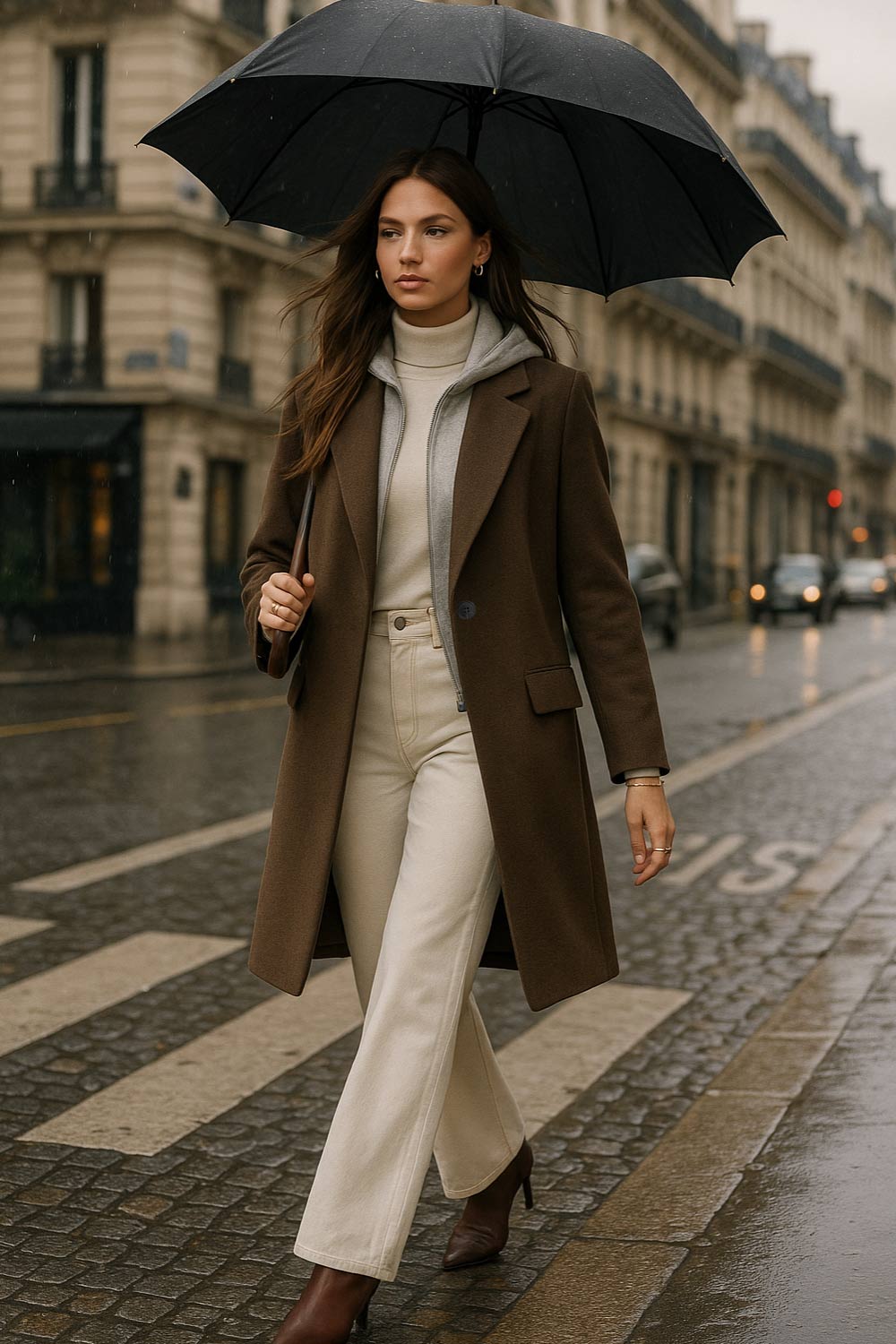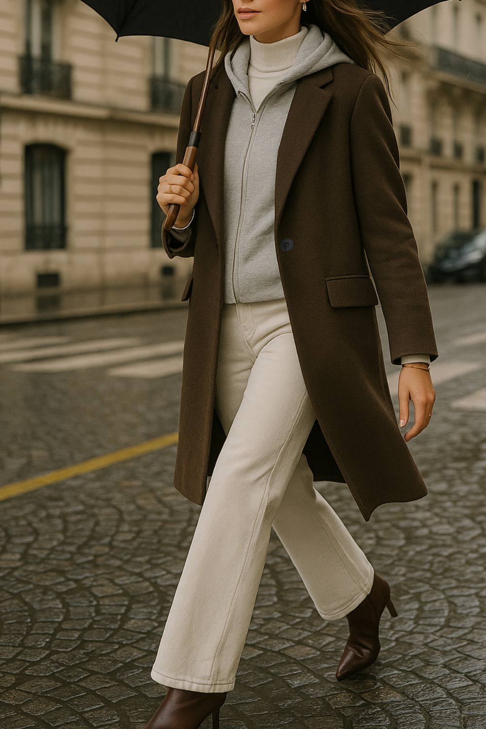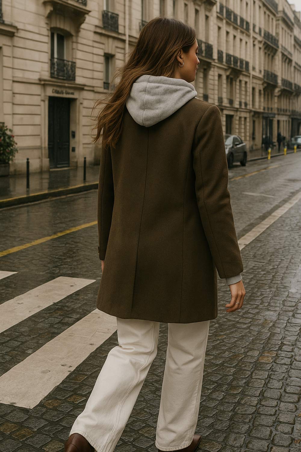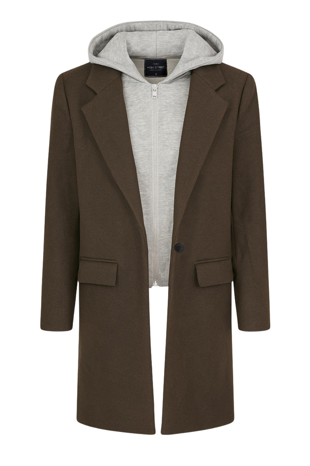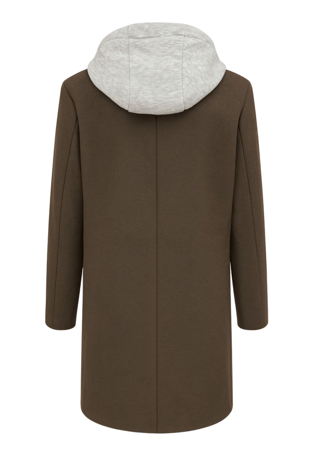 Abrigo largo con capucha combinada, manga larga, con solapa y hombreras, bolsillos delanteros con carteras, detalle frontal y capucha en contraste. Cierre frontal con cremallera y botón.