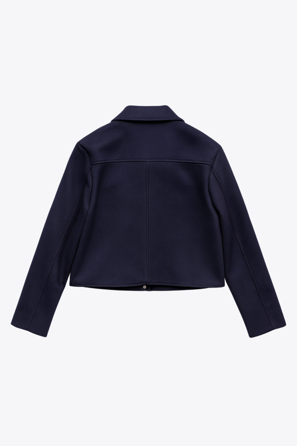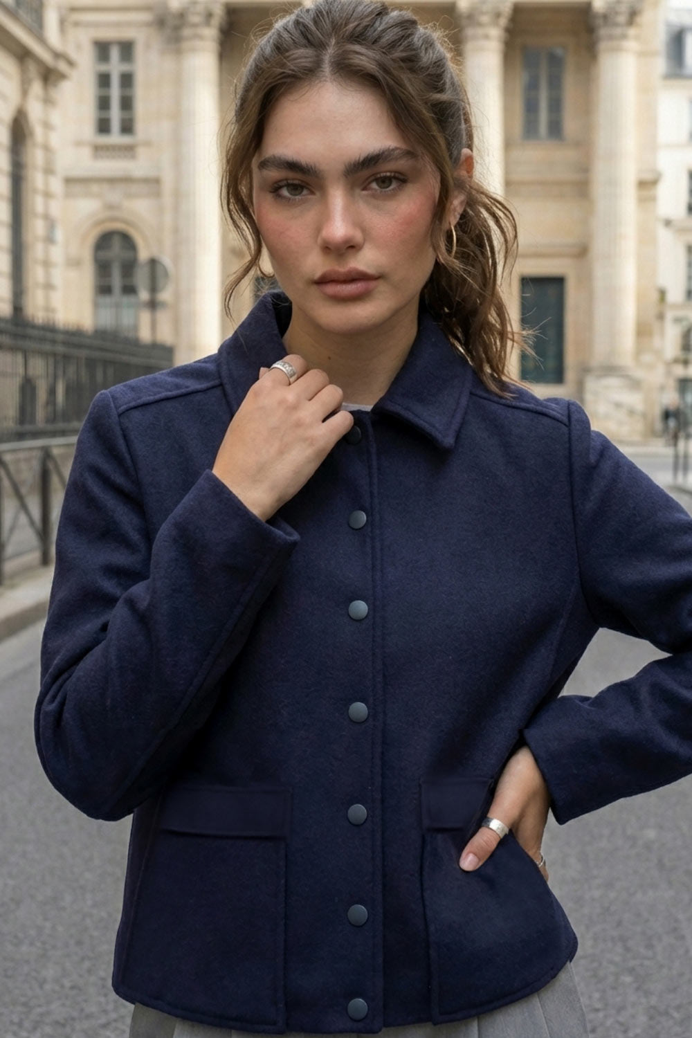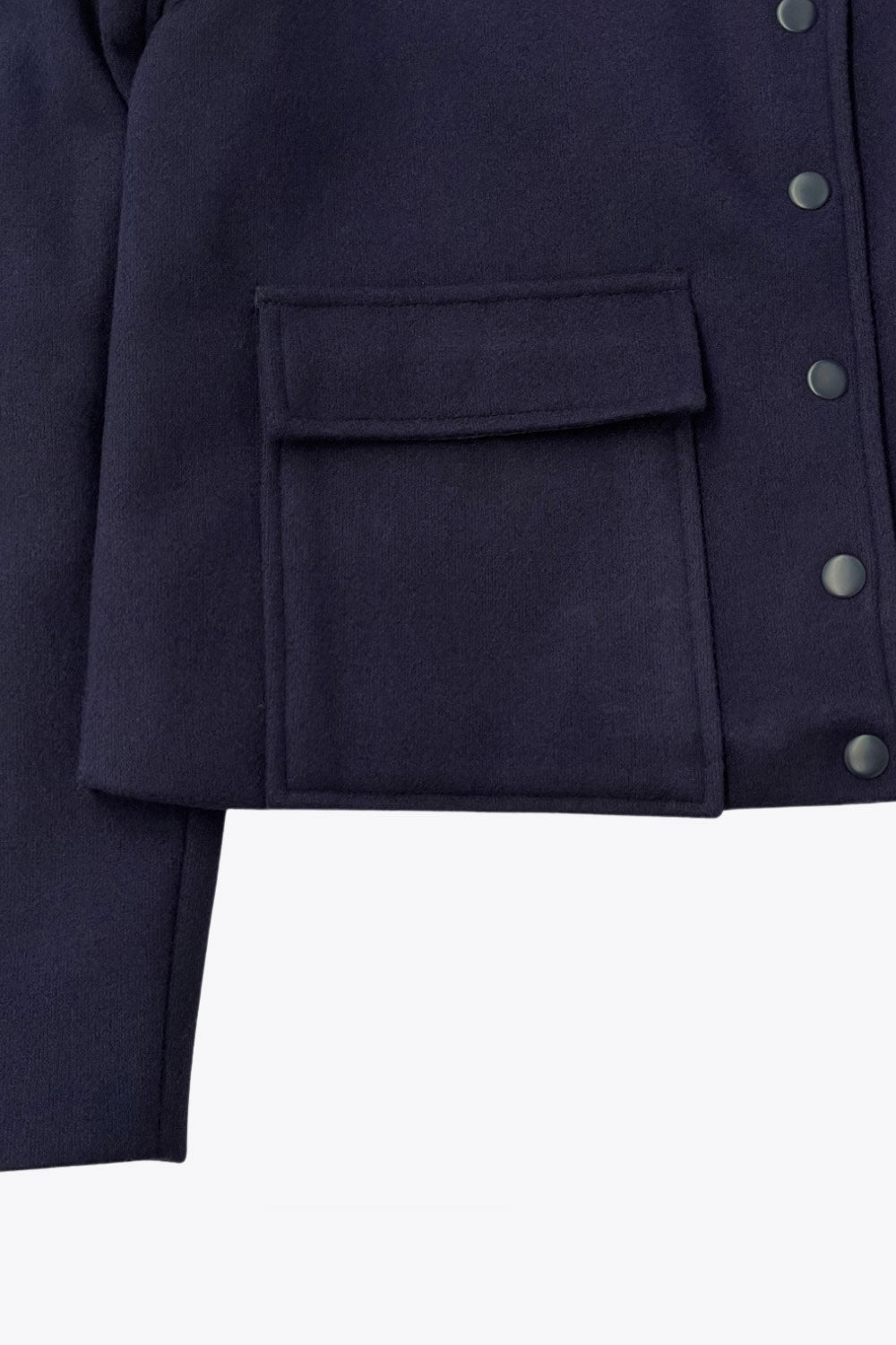 Abrigo corto de fit recto, manga larga, cuello solapa, bolsillos delanteros de parche con cartera y cierre frontal con hilera de botones en contraste.