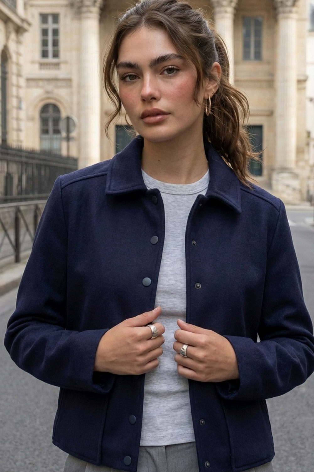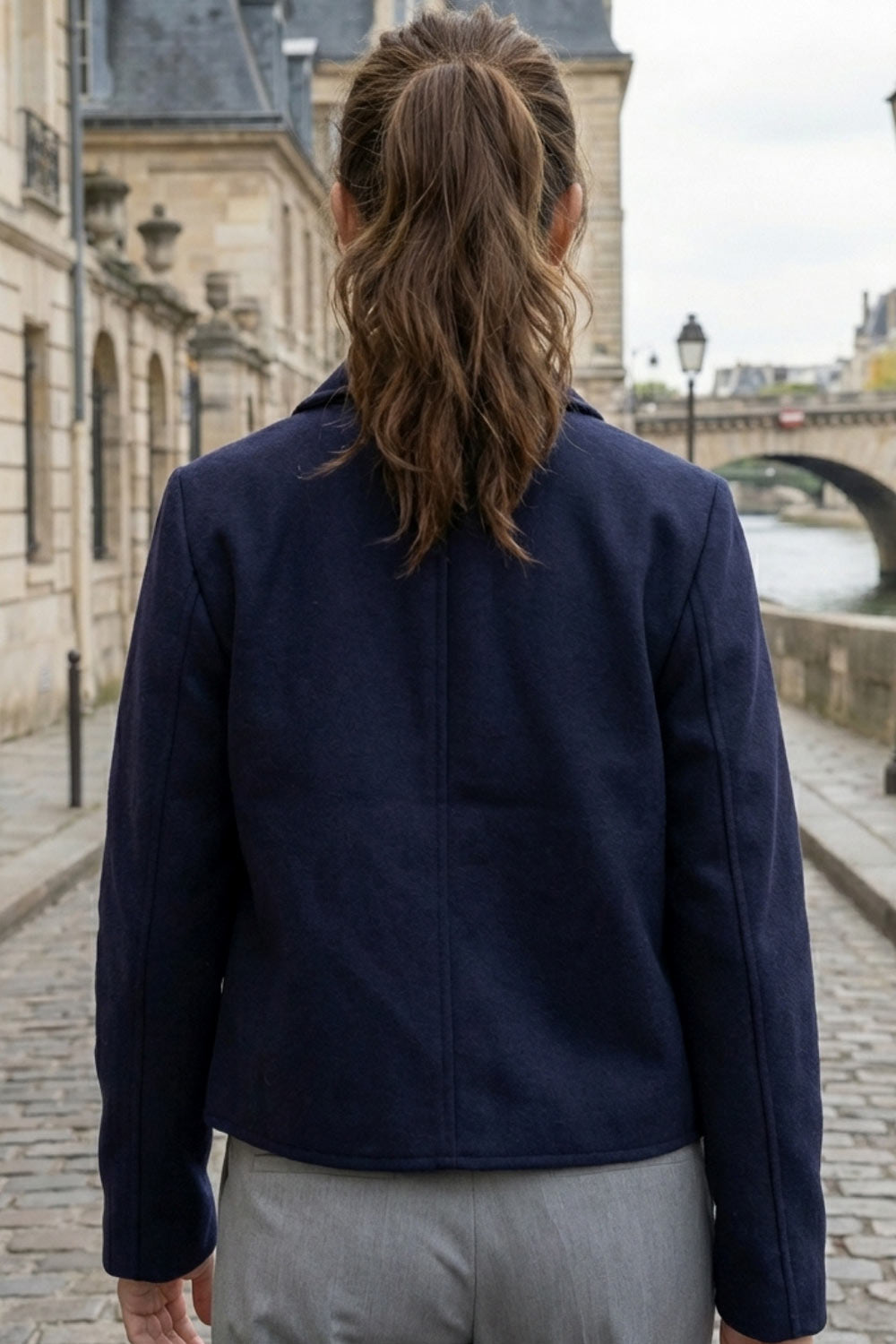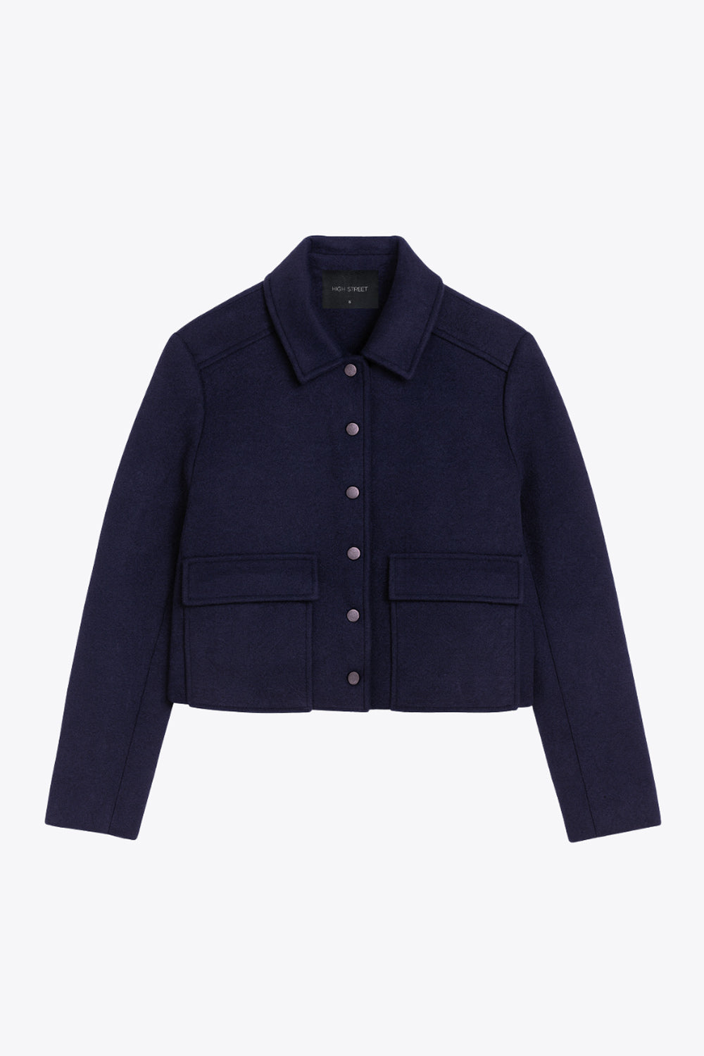 Abrigo corto de fit recto, manga larga, cuello solapa, bolsillos delanteros de parche con cartera y cierre frontal con hilera de botones en contraste.