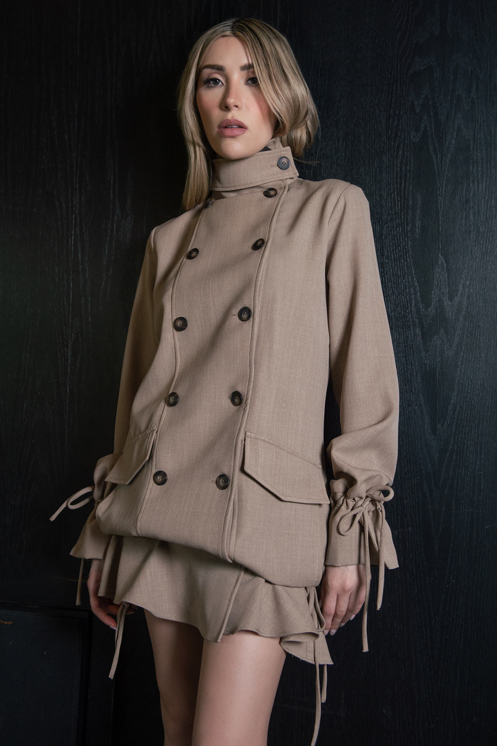 Vestido corto de fit recto, con hombreras, manga larga amplia con jareta y olanes en puños, pinza de amplitud en espalda, bolsillos delanteros con cartera, jareta laterales en bajo con olanes en borde y cierre frontal con doble cruce de botones en contraste. Detalle de cuello alto con trabilla y botón decorativos.