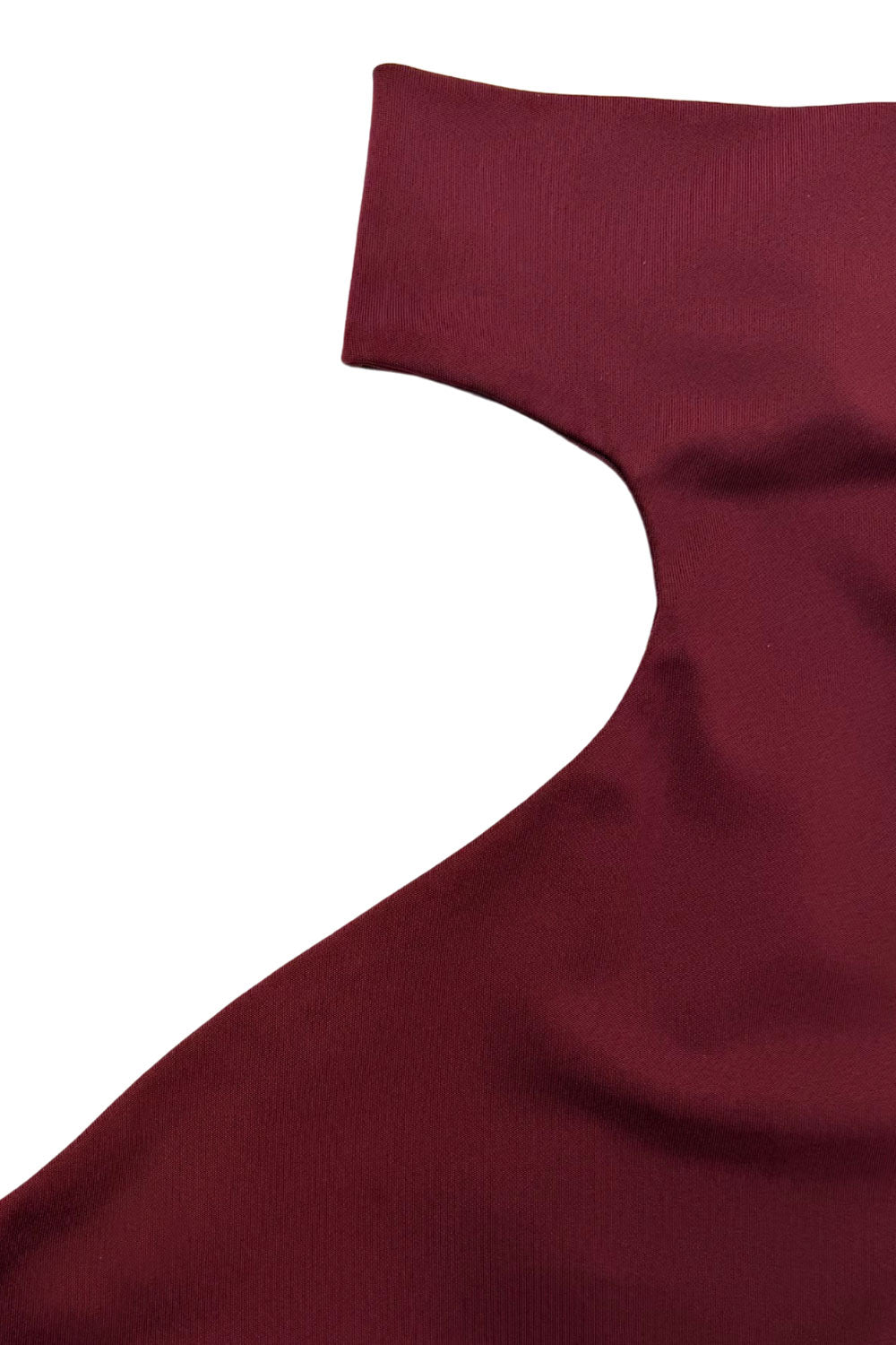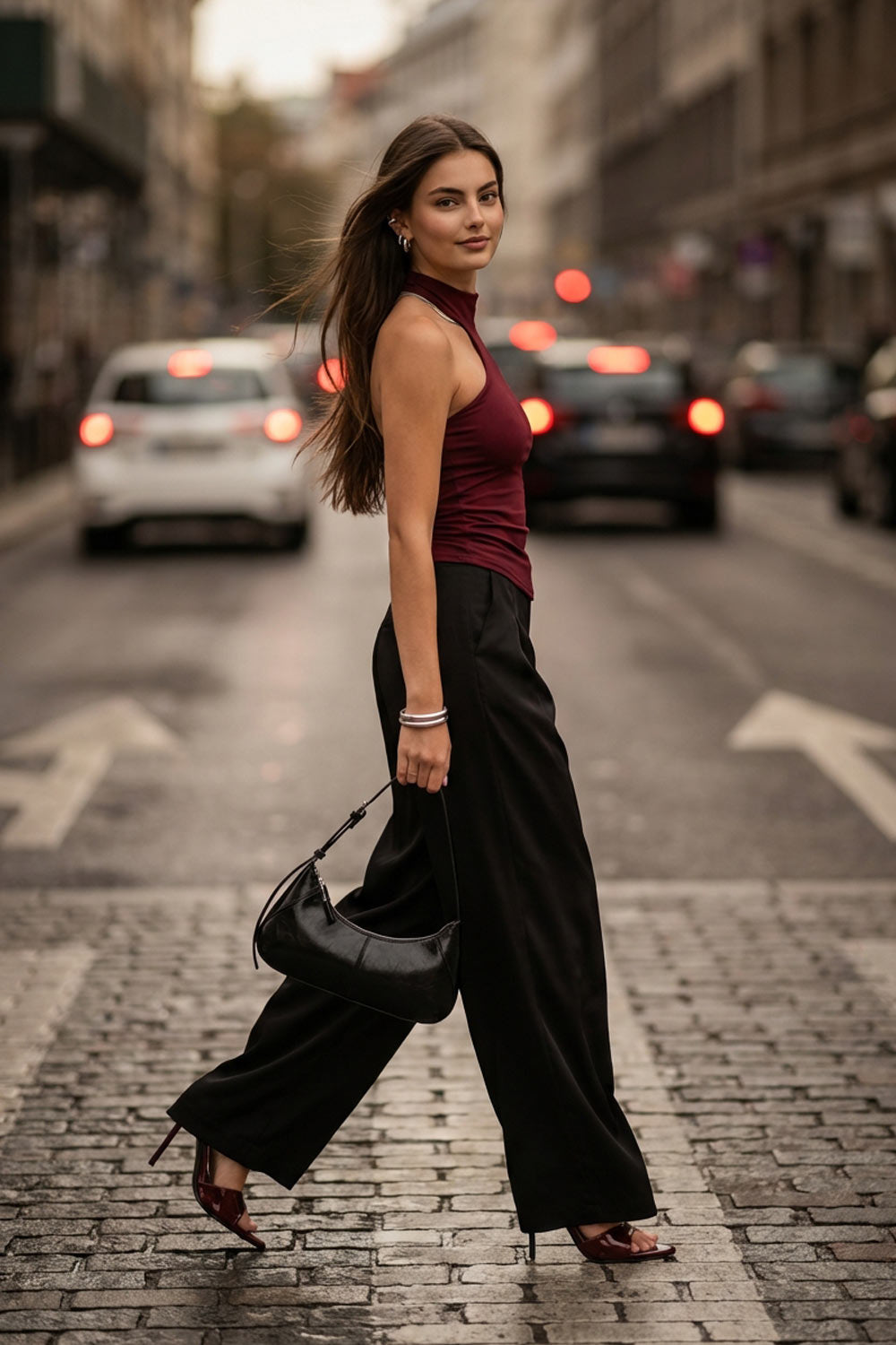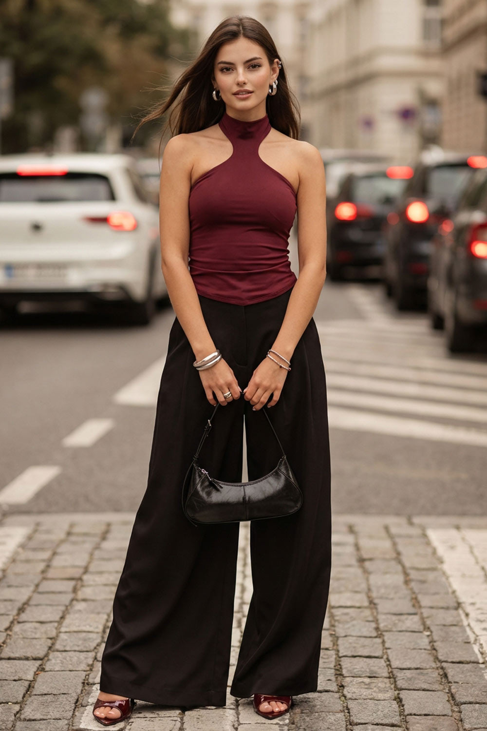 Top halter de fit ajustado, sin mangas, cuello alto, escote en espalda, cierre posterior con botón y ojal.