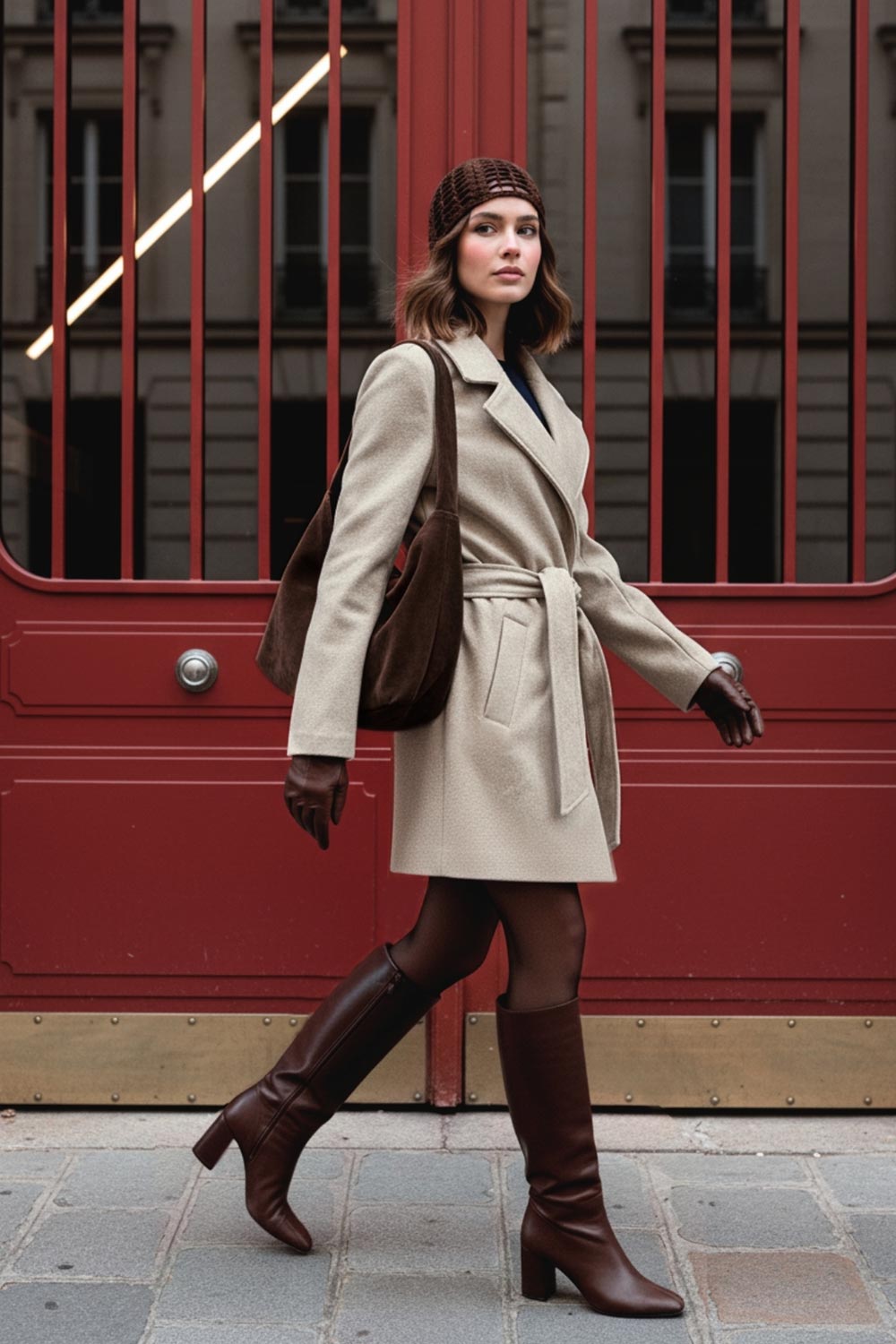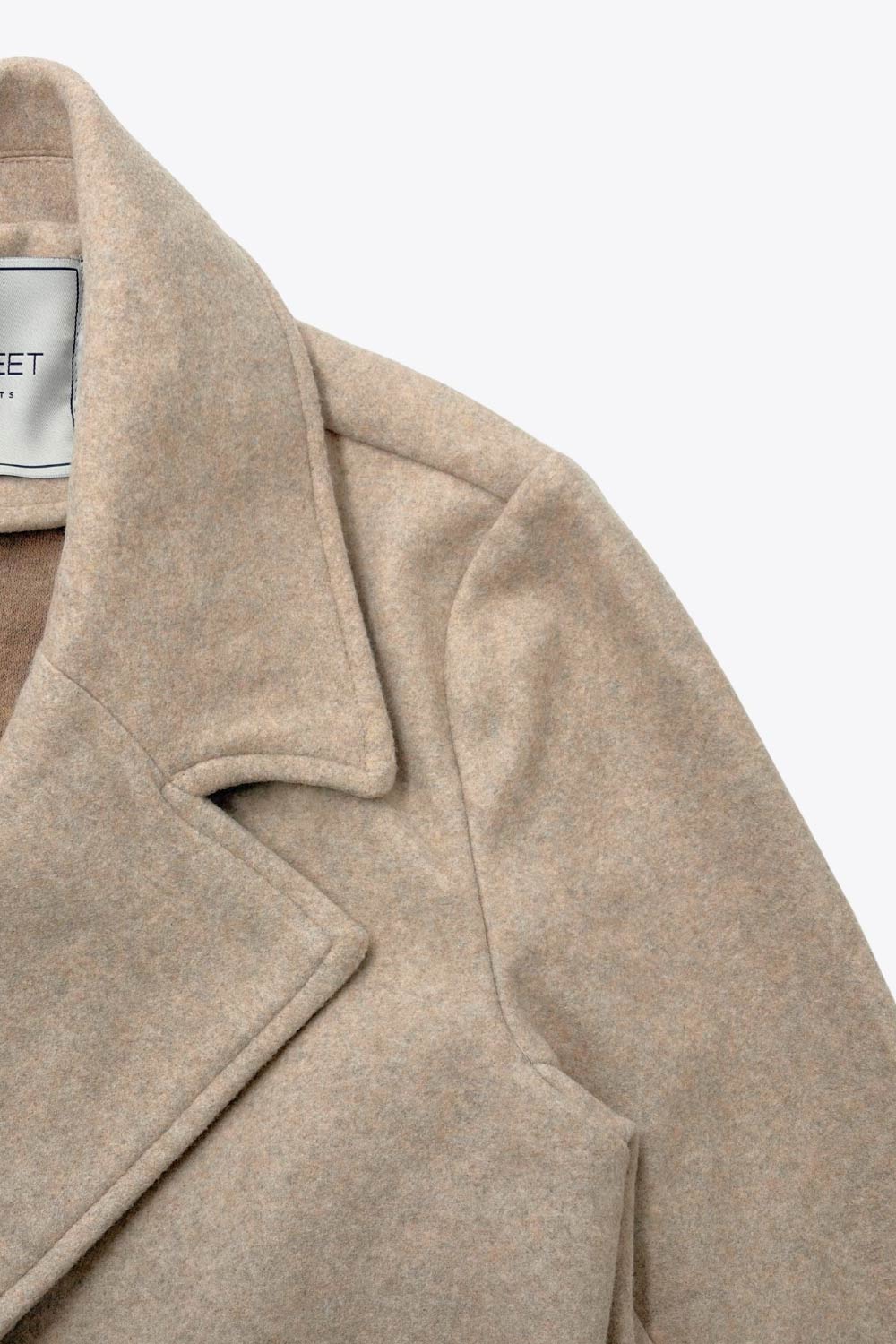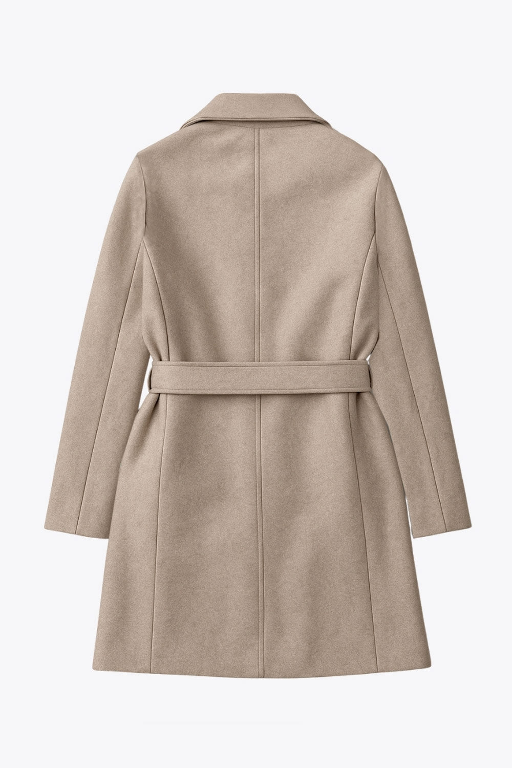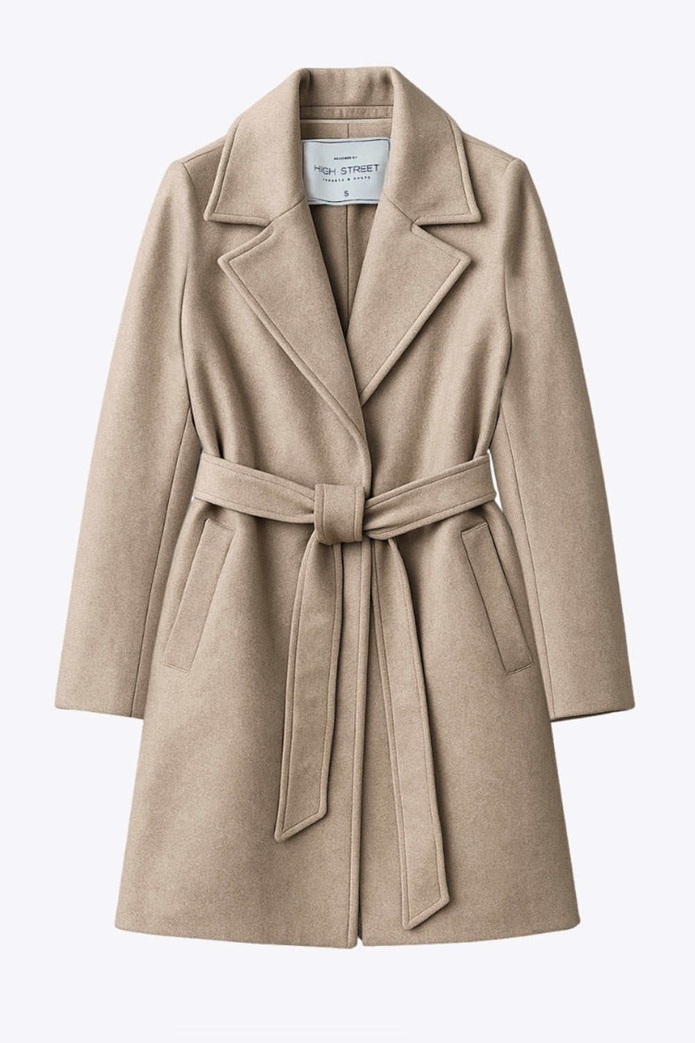 Abrigo de fit recto, con solapa, manga larga, bolsillos frontales con vivos, trabillas y cinturón amarrable del mismo tejido.