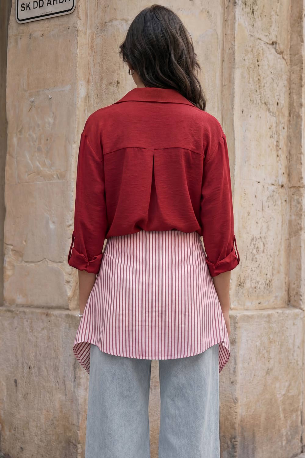 Camisa corta de fit recto, manga larga rolled up con trabilla ajustable, cuello camisero, cruce frontal con escote v y nudo decorativo en bajo. Detalle de bajo curveado y pinza de amplitud en espalda.
