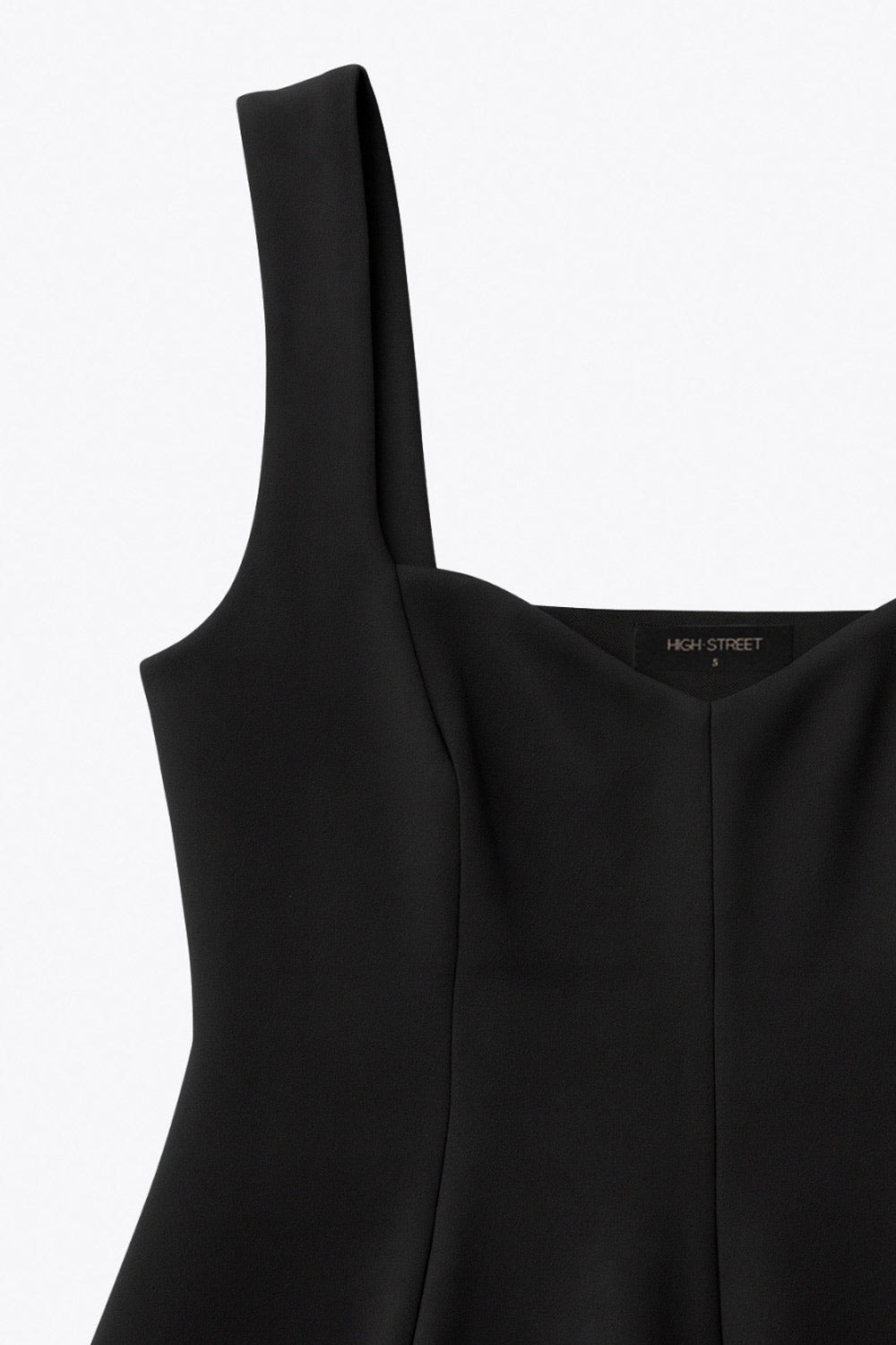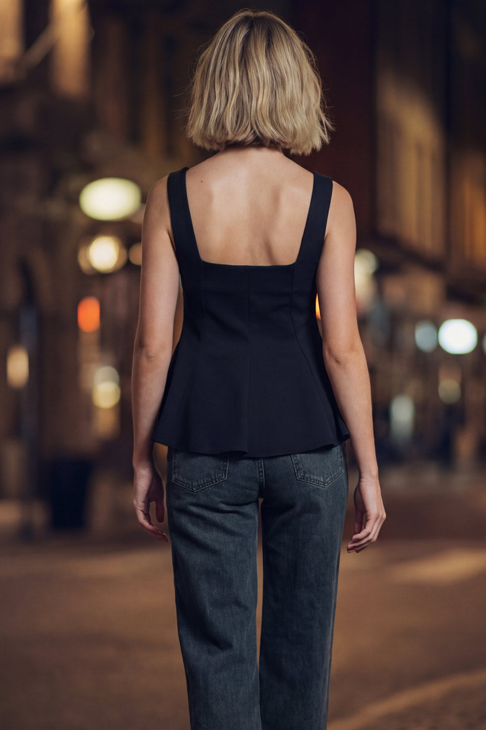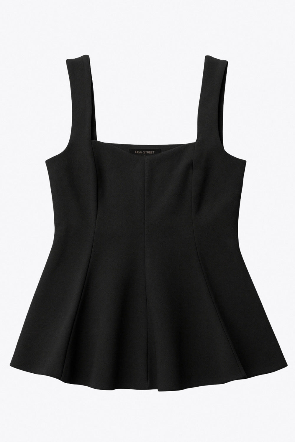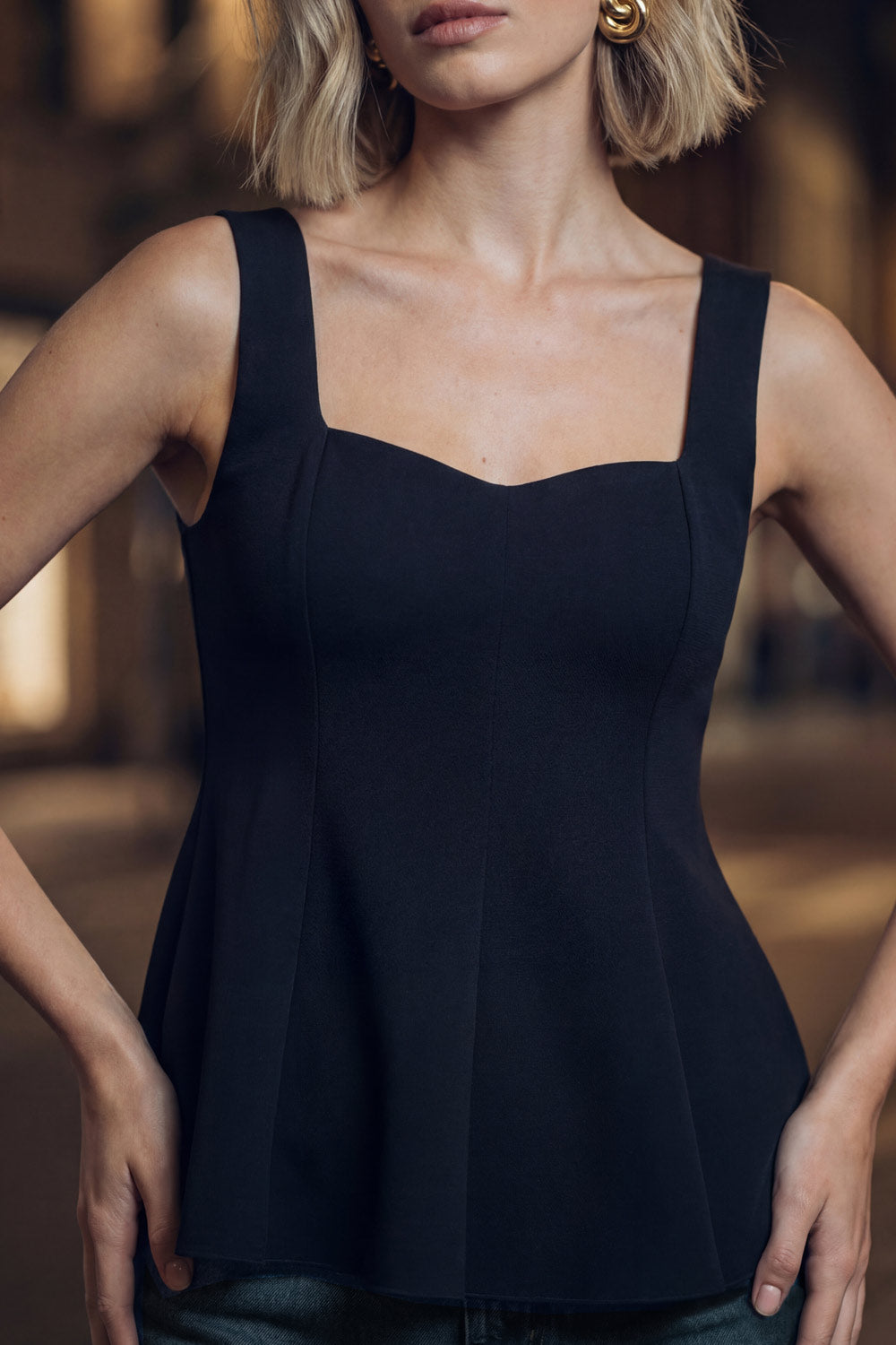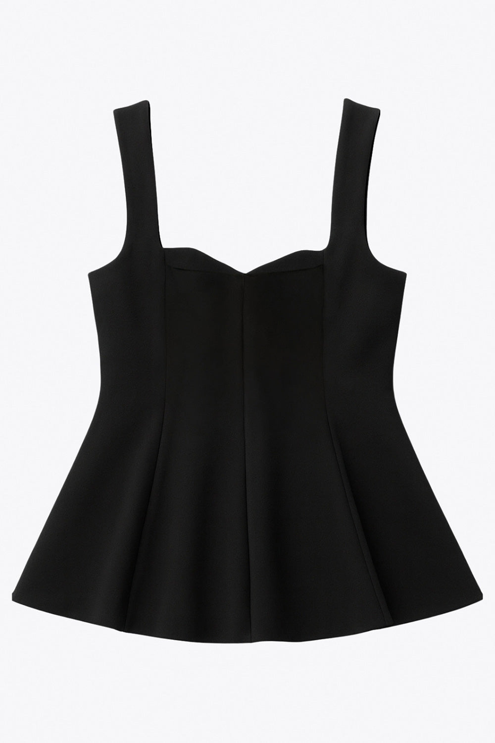 Top de tirantes, fit ajustado, escote corazón, costuras frontales y peplum con olanes en cintura.