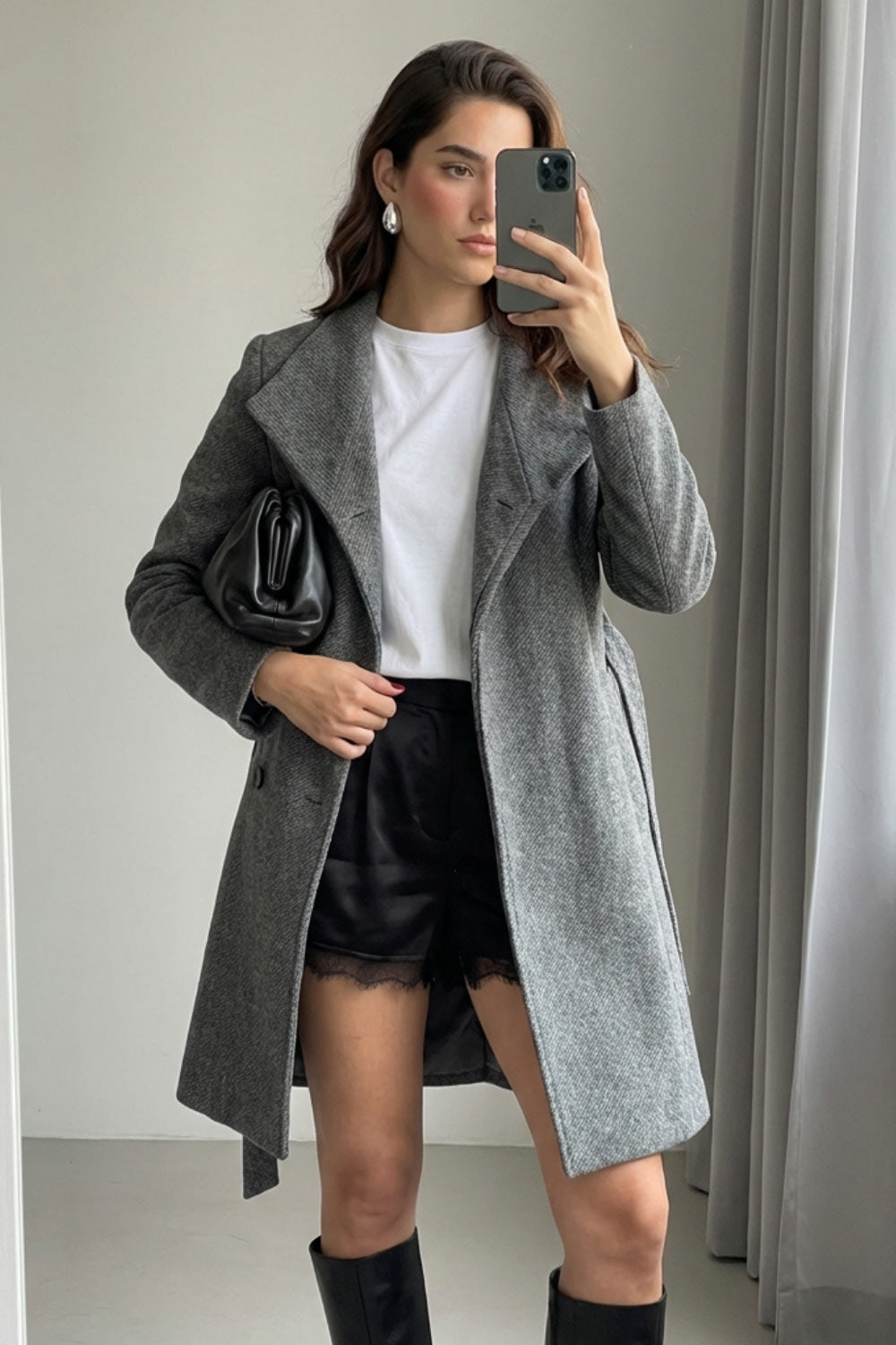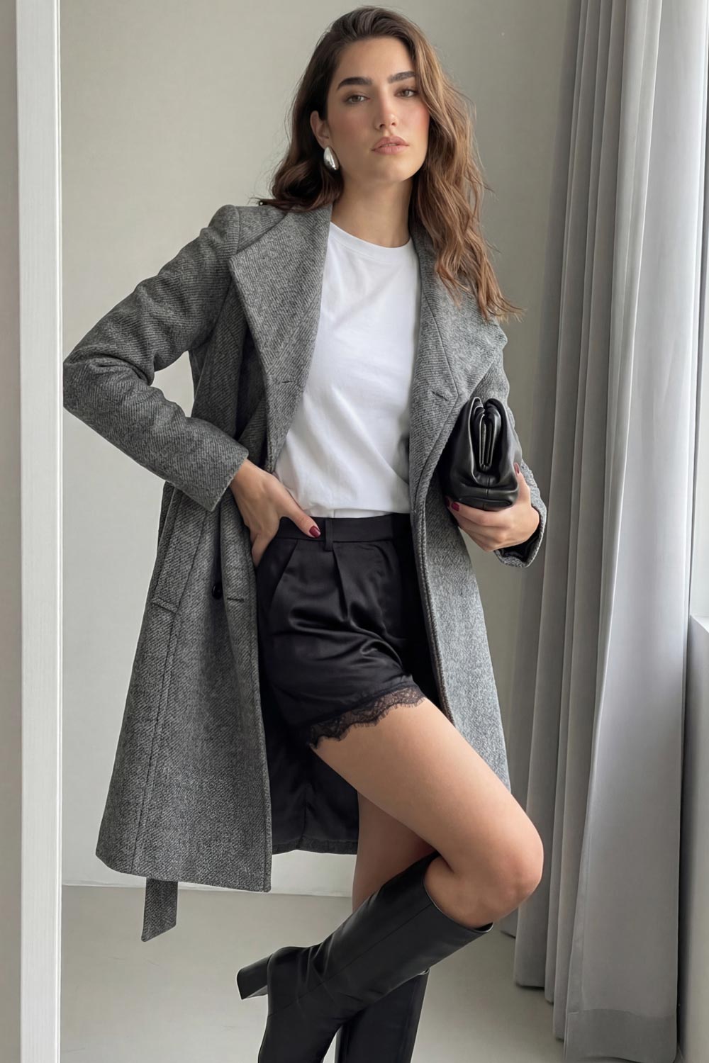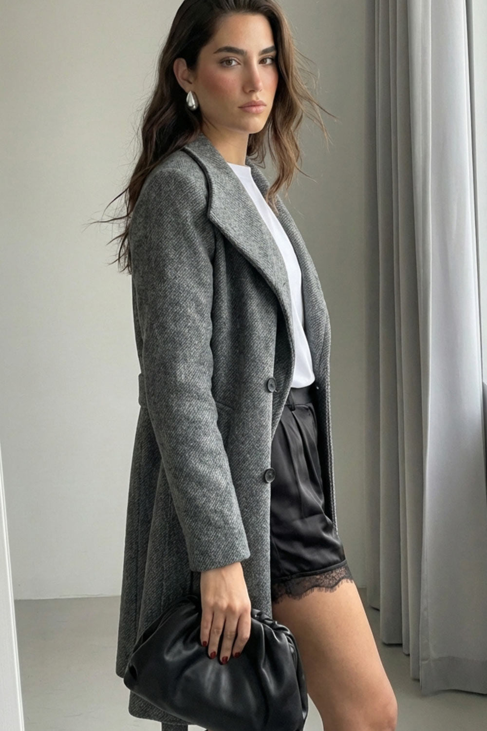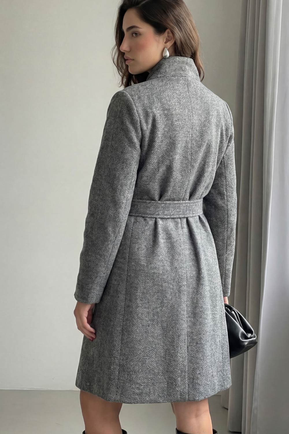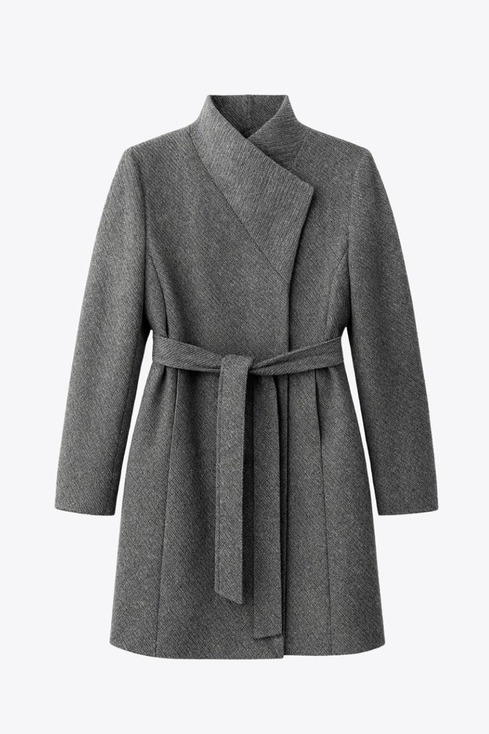 Abrigo midi de fit recto, manga larga, cuello solapa, bolsillos delanteros, trabillas y cinturón amarrable del mismo tejido.