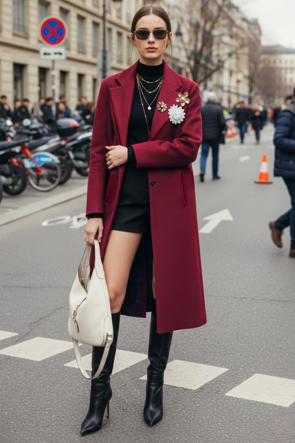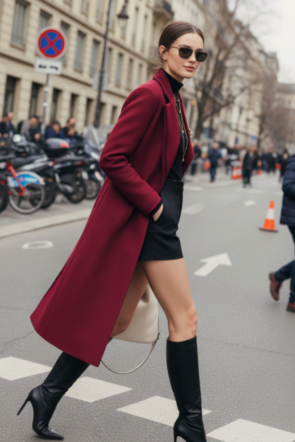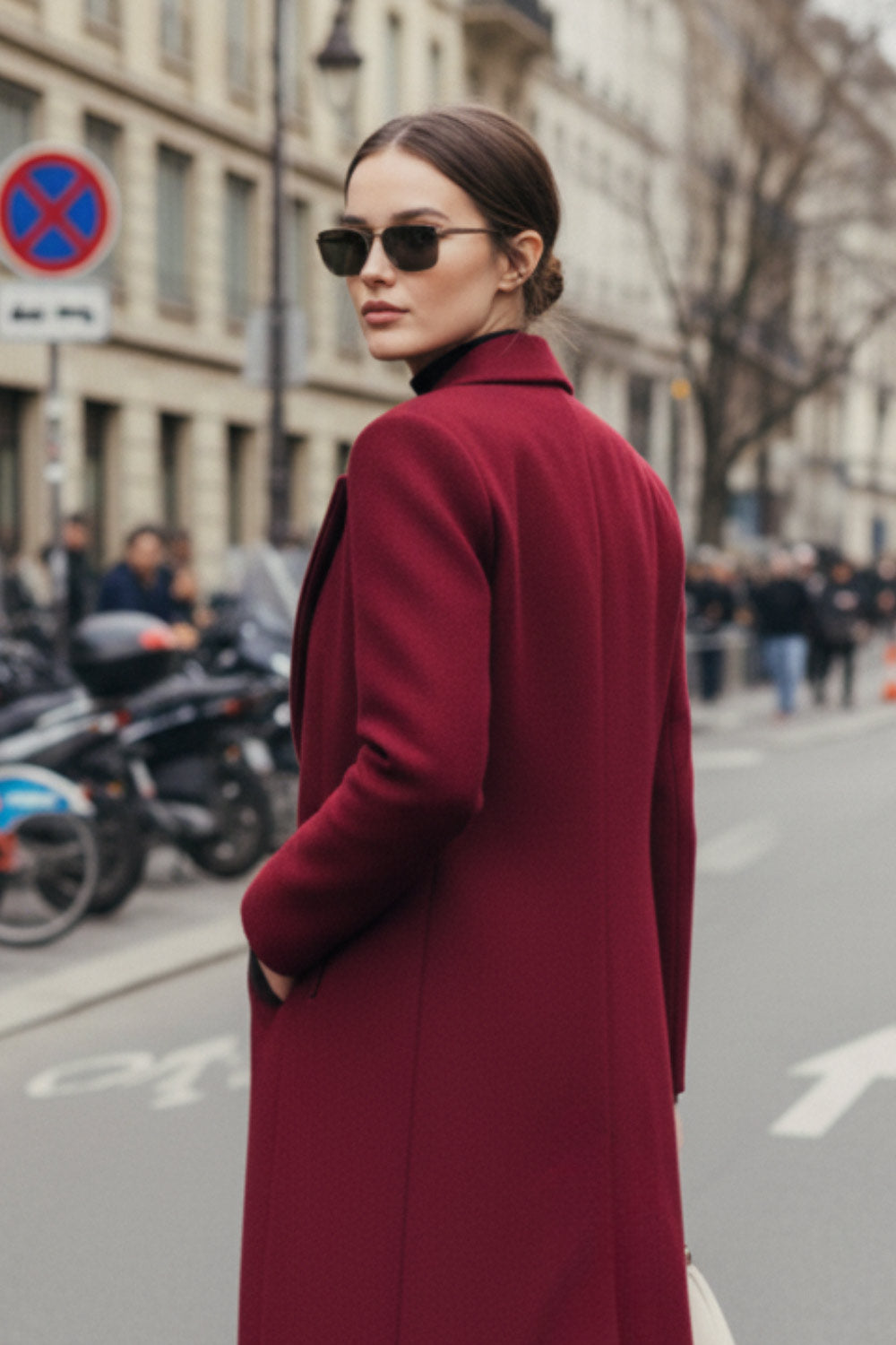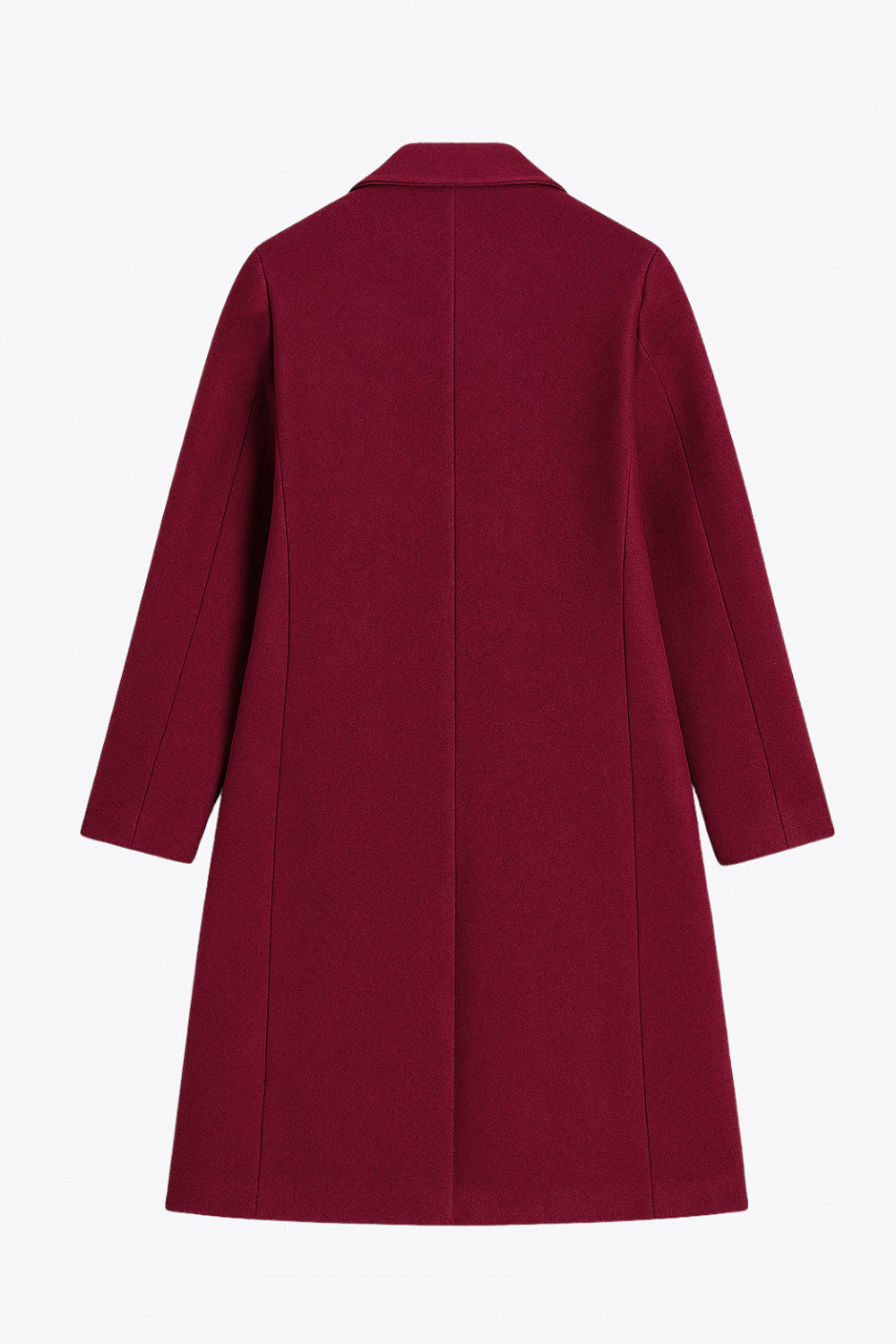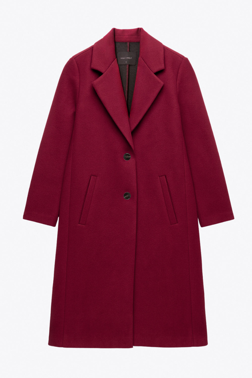 Abrigo largo de fit recto, manga larga, con solapa, bolsillos con vivos delanteros. Cierre frontal con cruce de botones en contraste.
