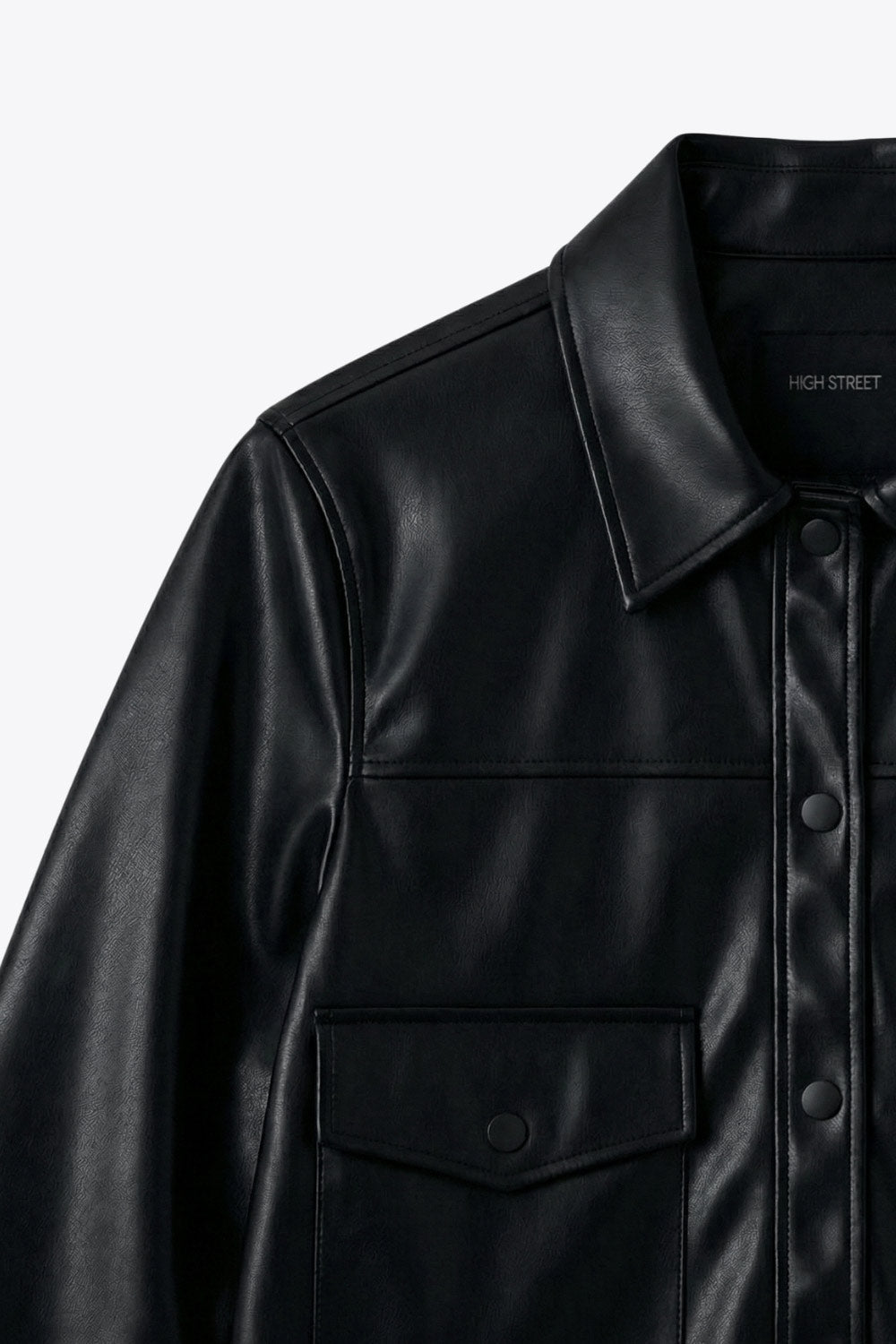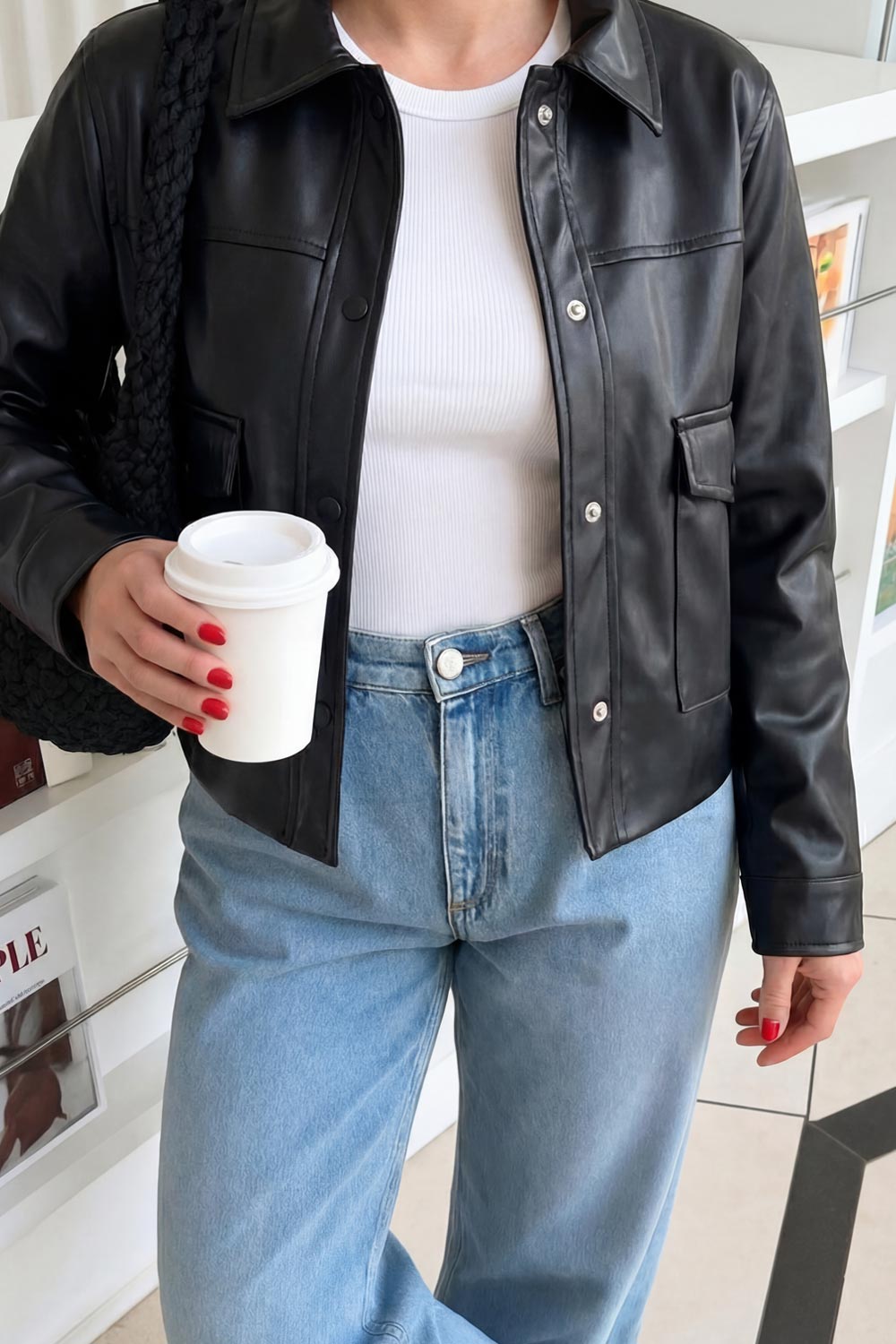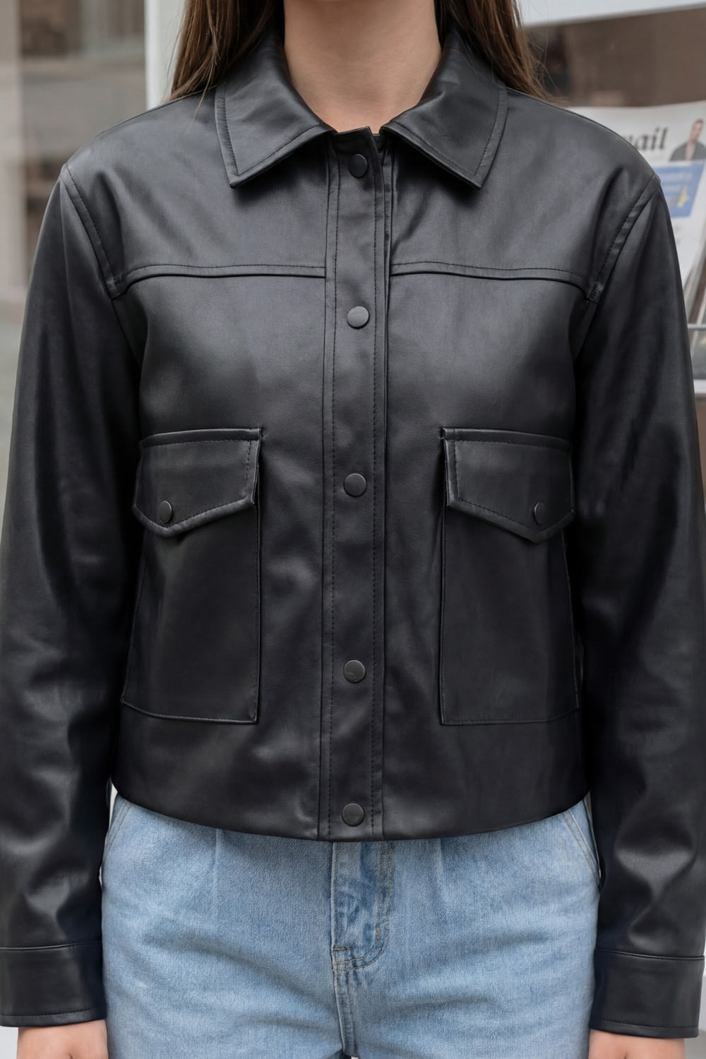 Chamarra corta de efecto piel, fit recto, cuello camisero, manga larga con puño abotonado, bolsillos delanteros de parche con botones y cierre frontal con botones de presión en contraste.