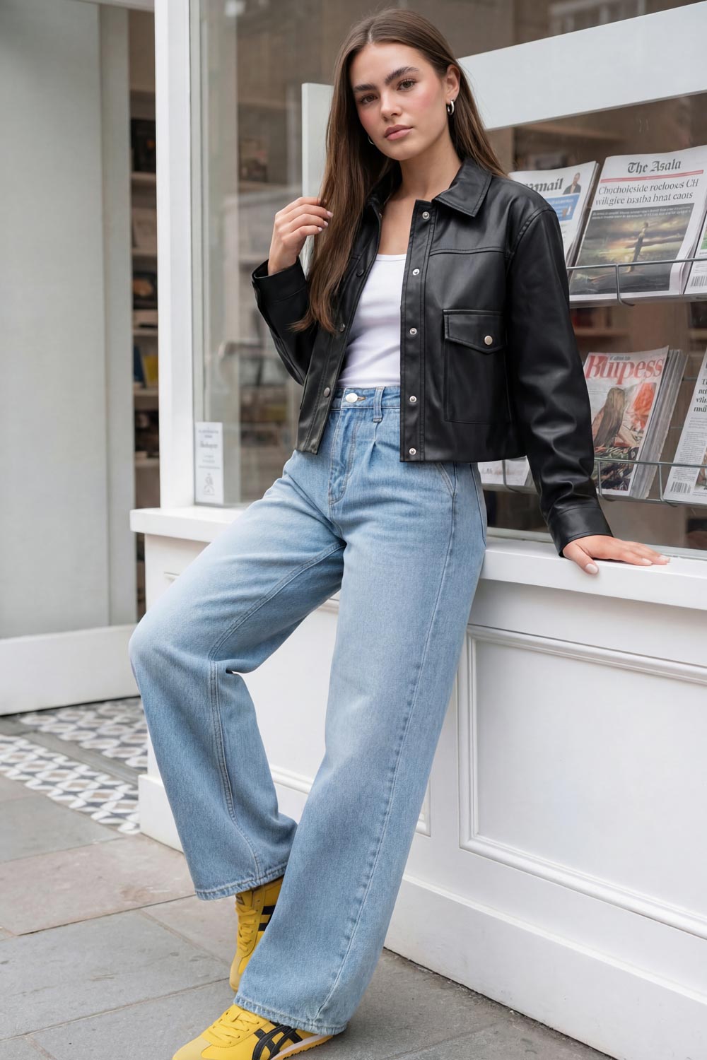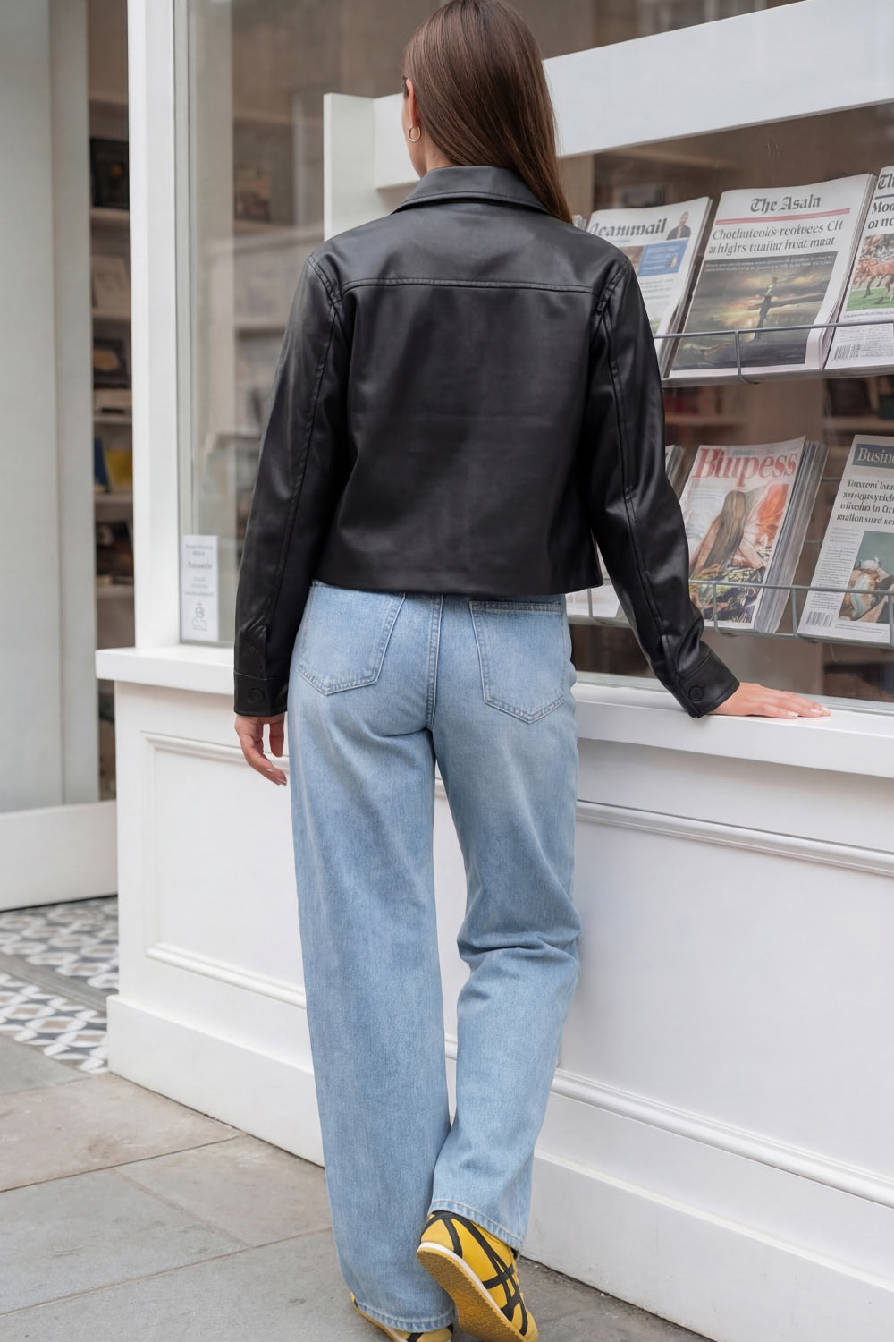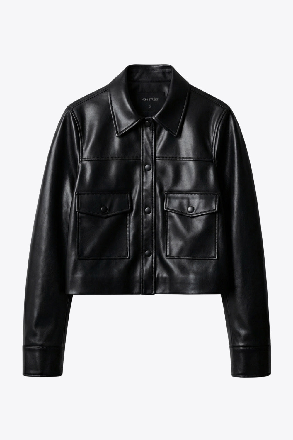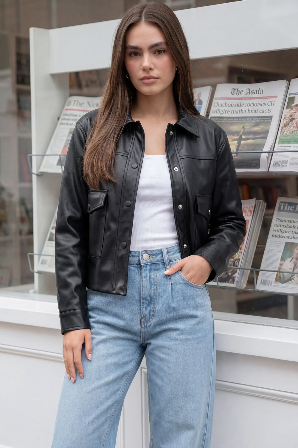 Chamarra corta de efecto piel, fit recto, cuello camisero, manga larga con puño abotonado, bolsillos delanteros de parche con botones y cierre frontal con botones de presión en contraste.