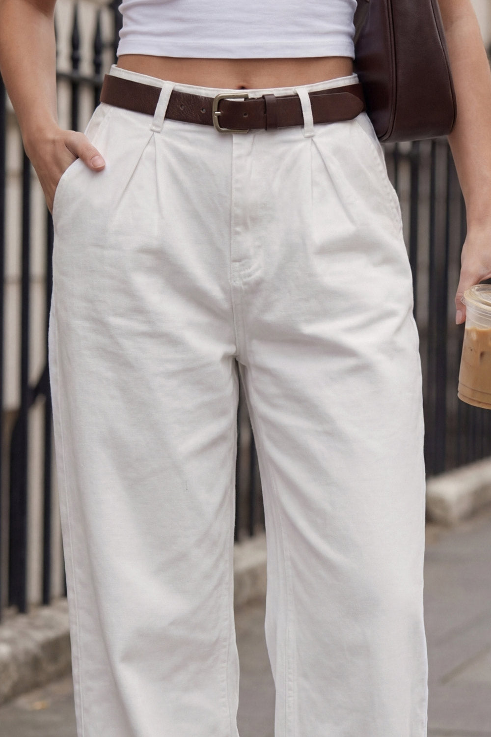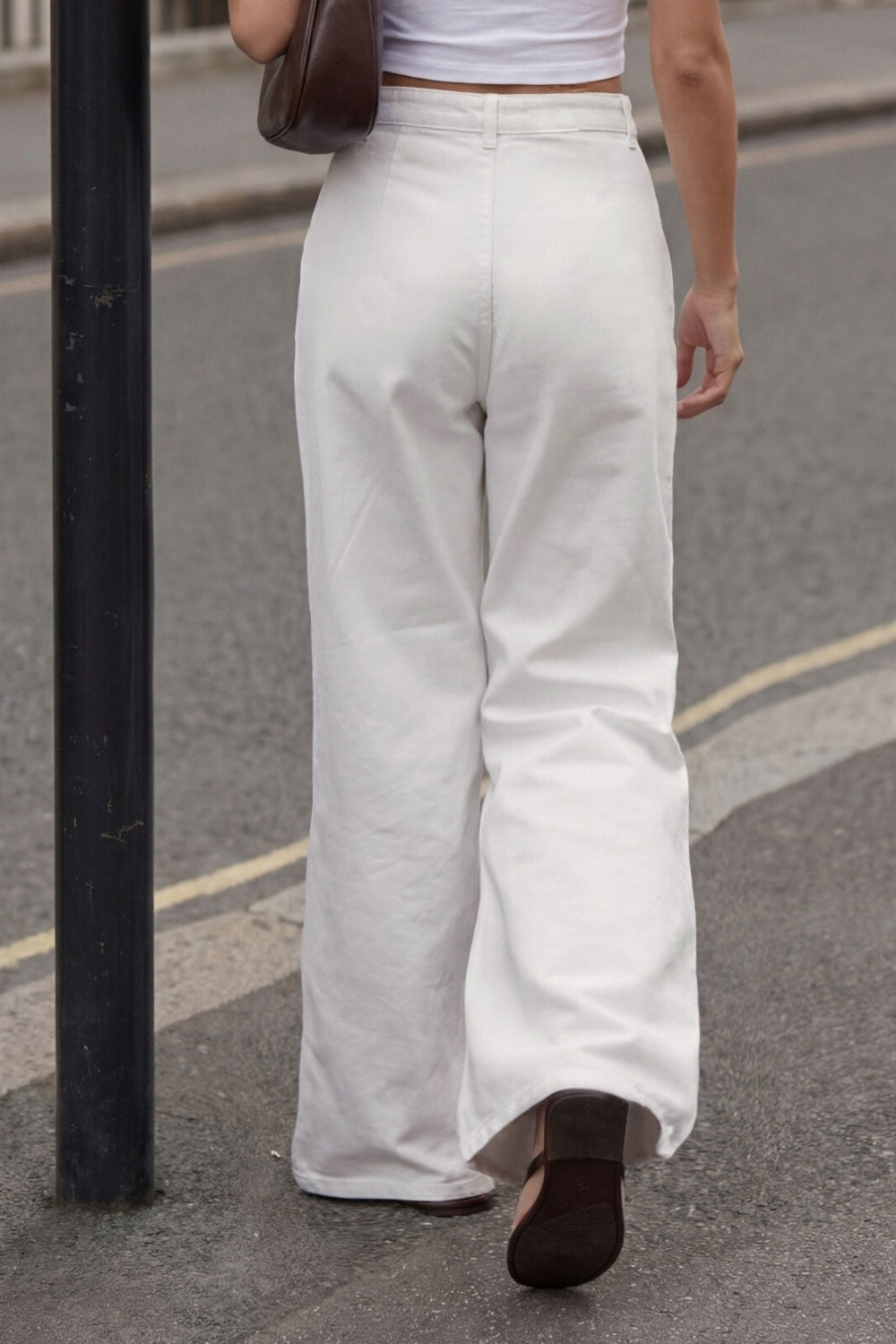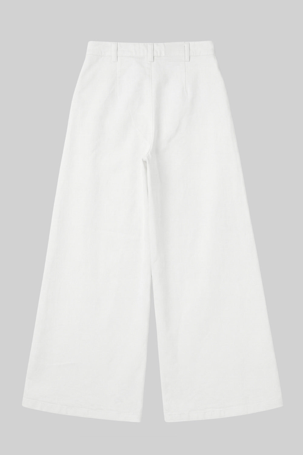 Pantalón wide leg de denim, cintura alta con pretina y trabillas, pinzas frontales, bolsillos delanteros, cierre frontal con botón y cremallera oculta.