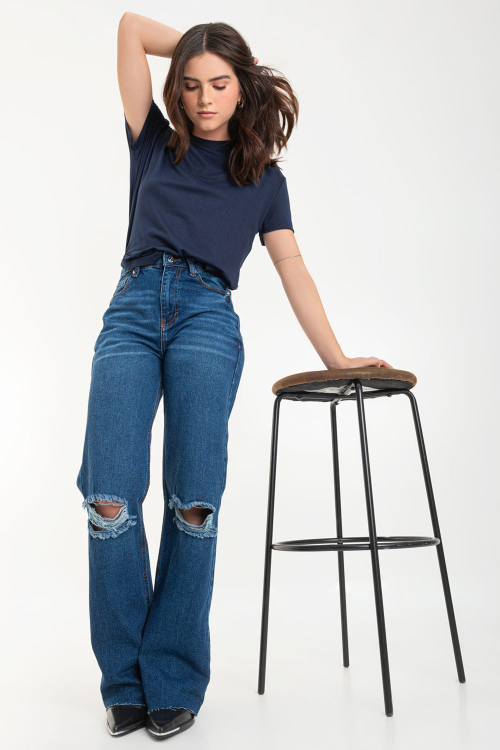 Pantalón wide leg de denim con rotos, tiro alto, bolsillos delanteros y traseros de parche. Cierre con botón y cremallera oculta. Detalle de rotos en bajo.
