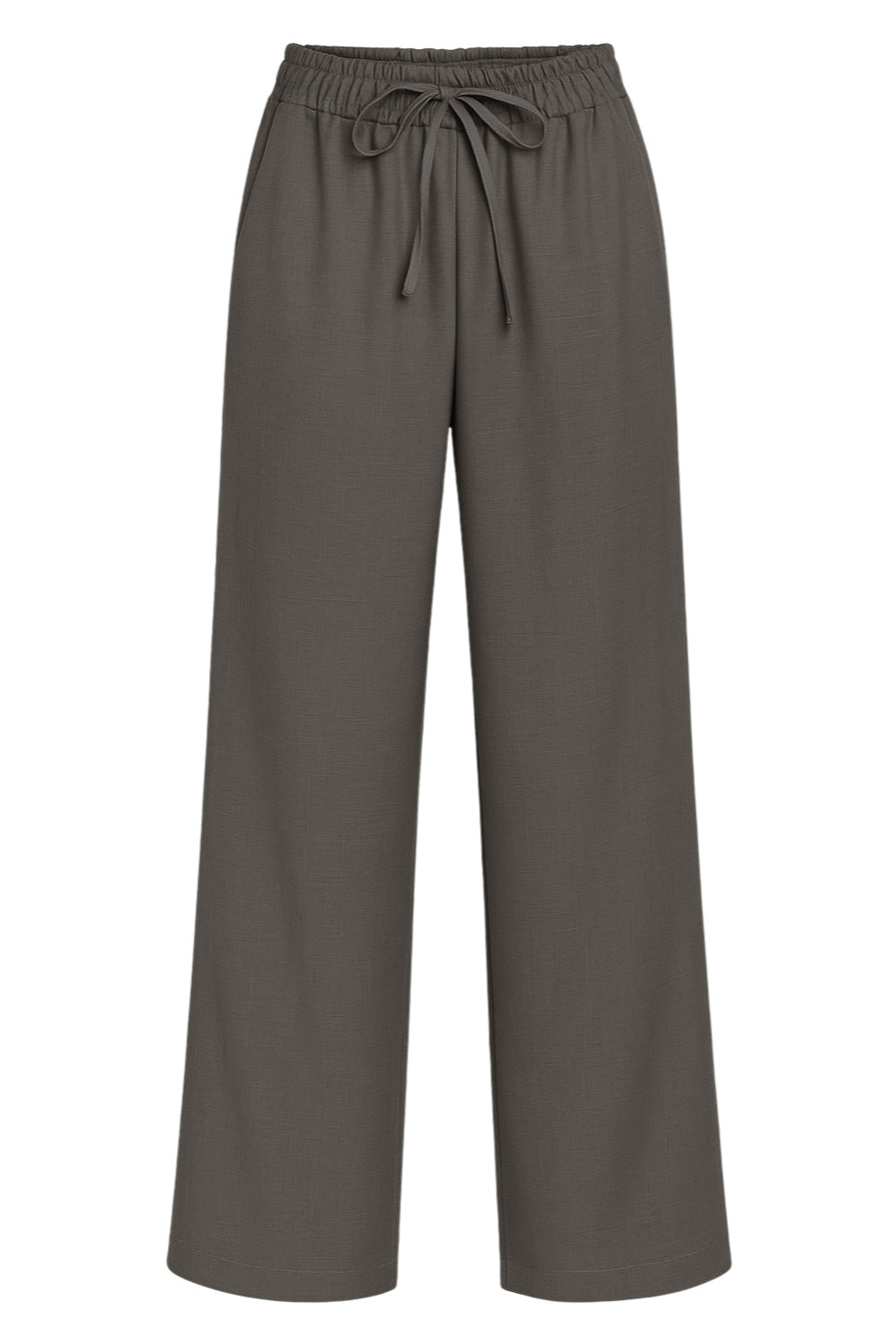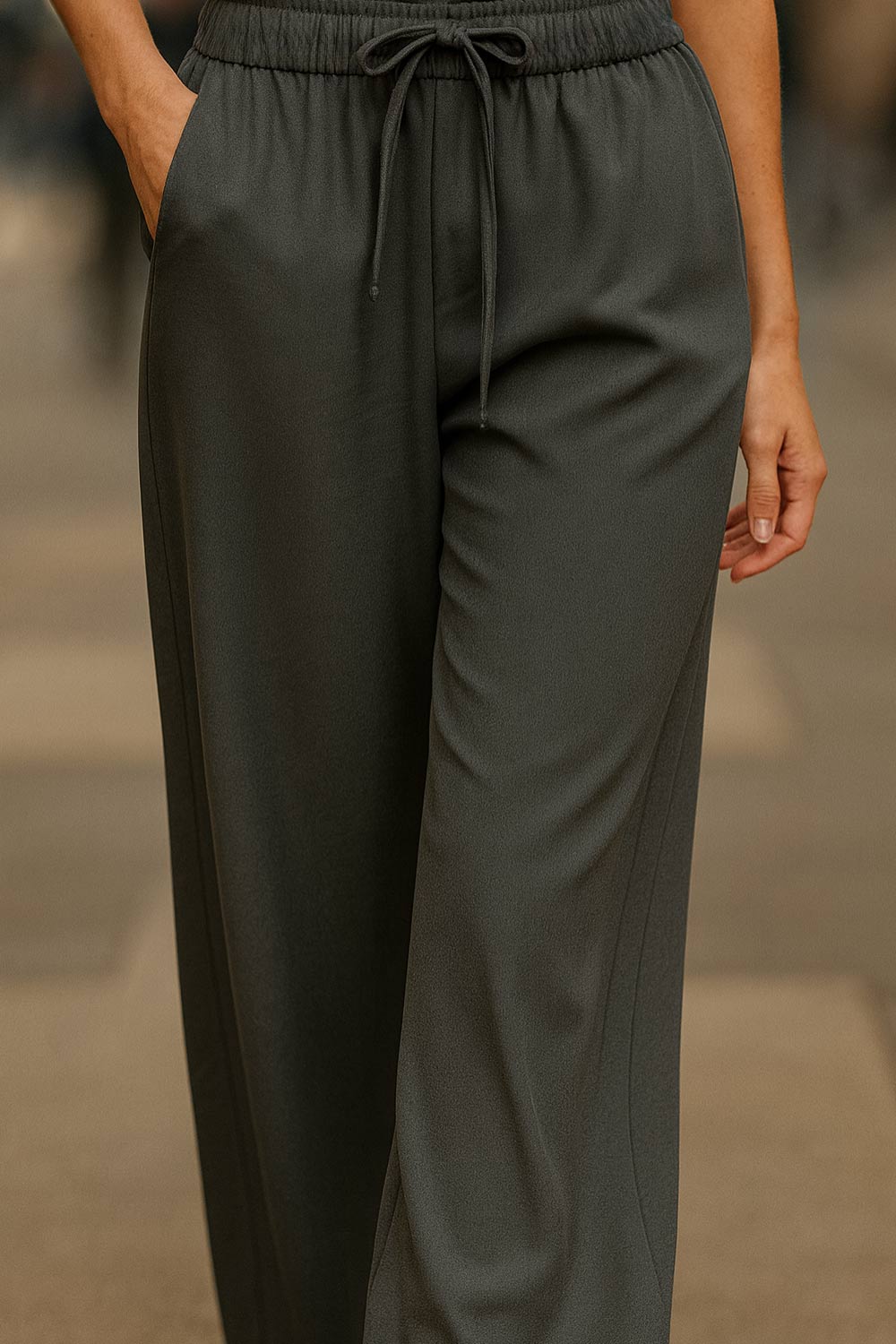 Pantalón de fit recto, cintura alta con pretina elástica, jareta frontal ajustable y bolsillos delanteros.