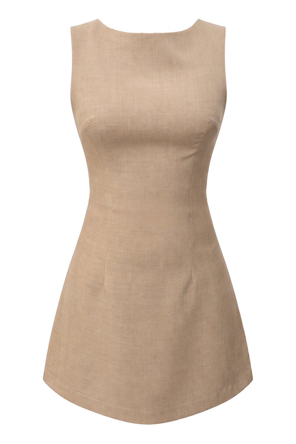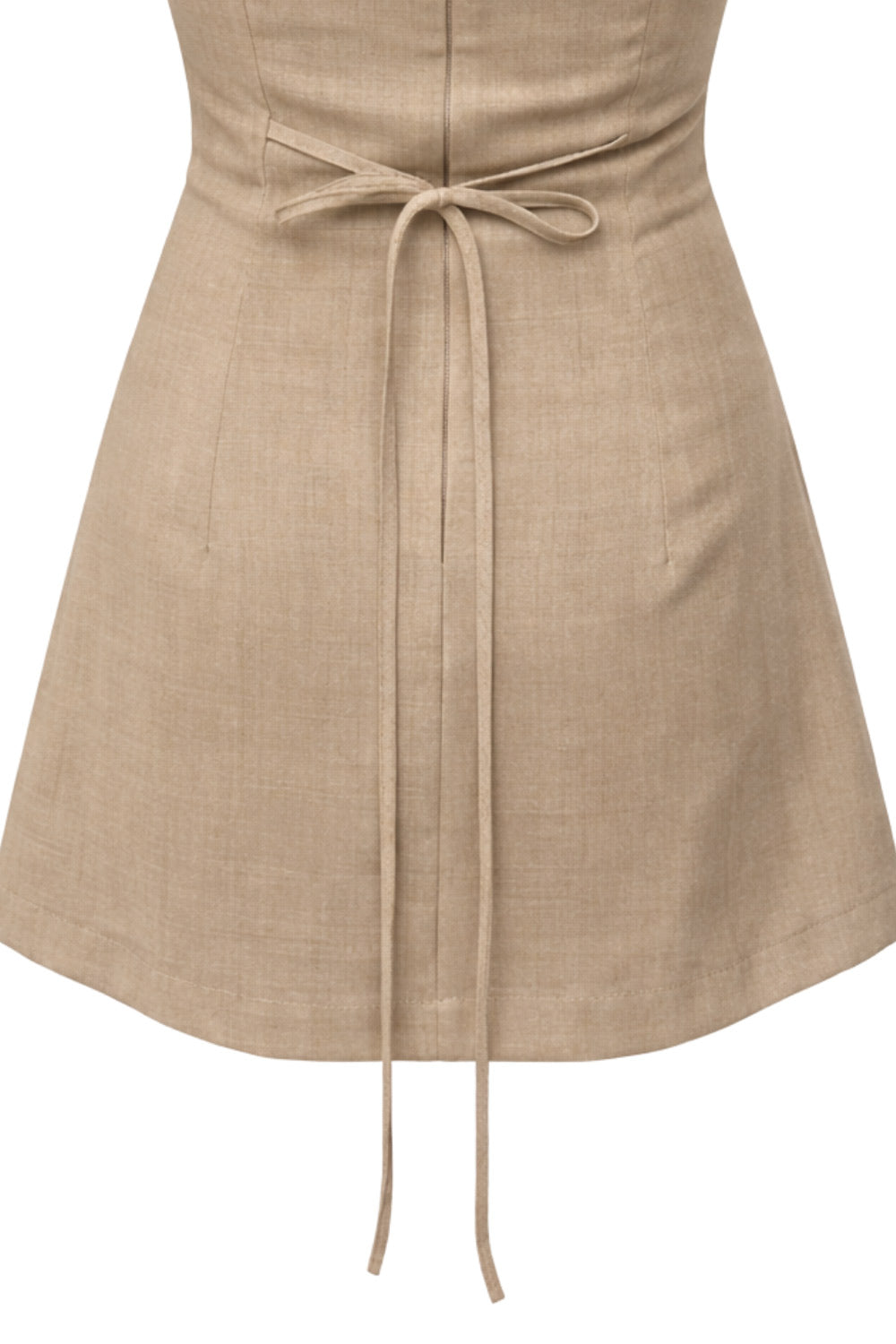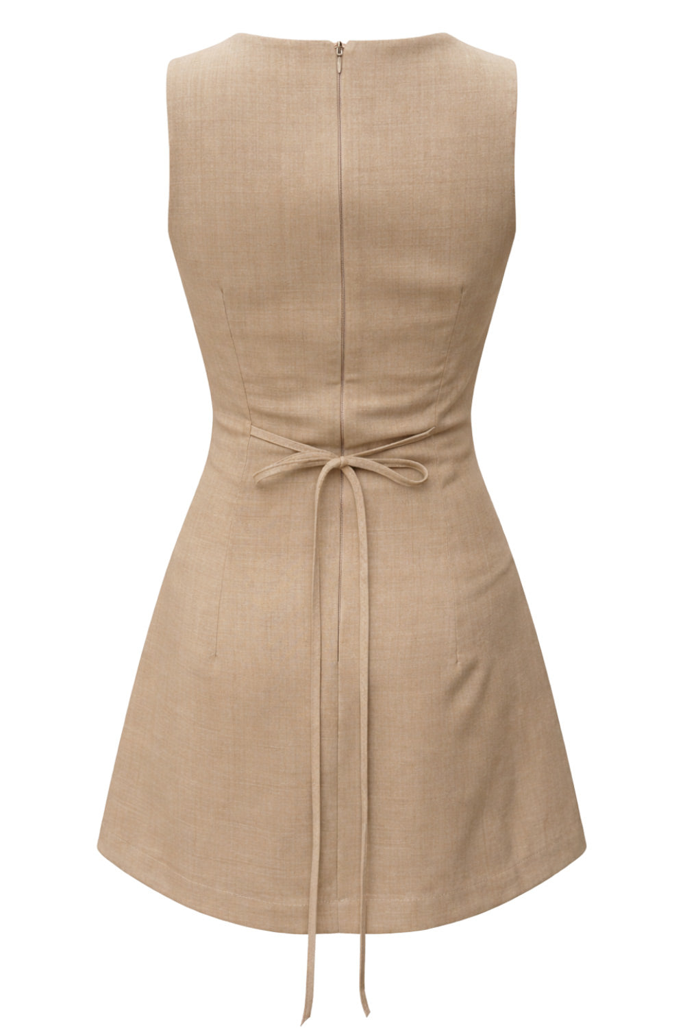 Playsuit de fit ajustado, cuello barco, sin mangas, pinzas frontales, lazo amarrable posterior y cierre con cremallera oculta.