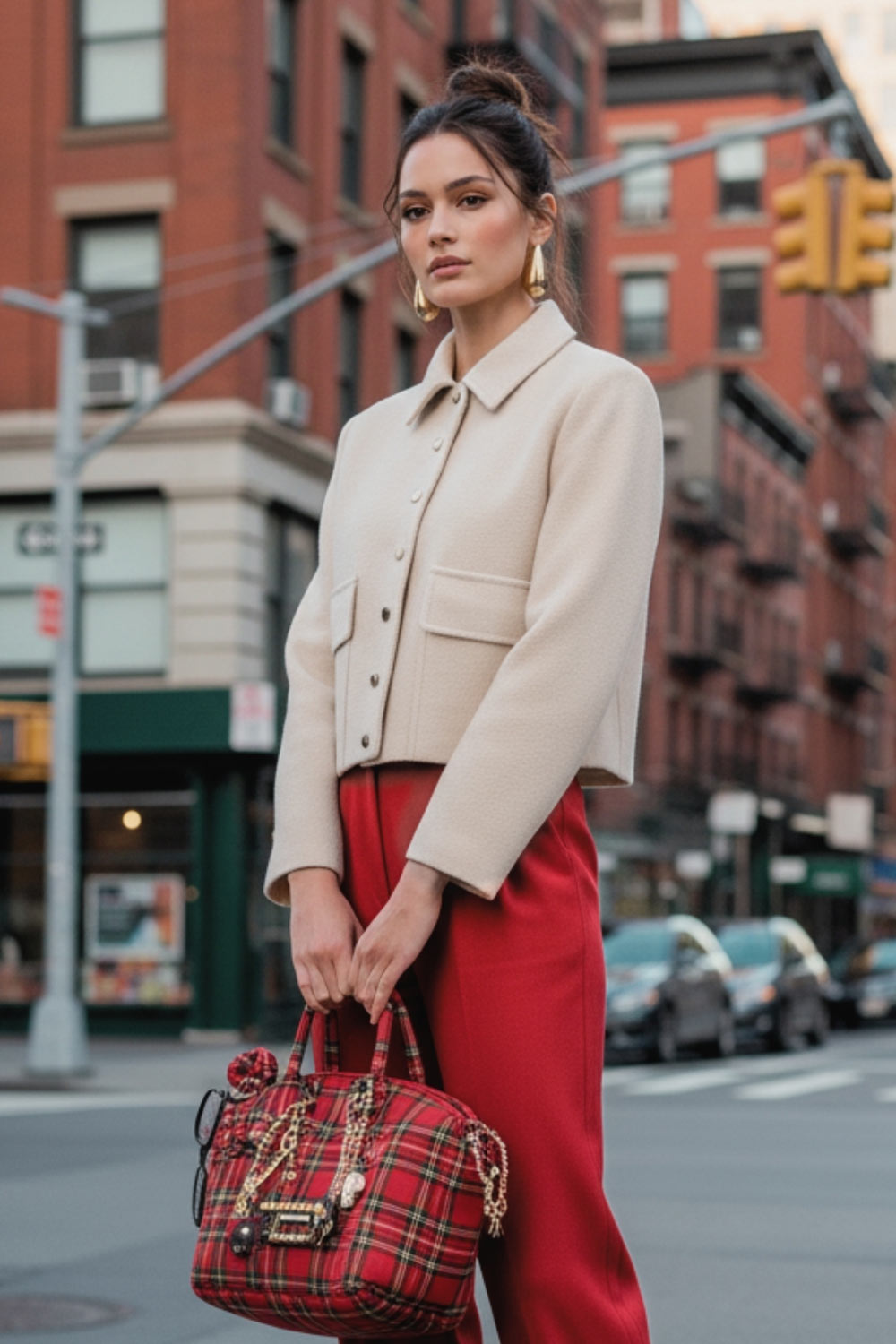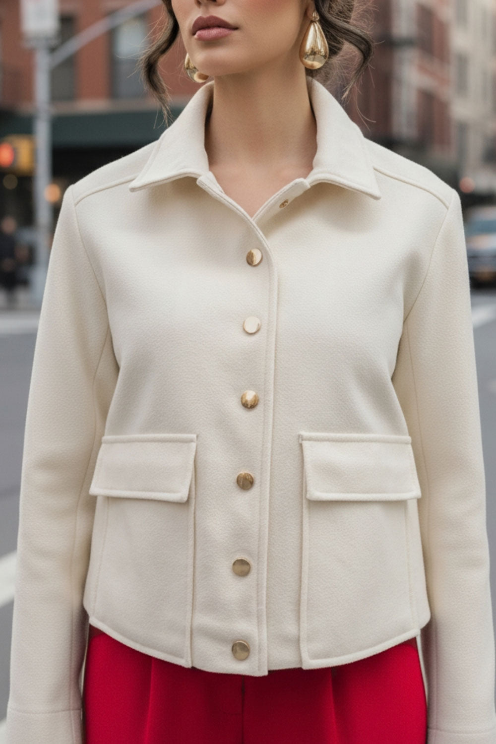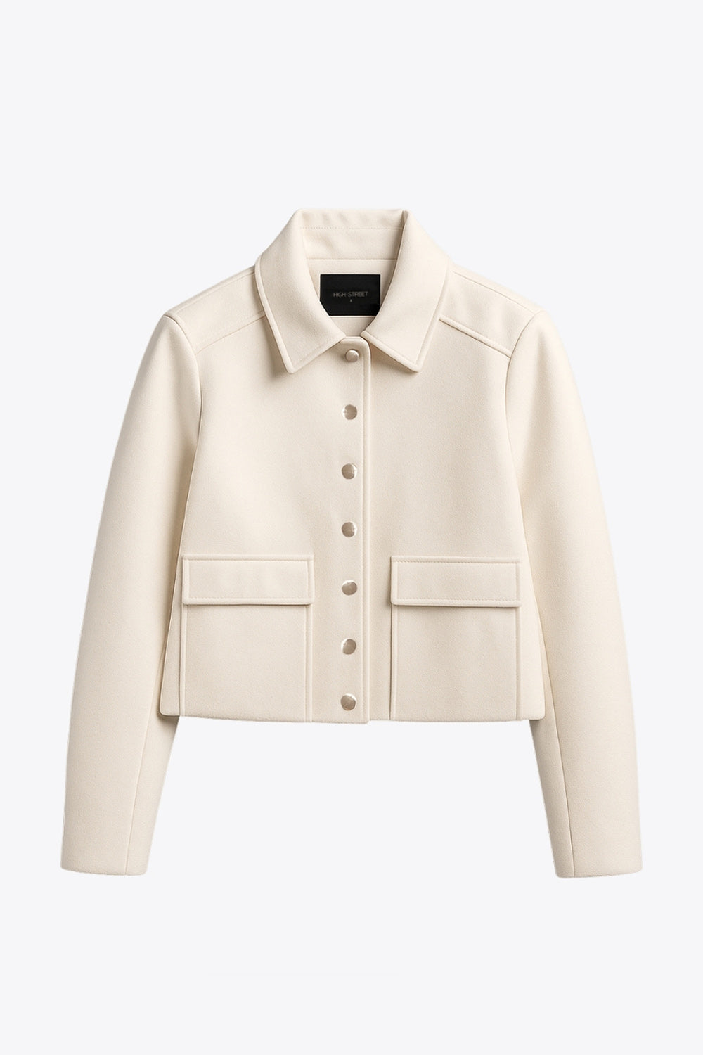 Abrigo corto de fit recto, manga larga, cuello solapa, bolsillos delanteros de parche con cartera y cierre frontal con hilera de botones en contraste.