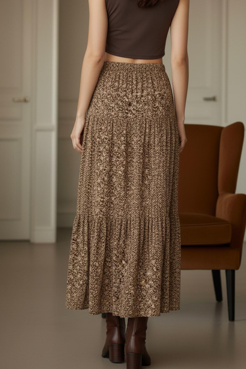 Falda midi de estampado floral, cintura alta con pretina elástica, corte en a y capas de olanes en bajo.