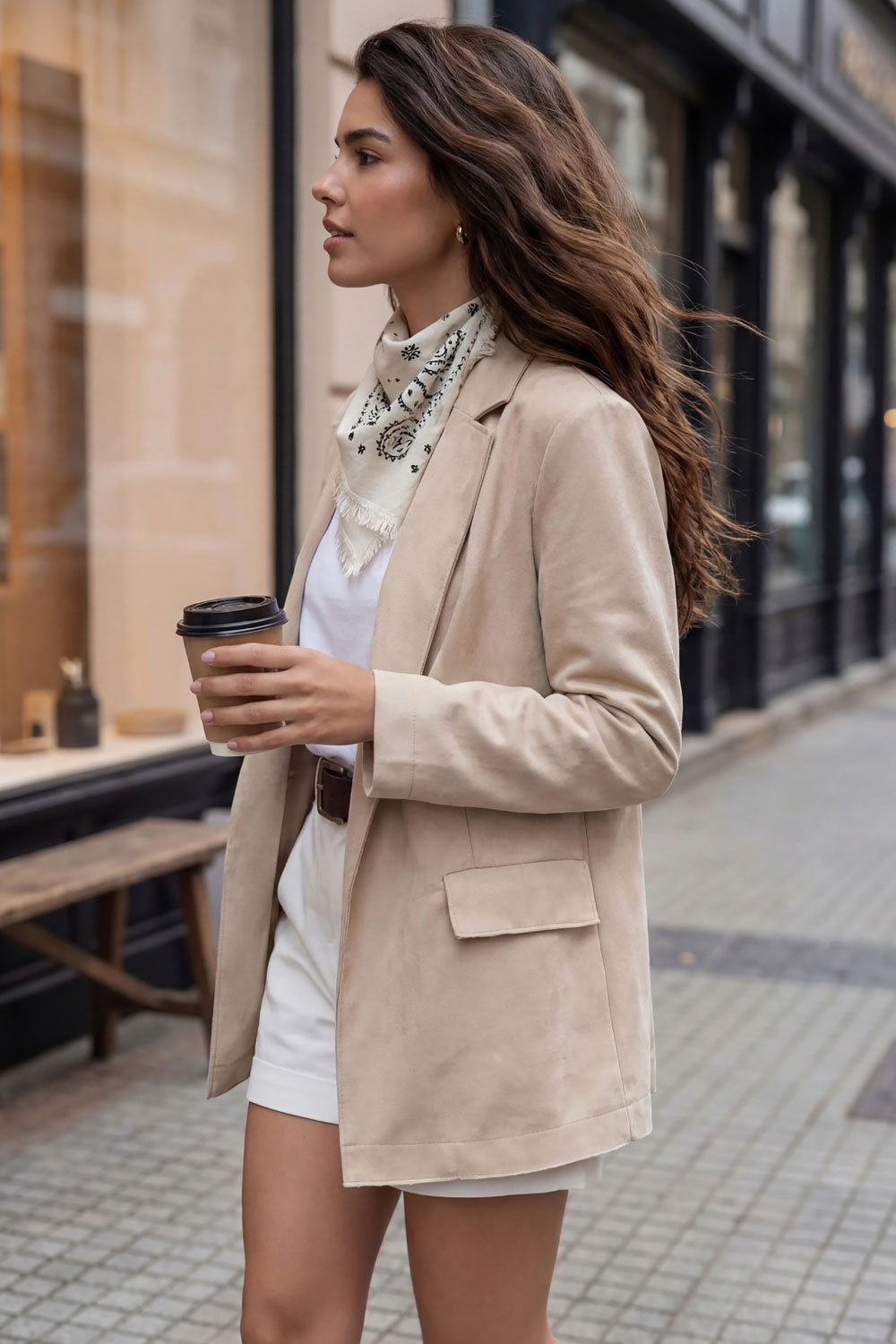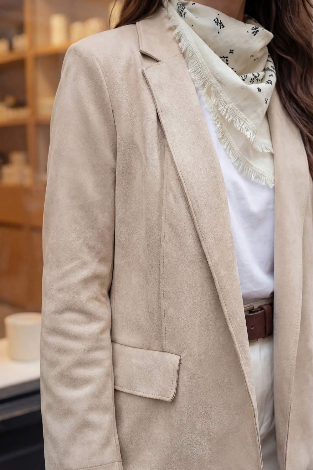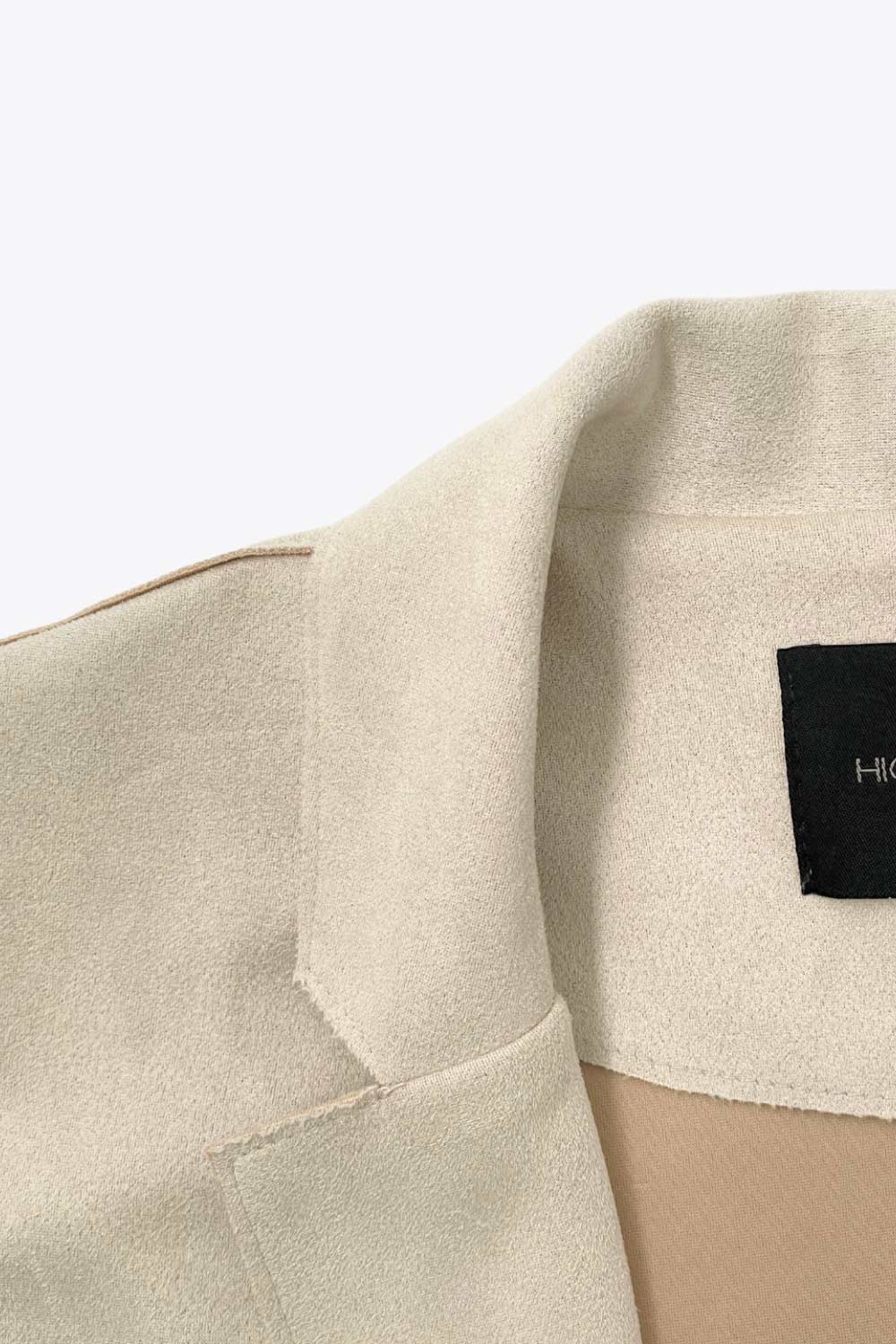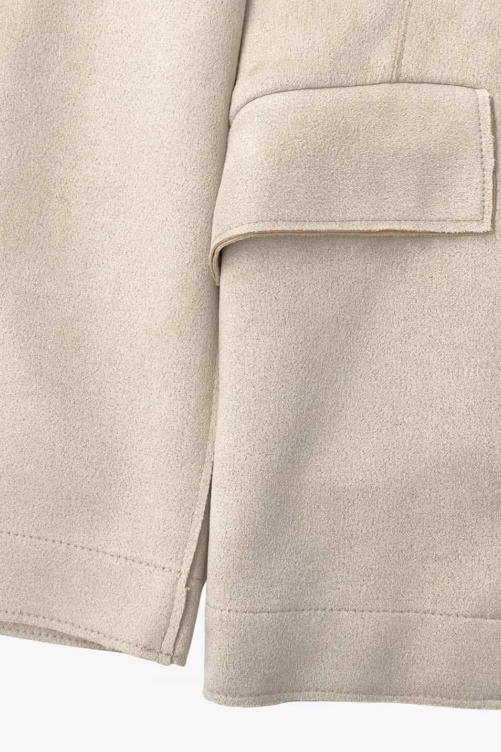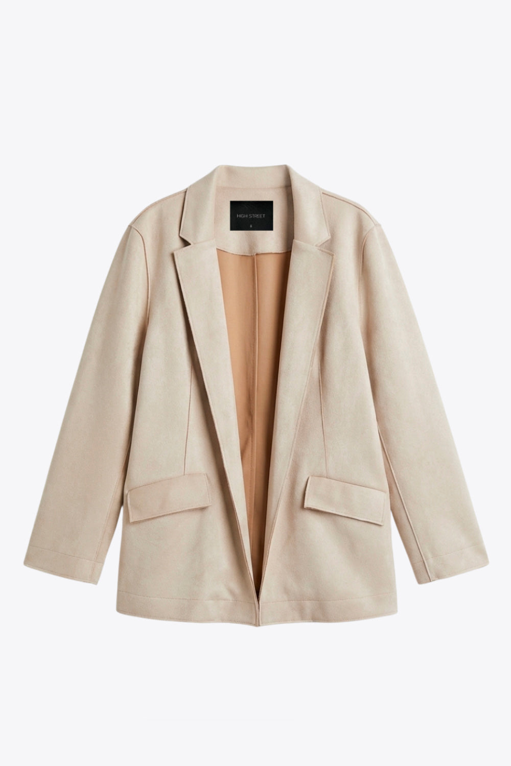 Blazer abierto de gamuza, fit recto, con solapa, manga larga y bolsillos delanteros con cartera.