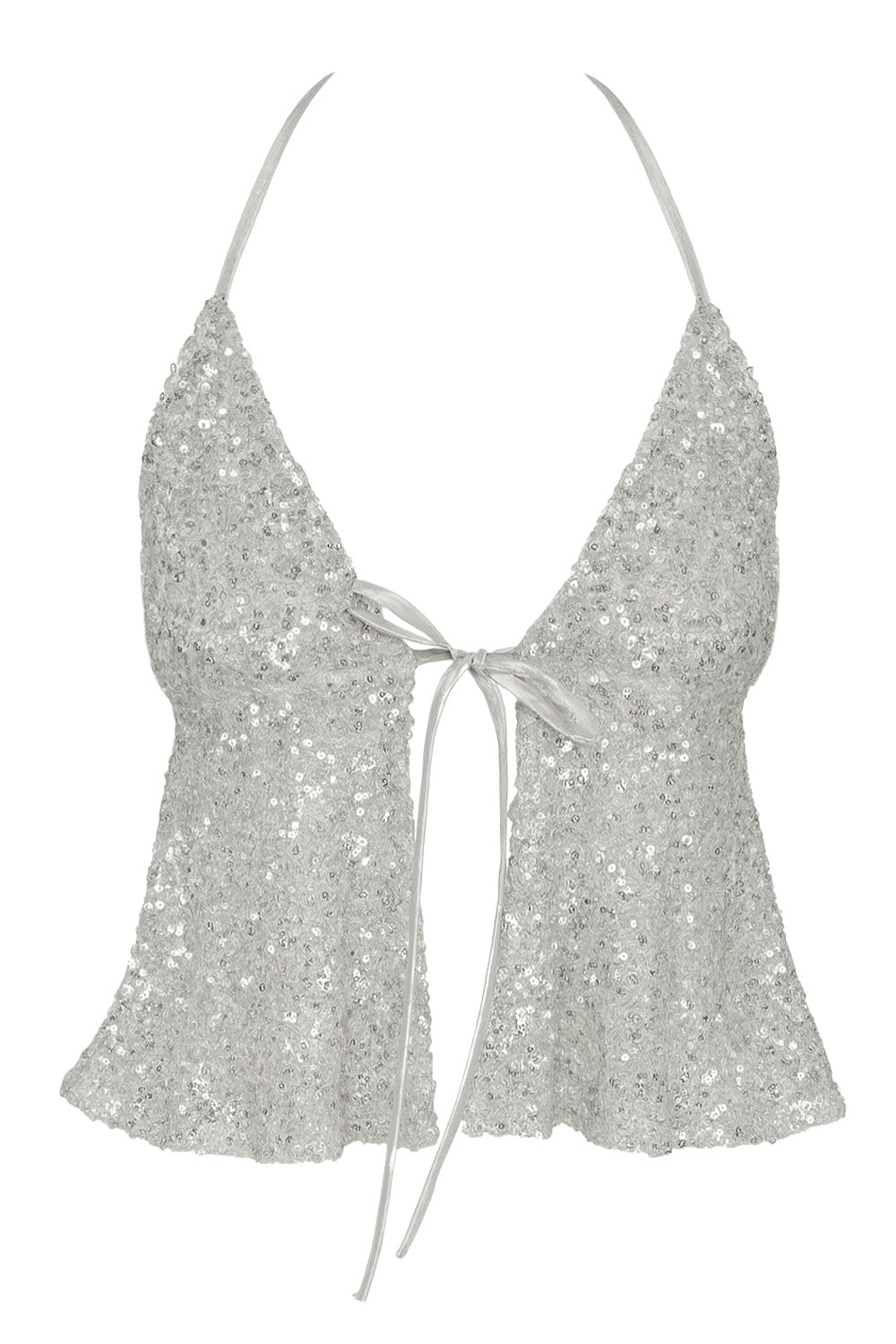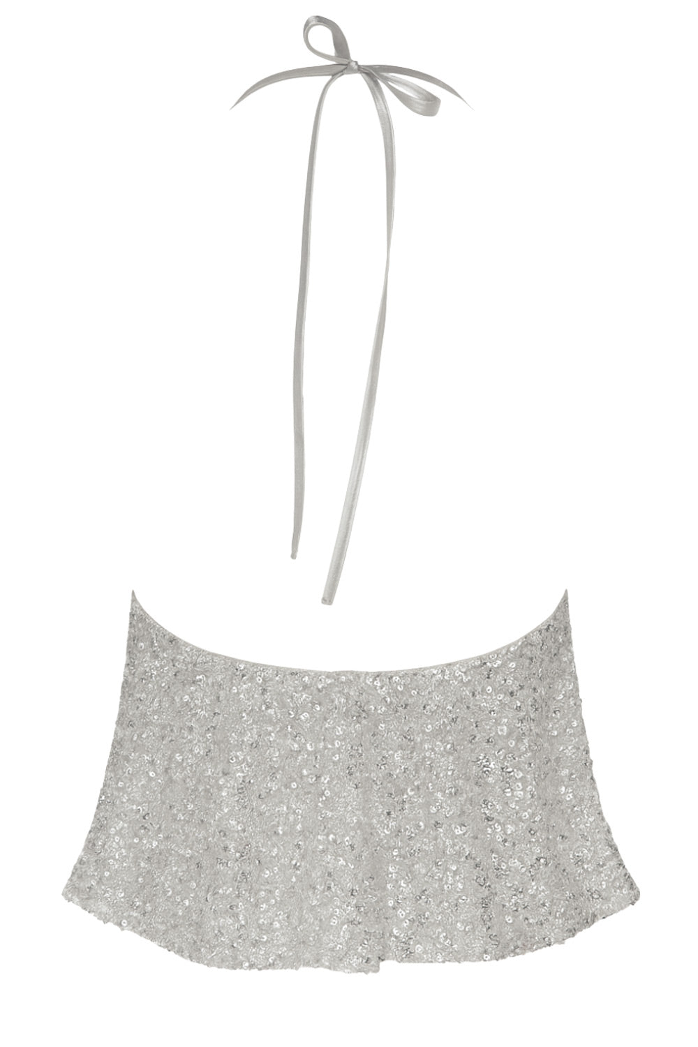 Top corto de lentejuelas, escote v con lazo amarrable frontal, rib elástico en espalda, tirantes halter con lazo amarrable posterior y abertura frontal en bajo. Detalle de peplum olanes en bajo.