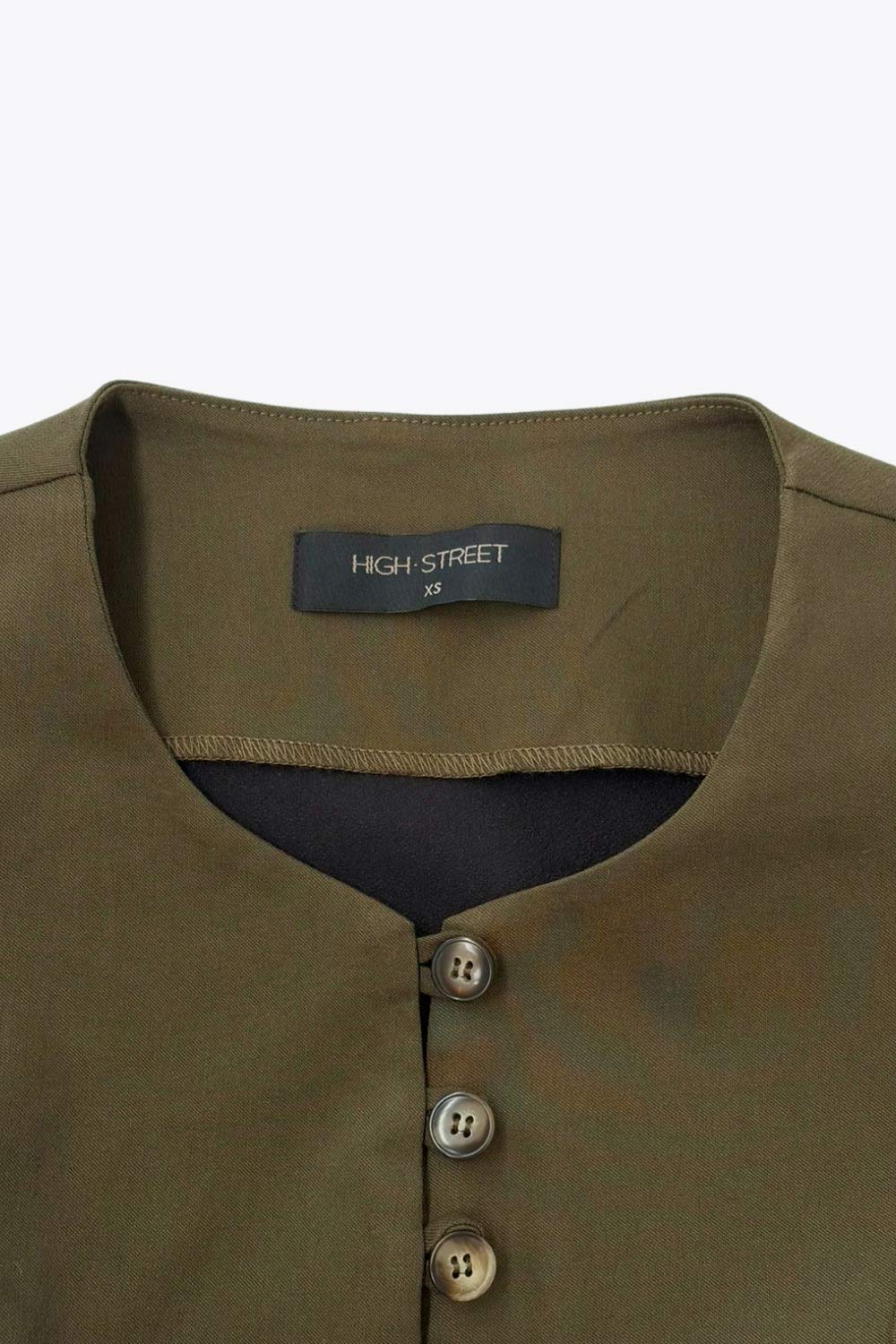 Chaleco de fit ajustado, cuello redondo, cierre frontal con hilera de botones en contraste, con abertura frontal en bajo y detalle de lazado ajustable en espalda.