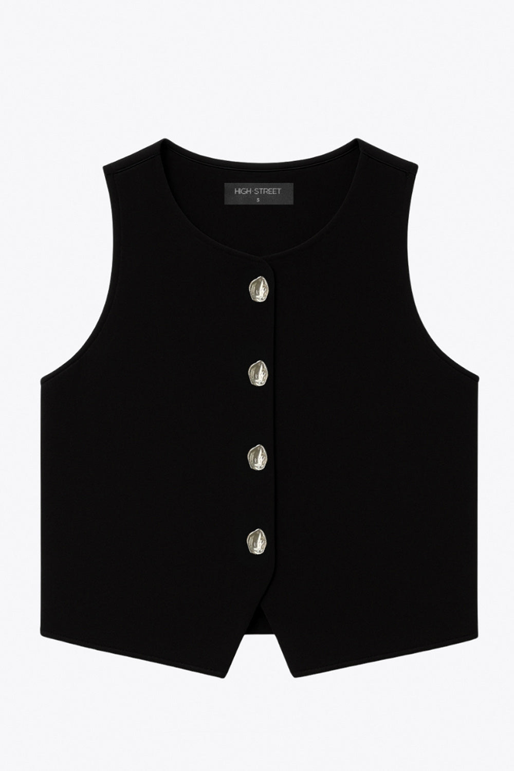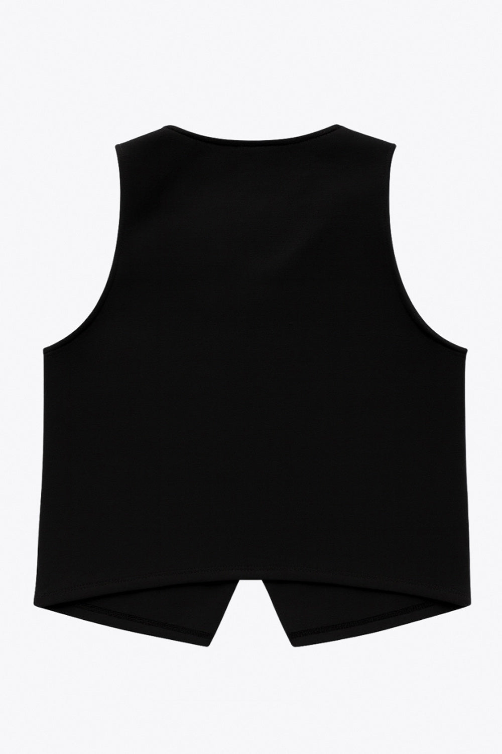 Chaleco corto de fit recto, cuello redondo, bajo frontal con abertura en v y cierre con hilera de botones en contraste.