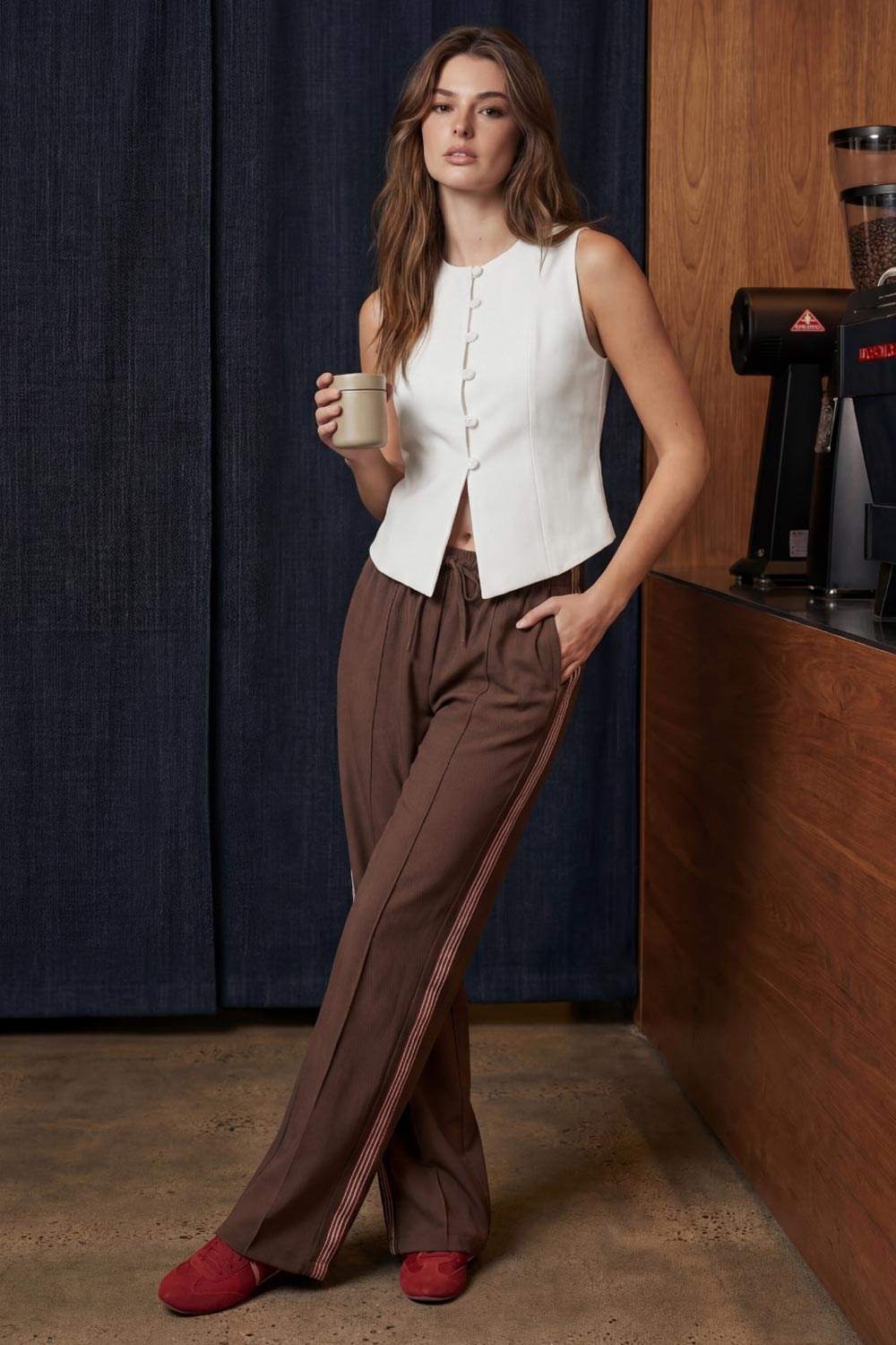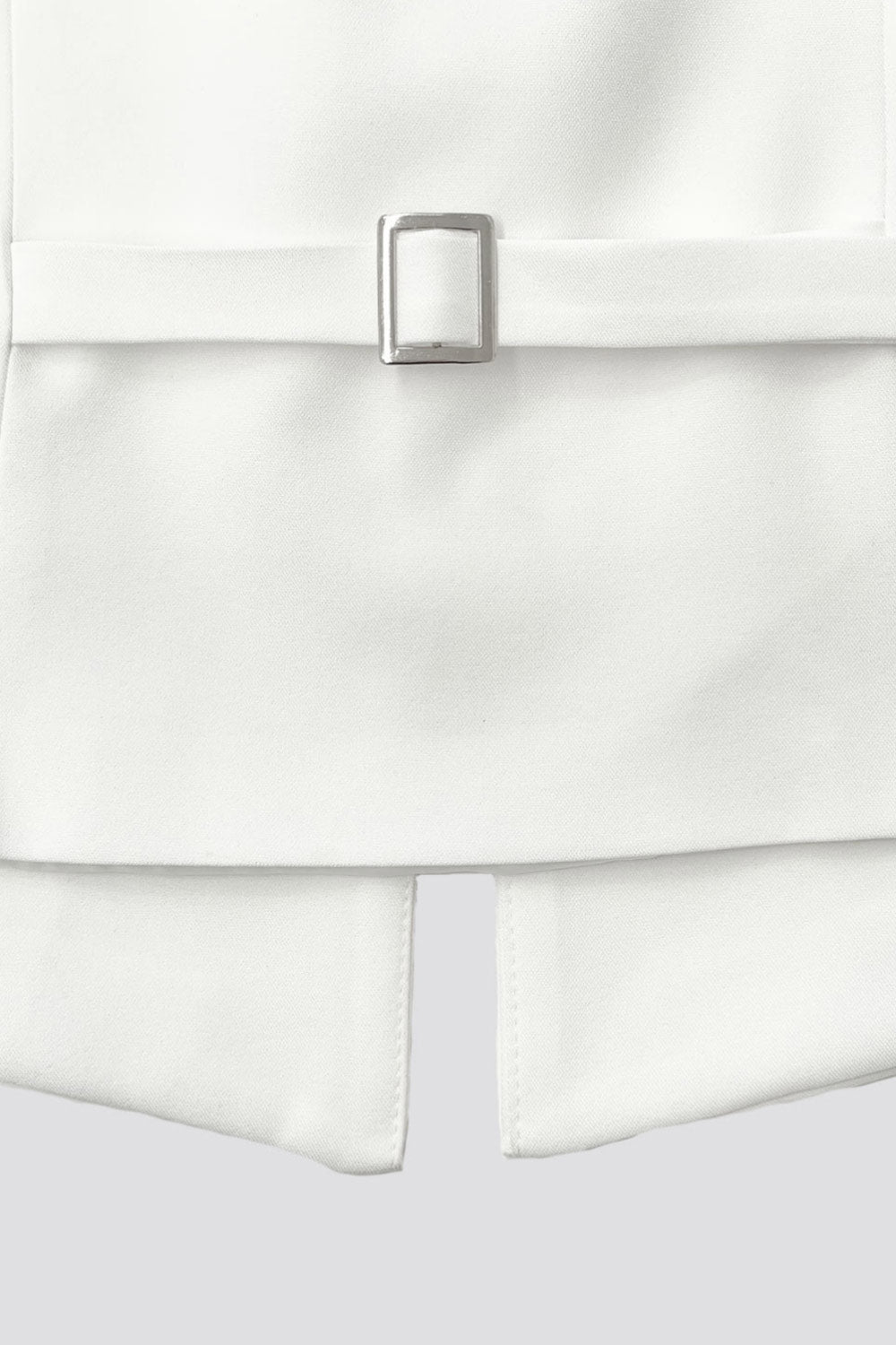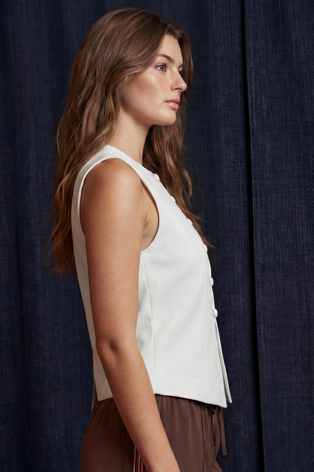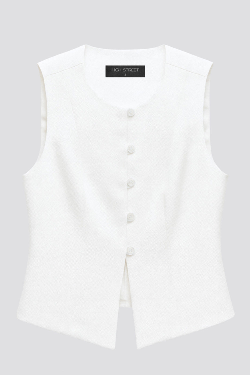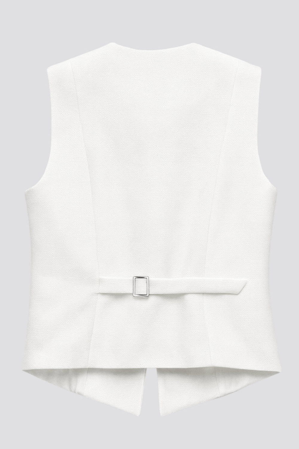 Chaleco ajustado con pinzas, cuello redondo, bajo v frontal con abertura y cierre con hilera de botones. Detalle de trabilla con hebilla posterior en contraste.