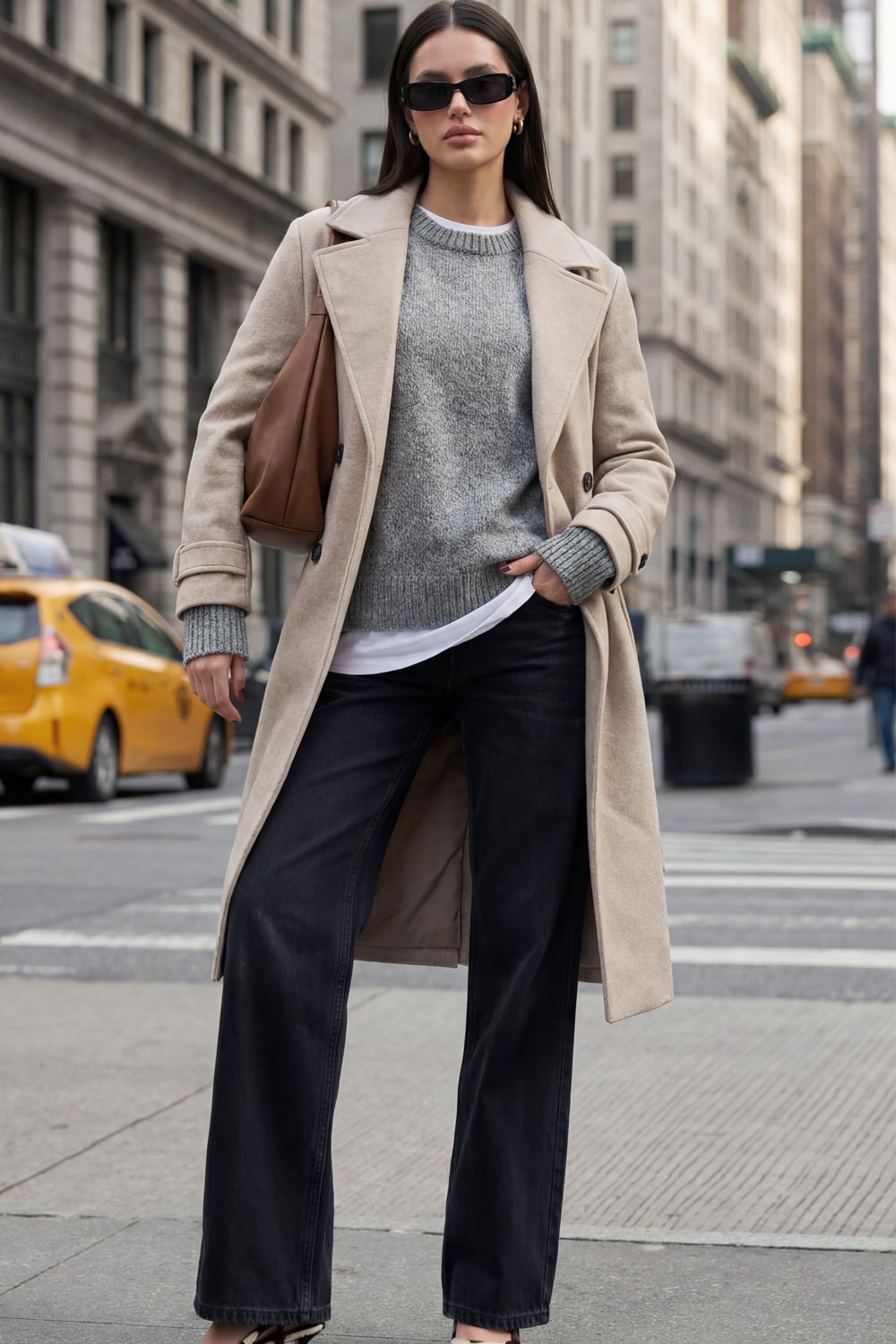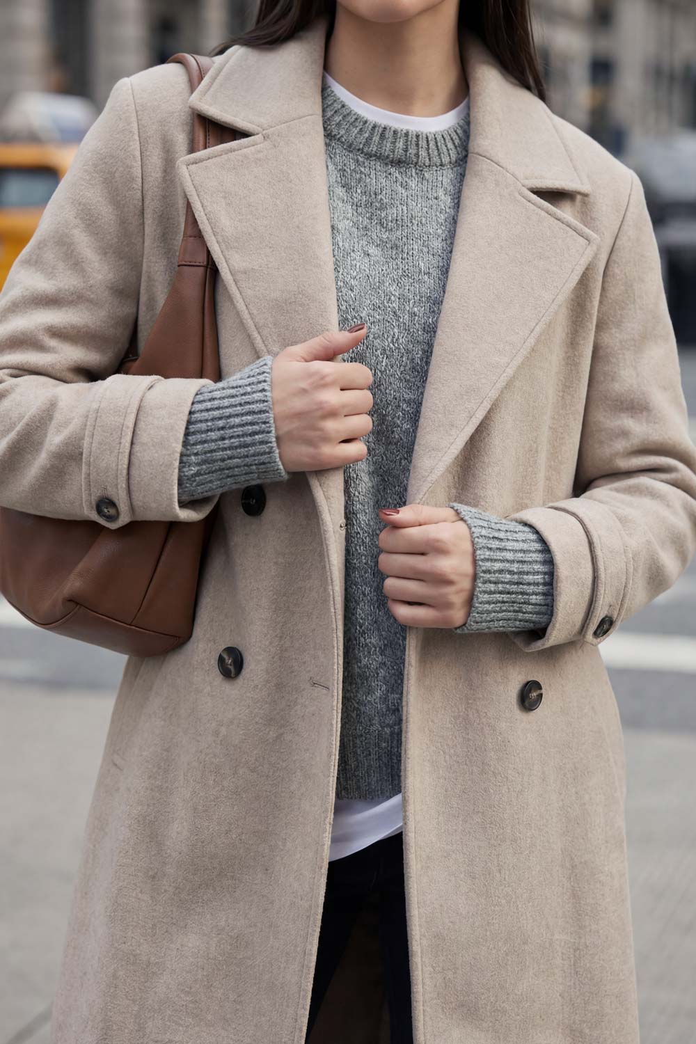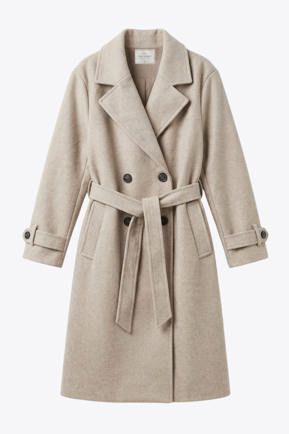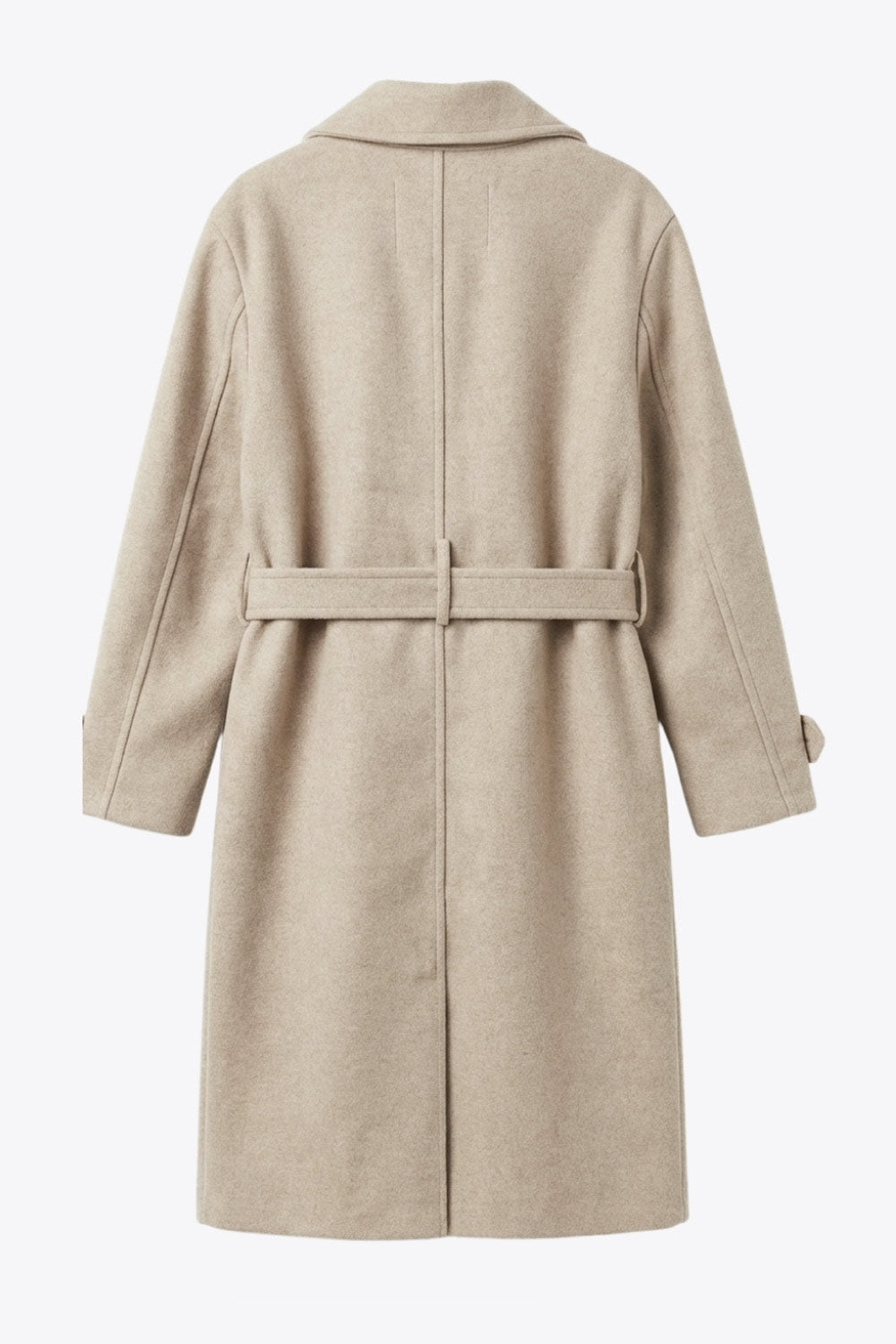 Abrigo largo cruzado de fit recto, con solapa, manga larga con trabilla y botón en puño, bolsillos delanteros con vivos, cierre frontal con doble cruce de botones en contraste y abertura posterior.