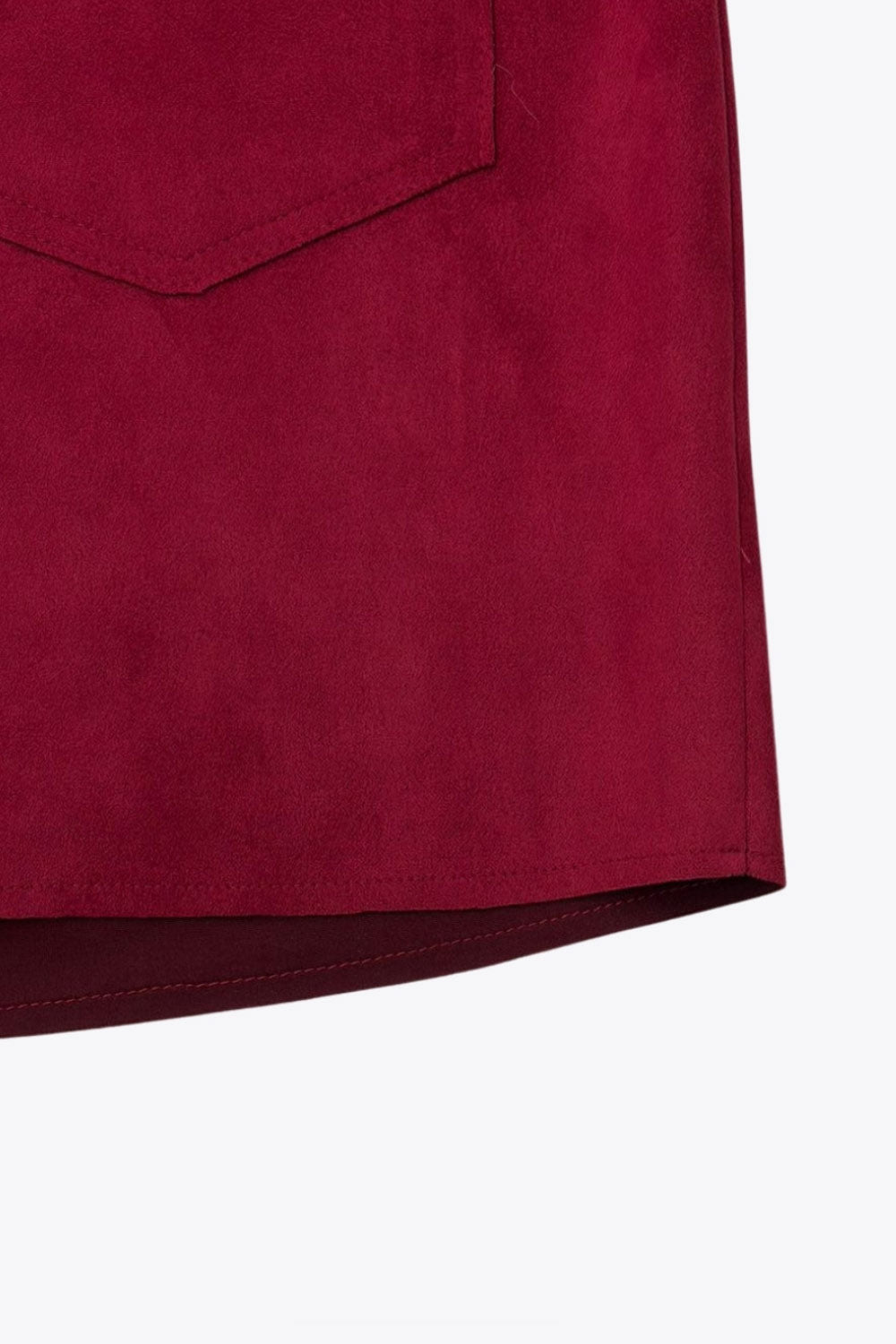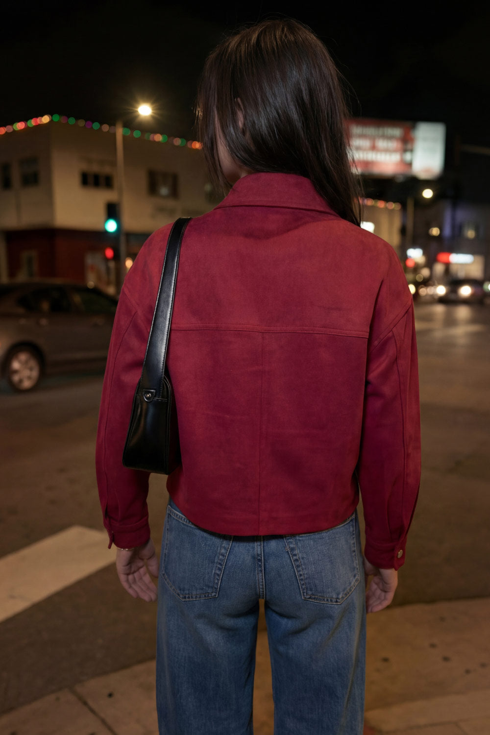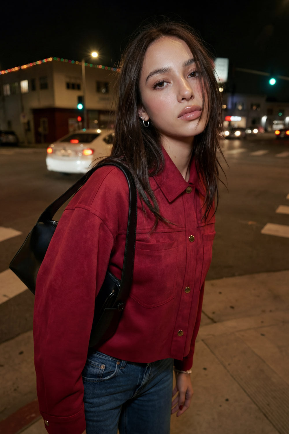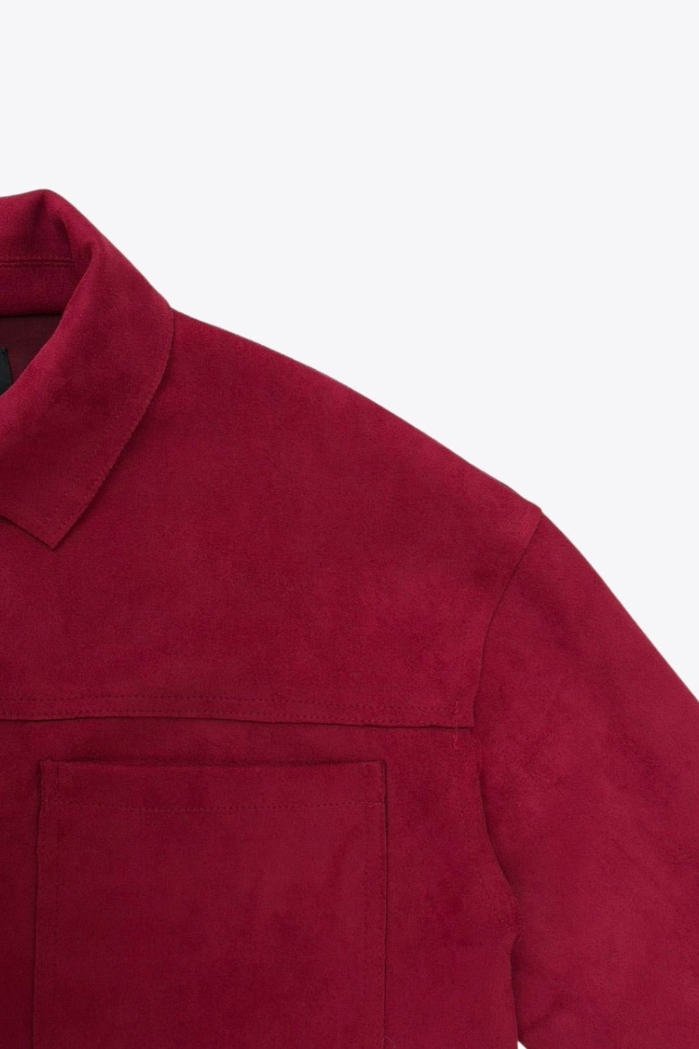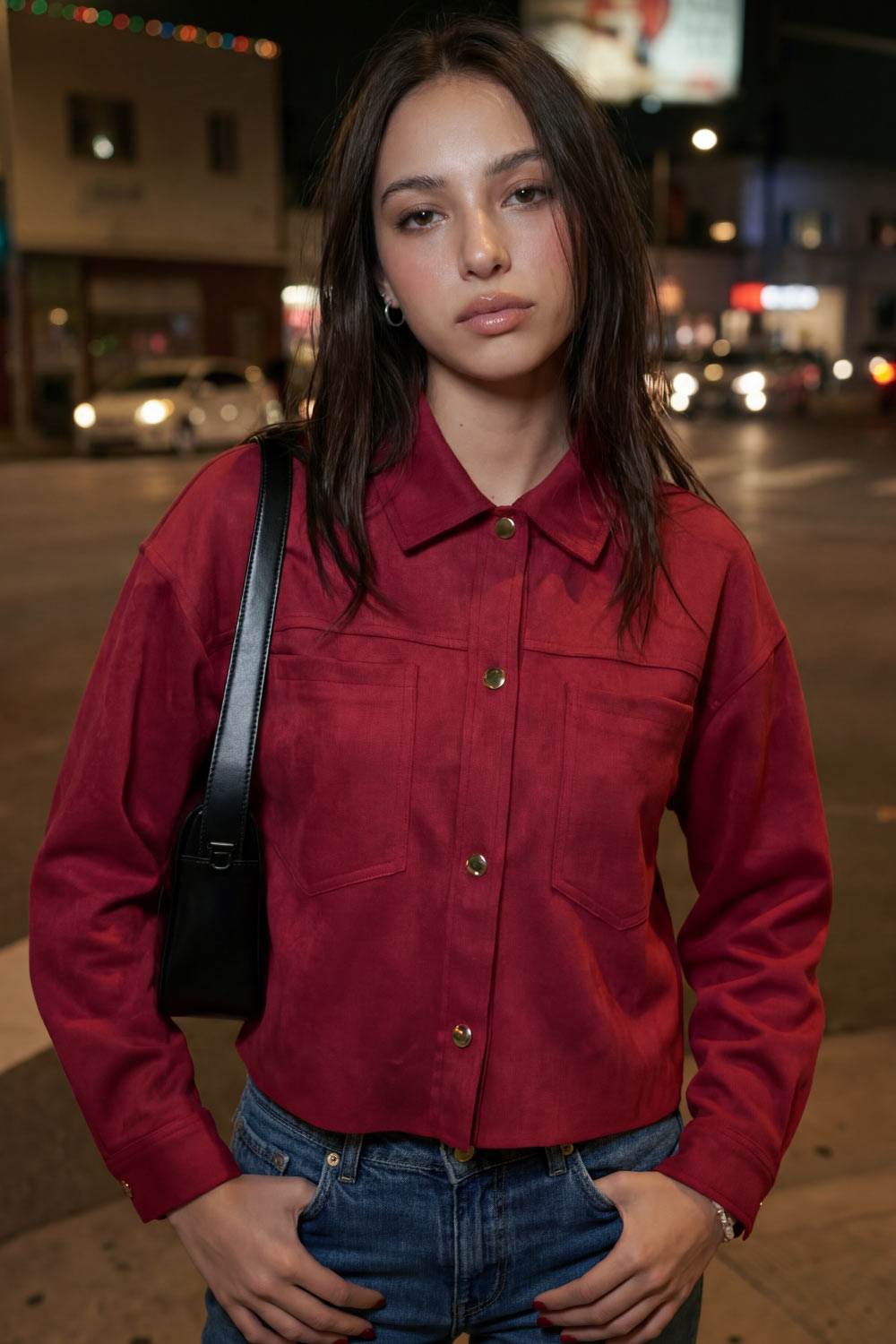 Chamarra corta de gamuza, fit oversized, cuello camisero, manga larga con puño abotonado, corte de bata frontal y posterior, bolsillos frontales de parche y cierre frontal con hilera de botones en contraste.