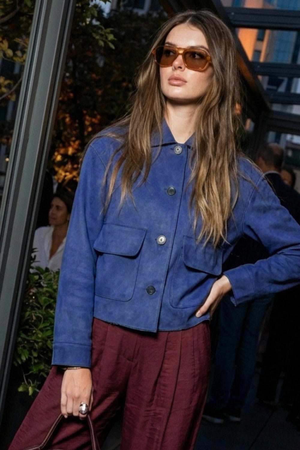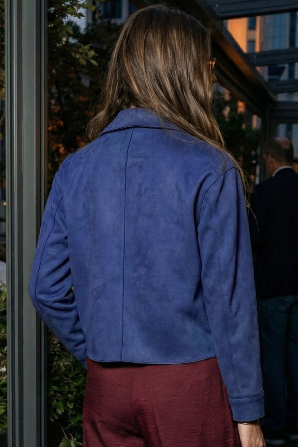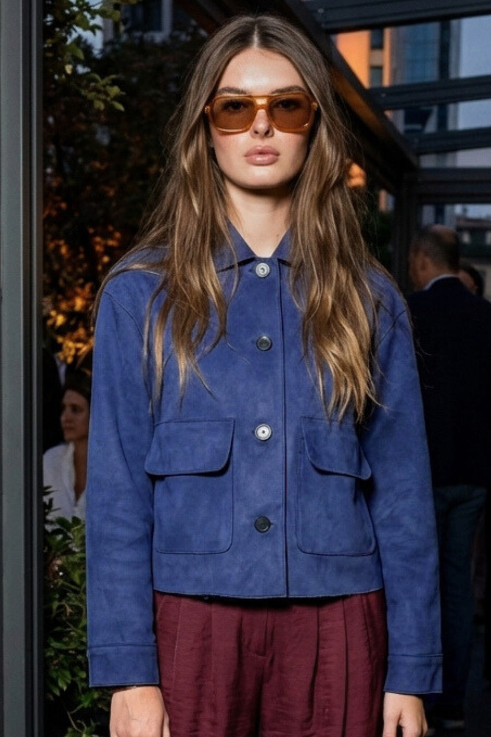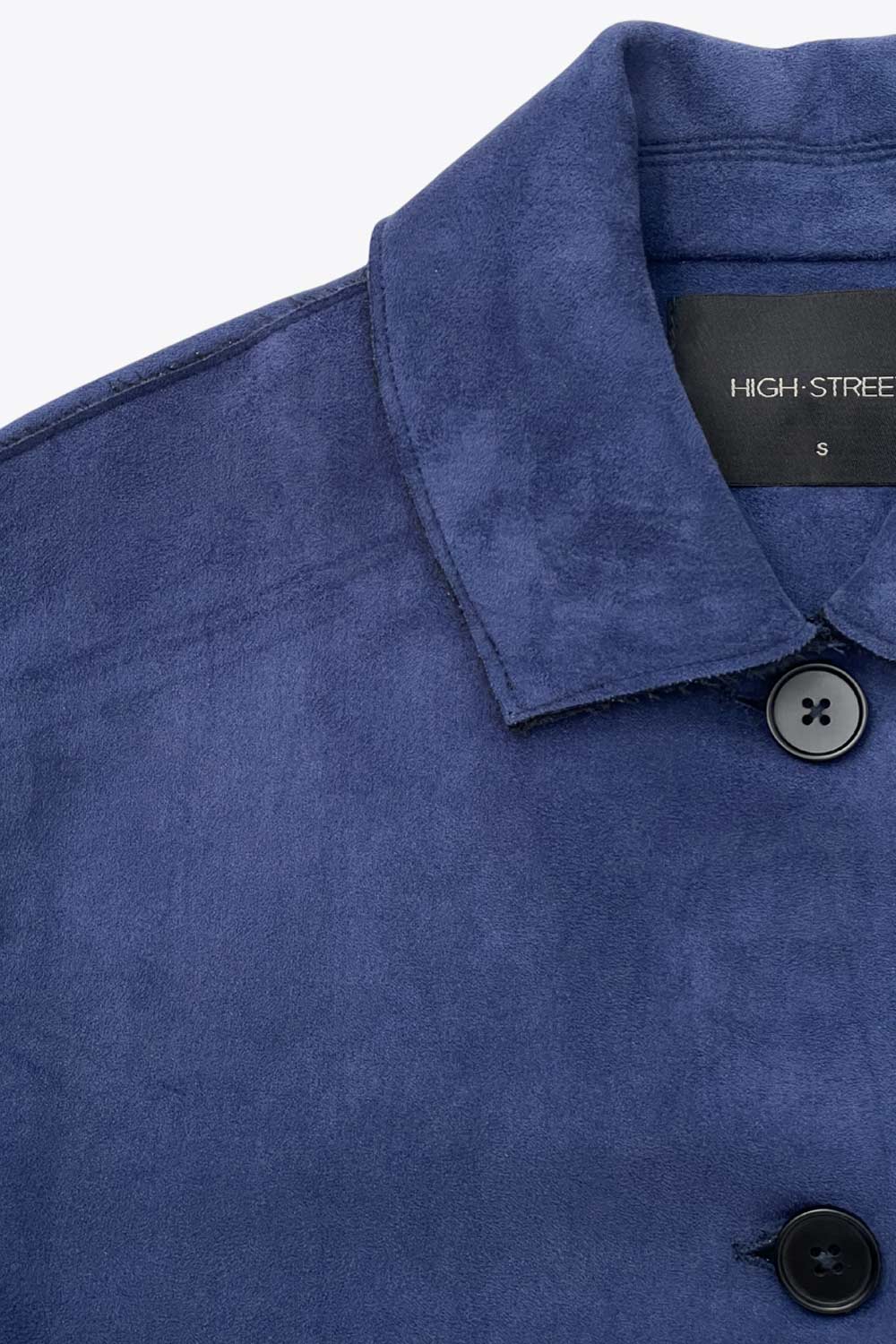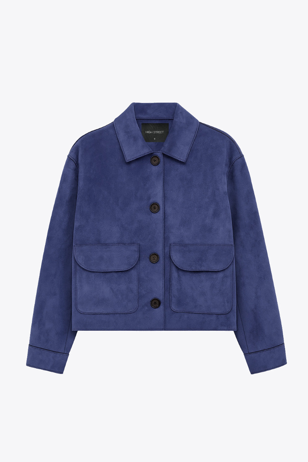 Chamarra corta de gamuza, fit recto, manga larga con puño abotonado, cuello camisero con detalle curveado, bolsillos delanteros con cartera y cierre frontal con hilera de botones en contraste.