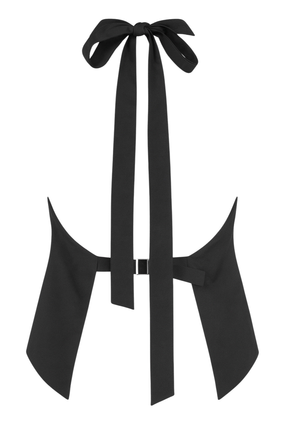 Blusa de fit fluido, cuello halter con nudo amarrable posterior, escote en espalda y cierre posterior con trabilla ajustable.