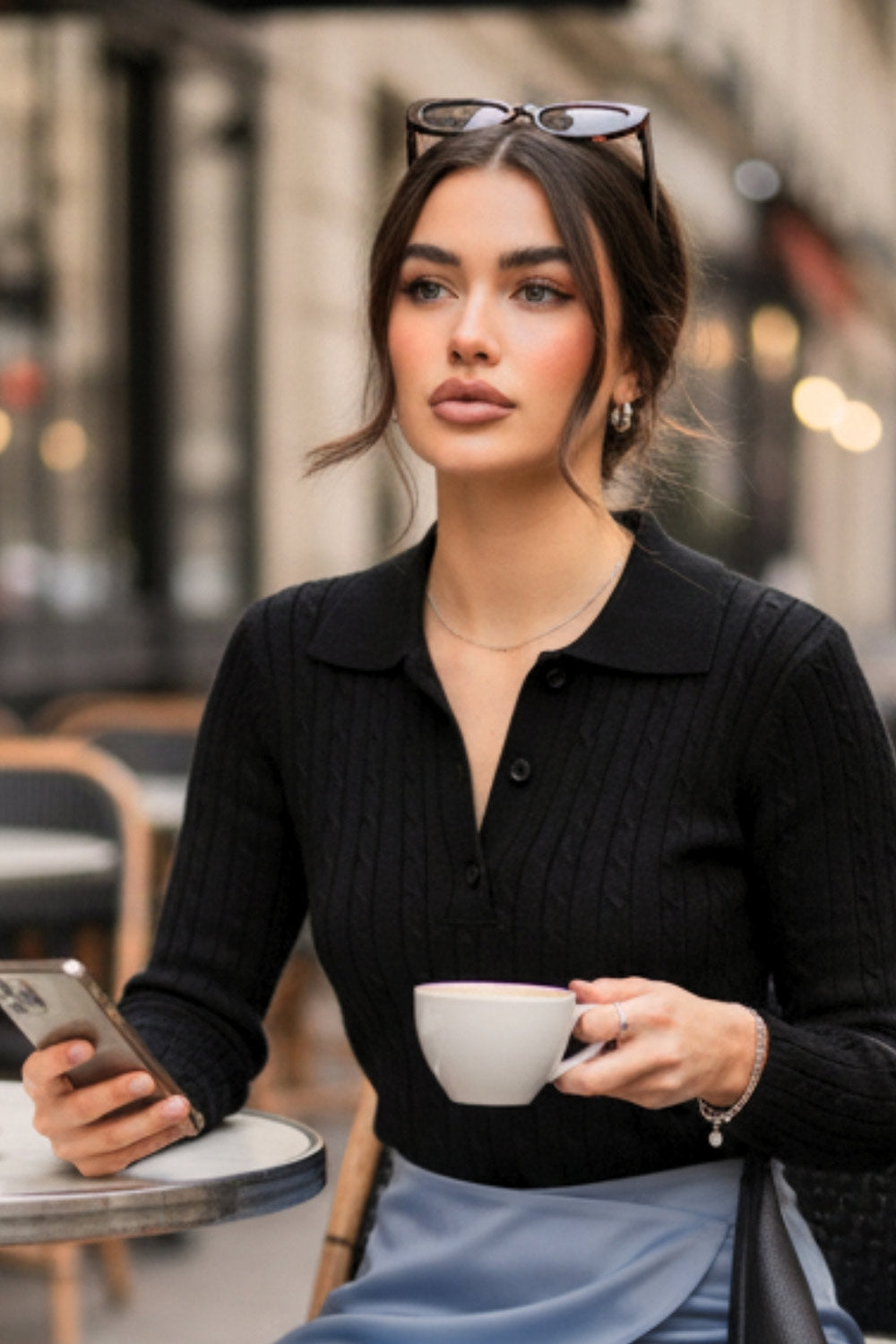 Top canalé de punto, fit ajustado, manga larga, cuello polo con botones, rib en bajo y puños. y escote v con cuello polo. Detalle de textura en tejido.