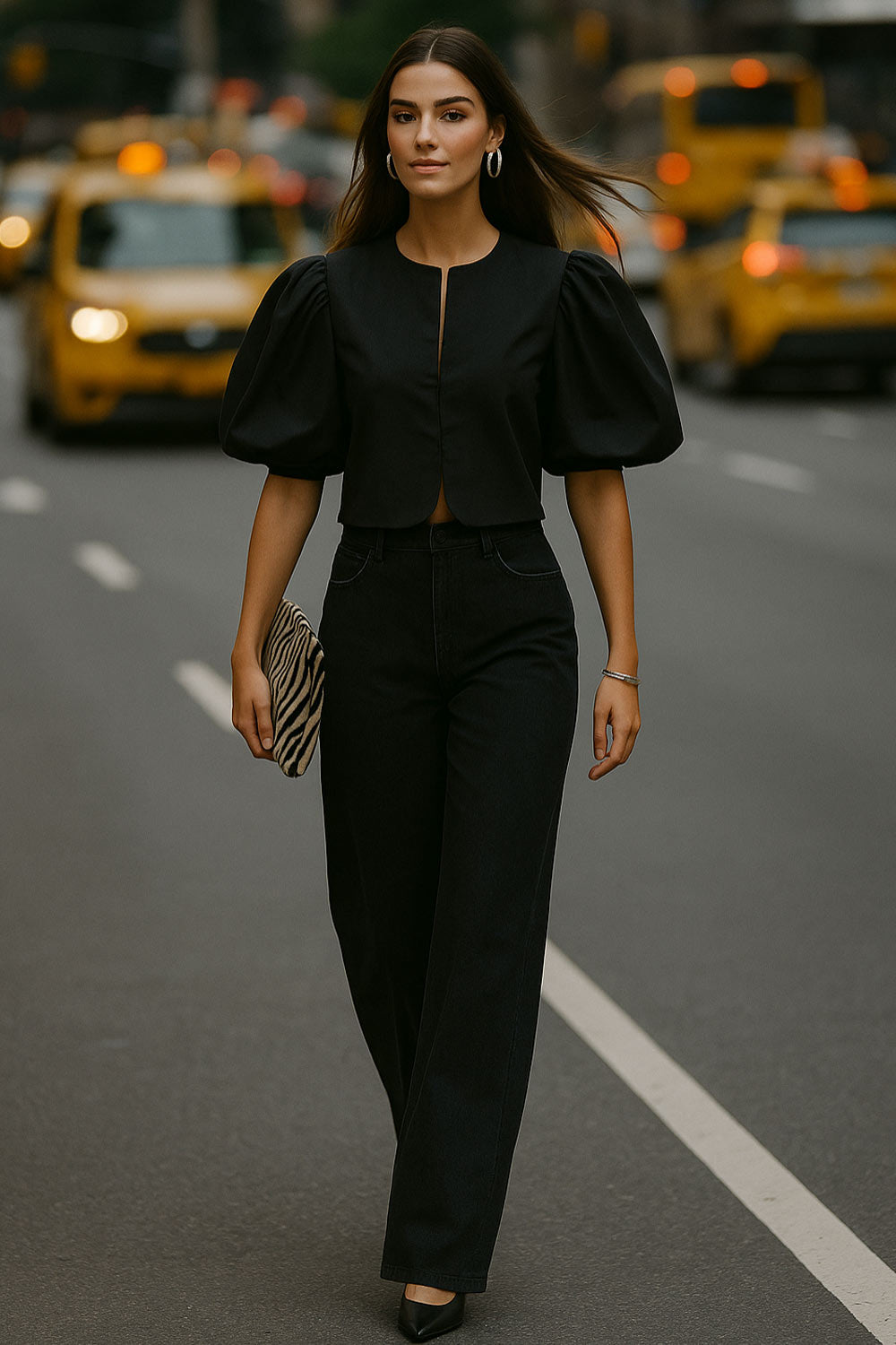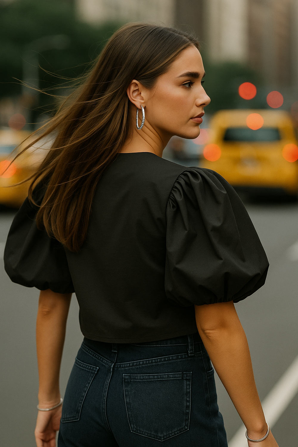 Blusa corta de fit recto, cuello redondo, manga corta amplia globo con volumen en borde, cierre frontal con broches ocultos y bajo curveado frontal.