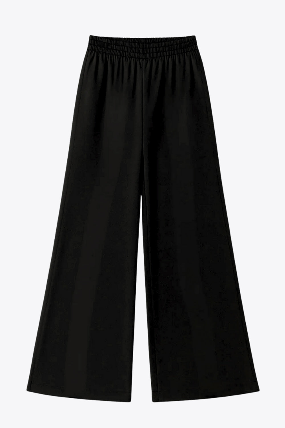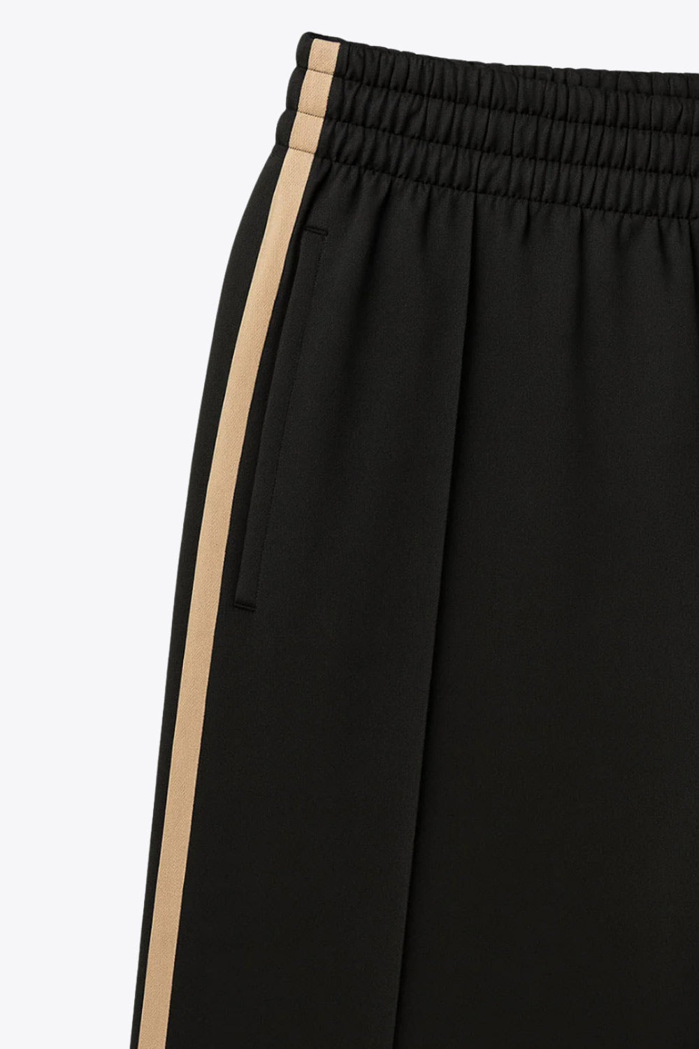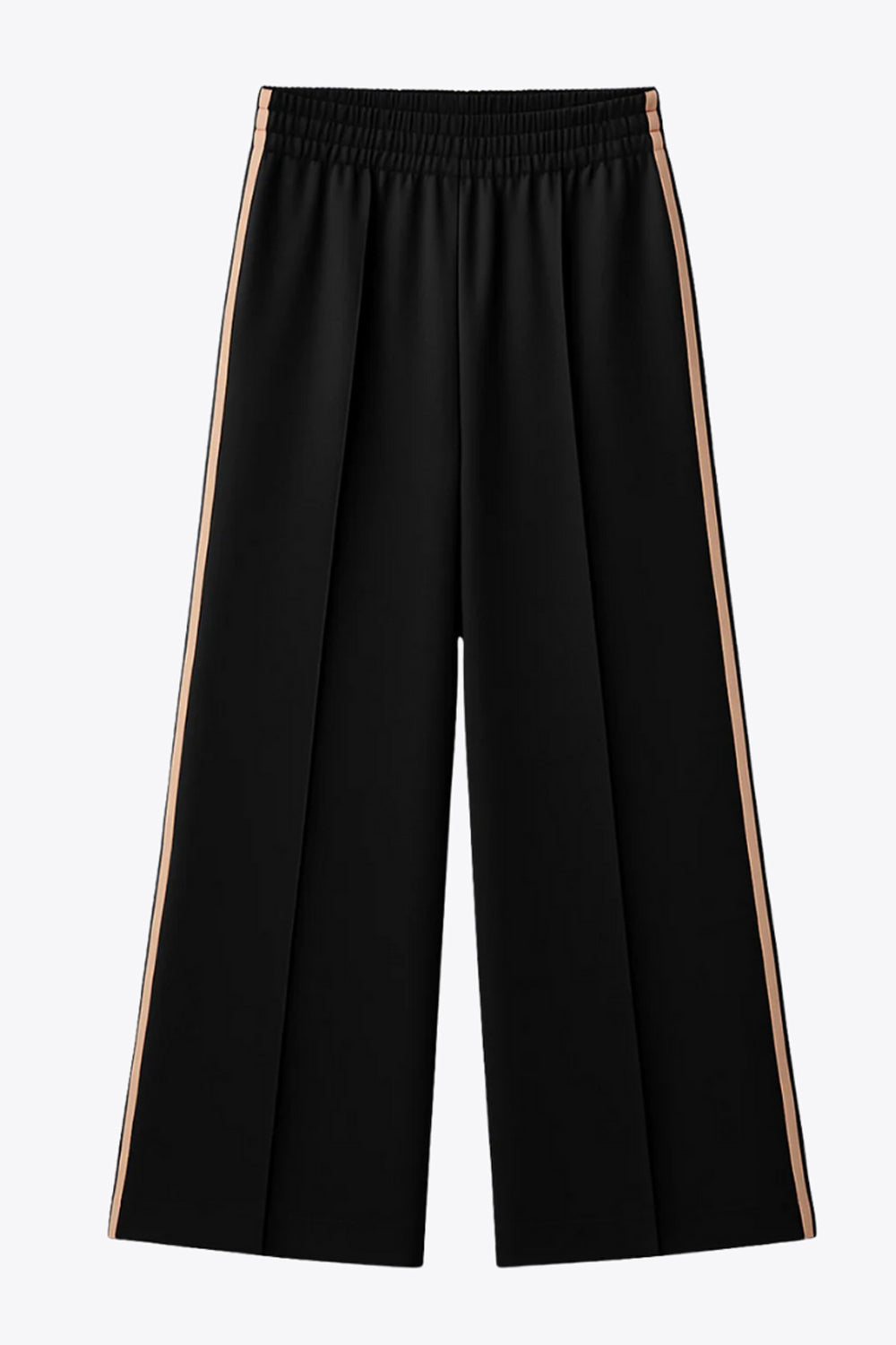 Pantalón fluido de fit recto, cintura media con pretina elástica, bolsillos delanteros, costura frontal y raya lateral decorativa en contraste.
